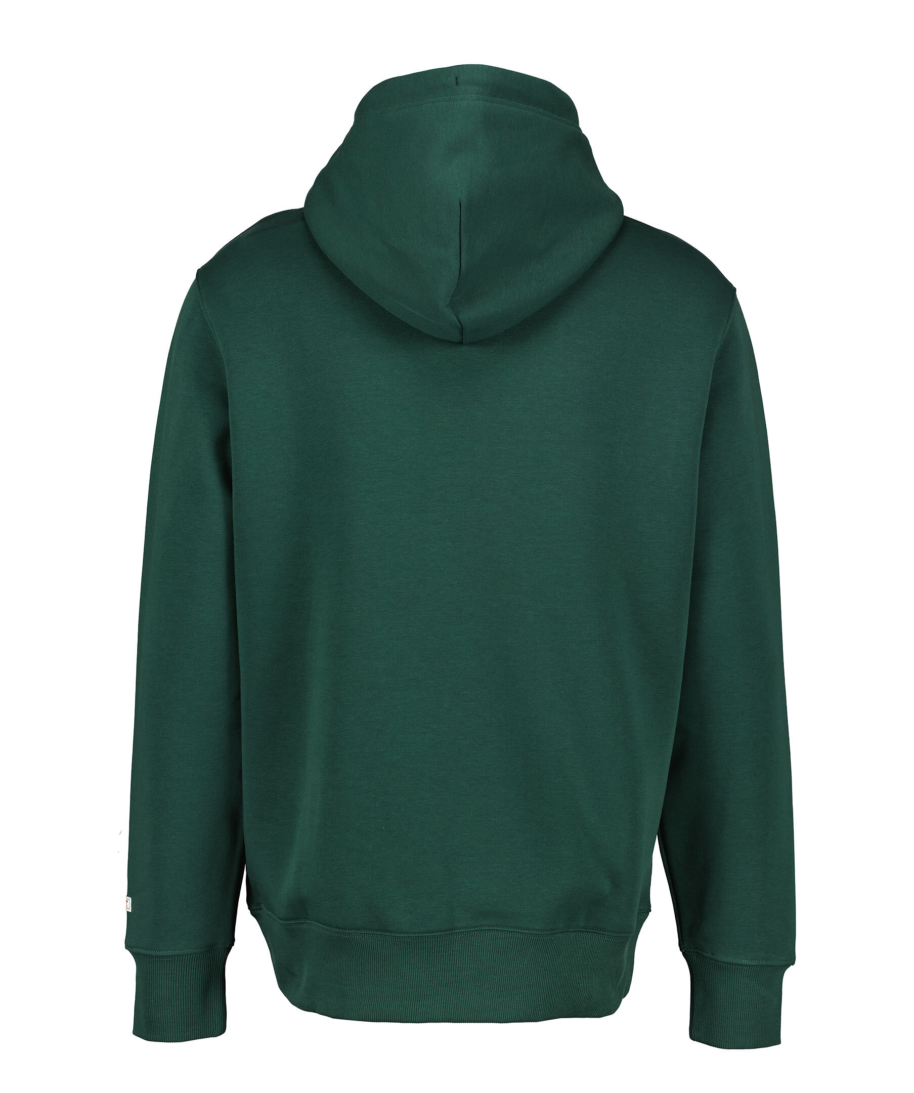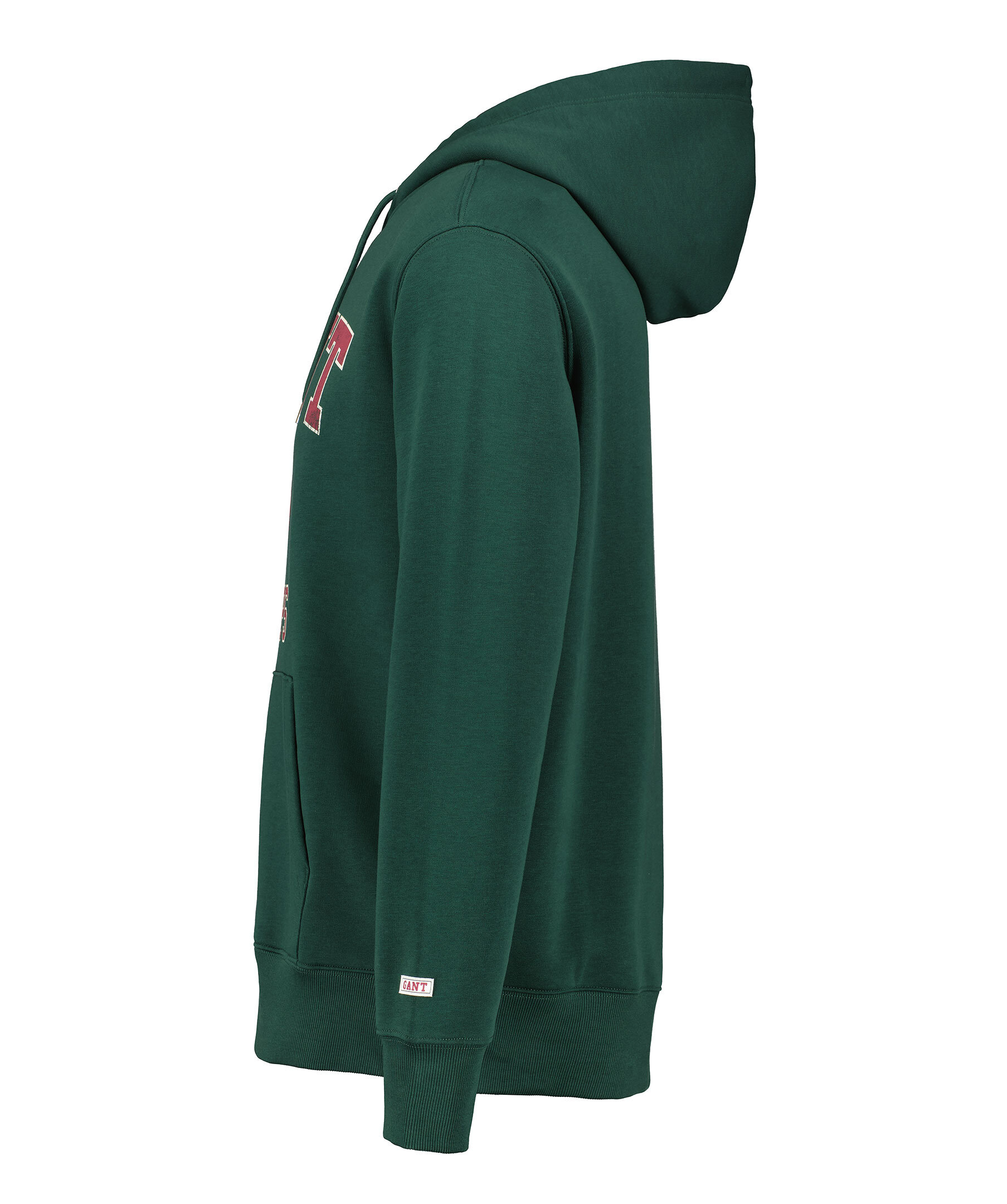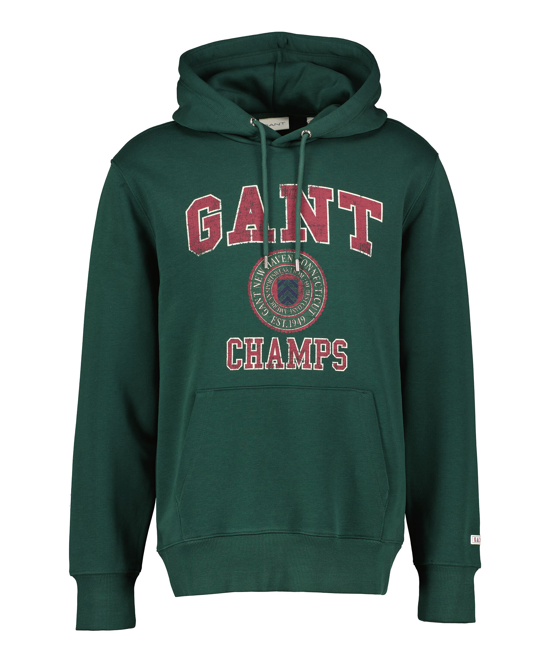 Mörkgrön hoodie från Gant. Hoodien har dragsko i huvan, ribbstickade muddar vid ärm- och plaggslut, känguruficka på magen samt stort Gant-tryck på framsidan. Tillverkad i en bomullsblandning.