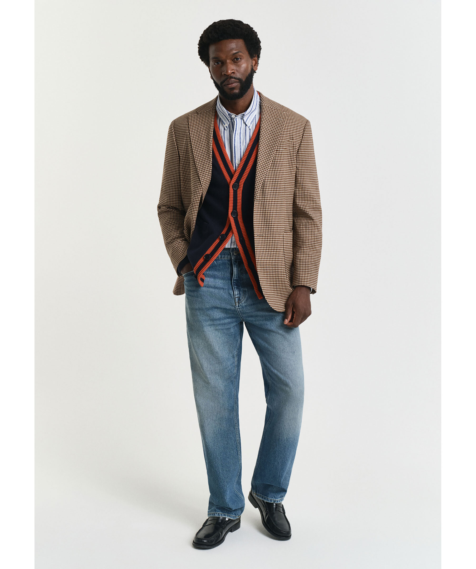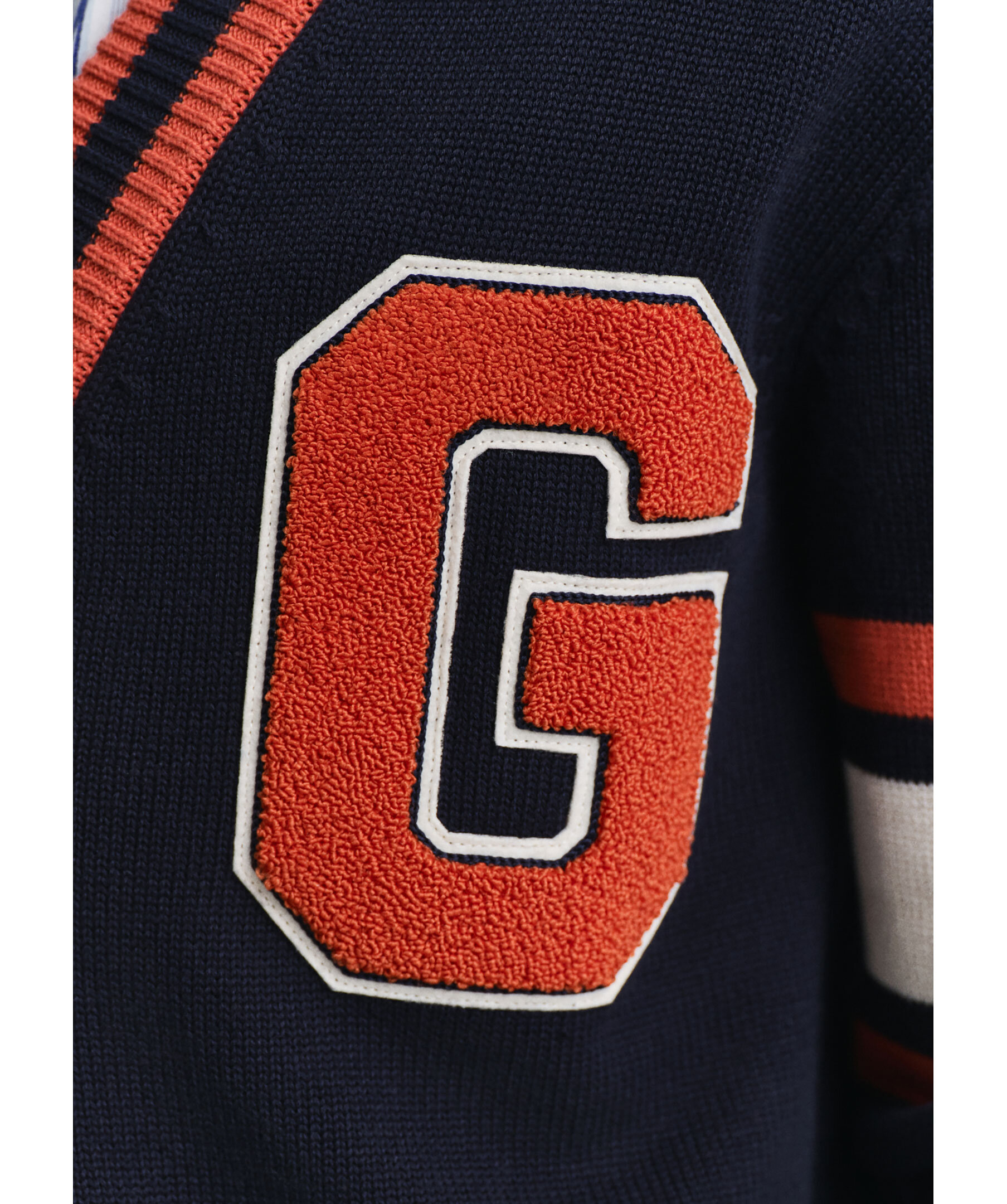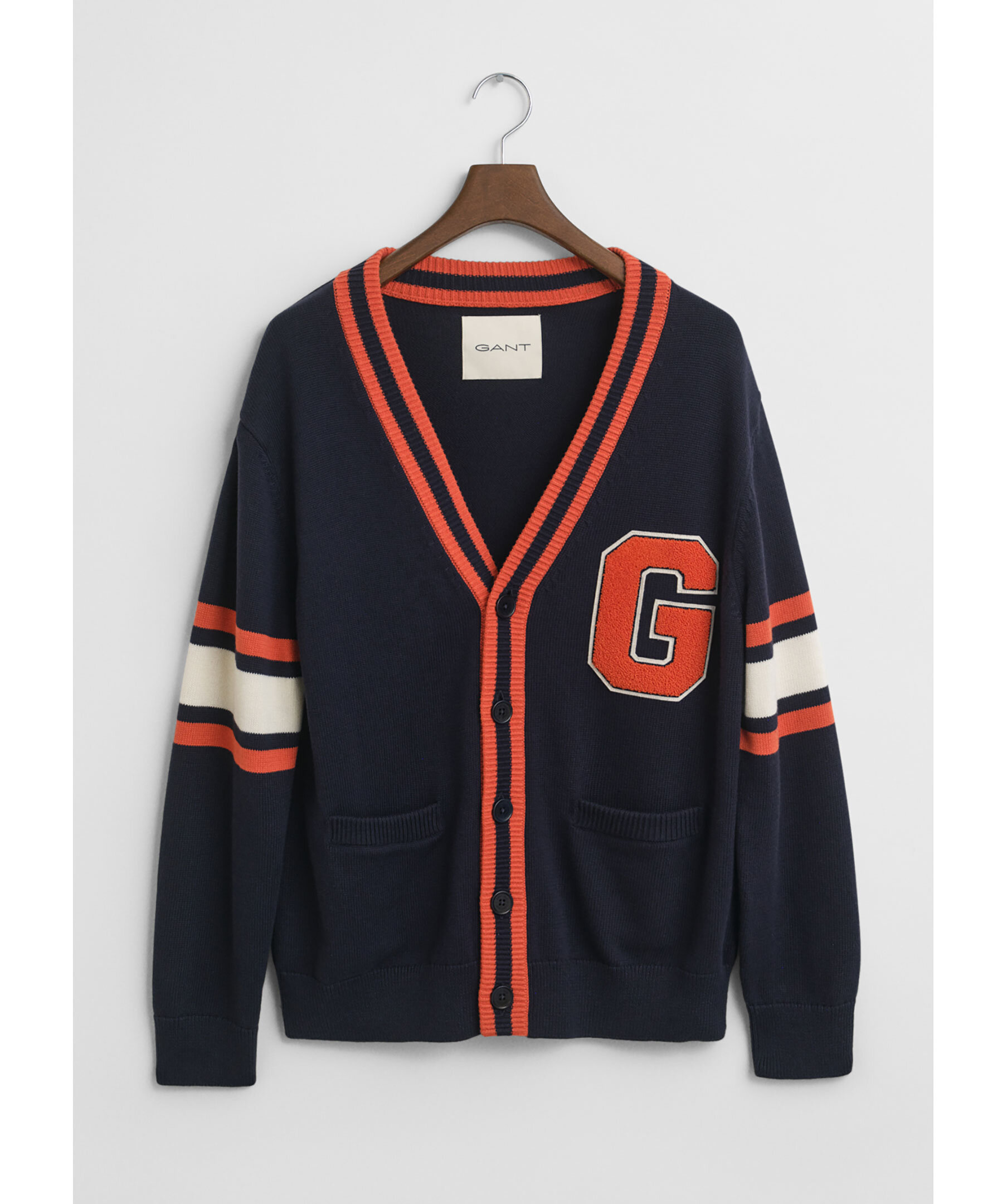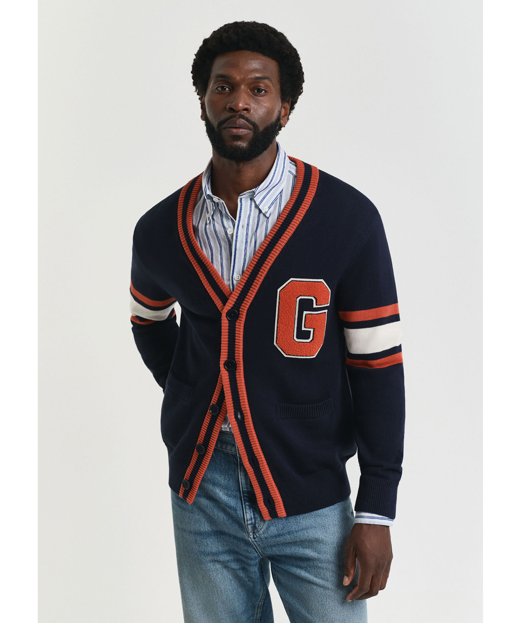 Mörkblå, slätstickad cardigan från Gant. Koftan är v-ringad och har kontrastfärgade ränder samt ett stort G-märke i frotté på bröstet. Tillverkad i bomull.