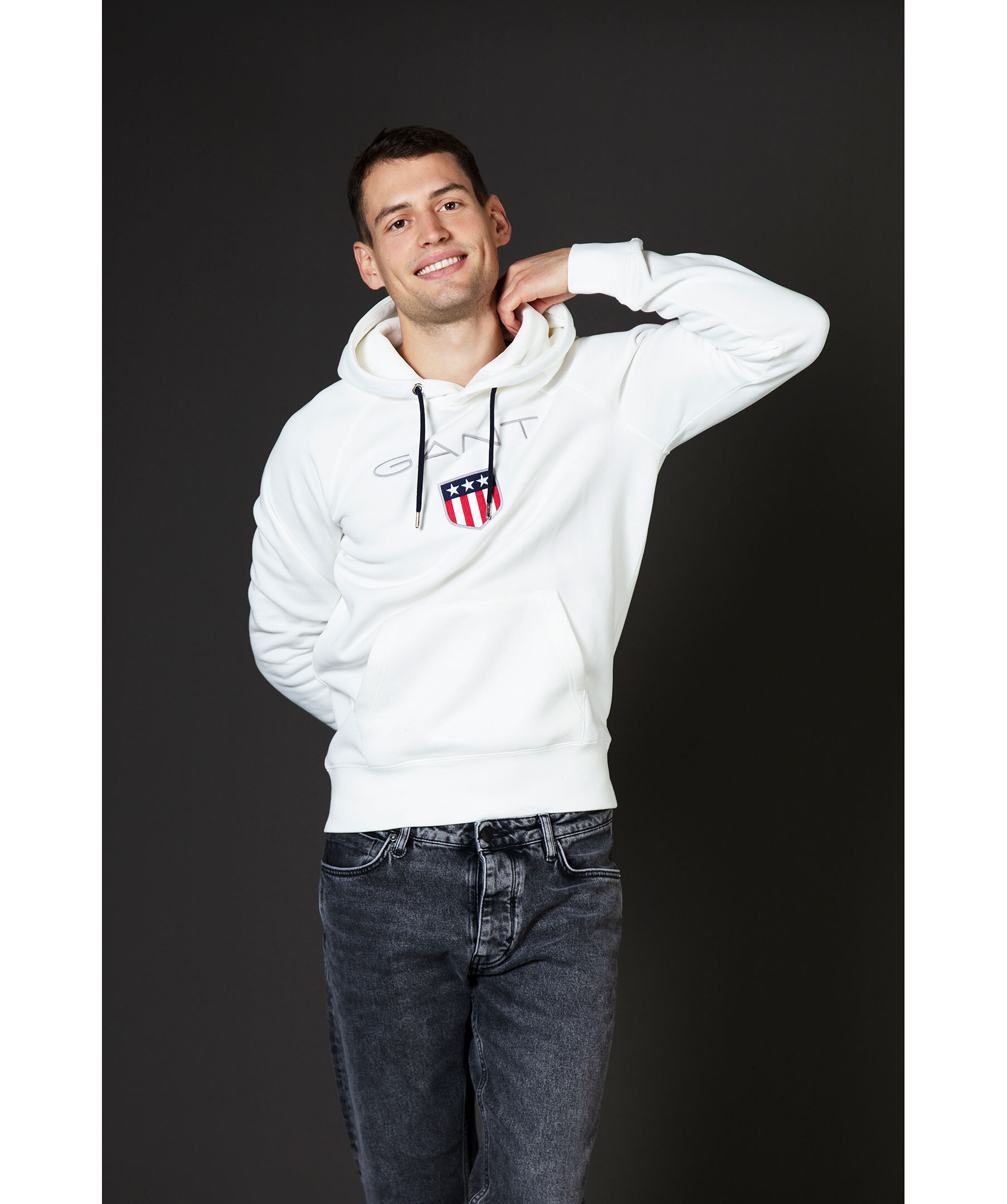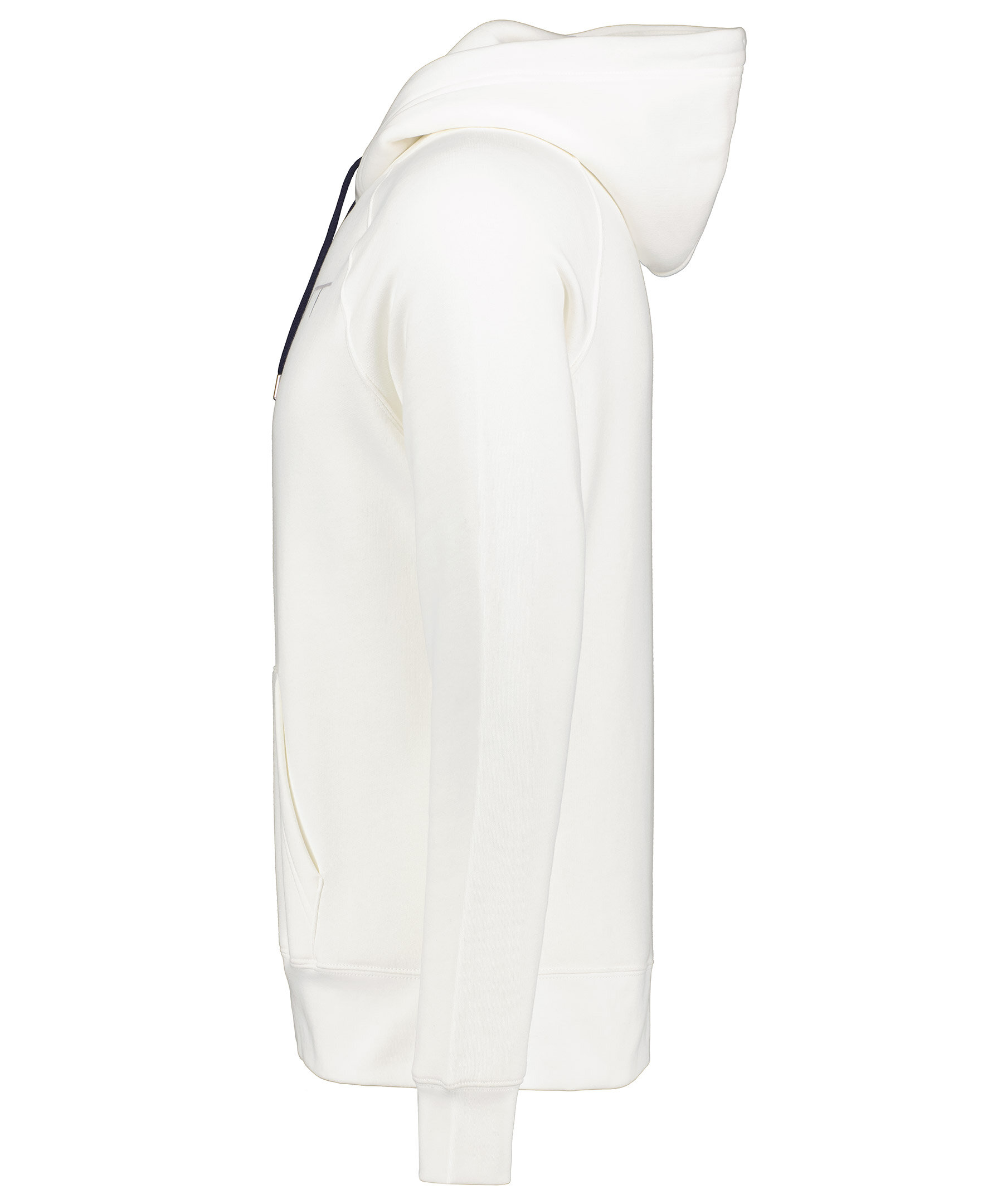 Vit hoodie från Gant. Huva med dragsko, ribbstickade muddar vid ärmslut och nedtill. Normal passform. Stor broderad logga på bröstet. Känguruficka på magen.