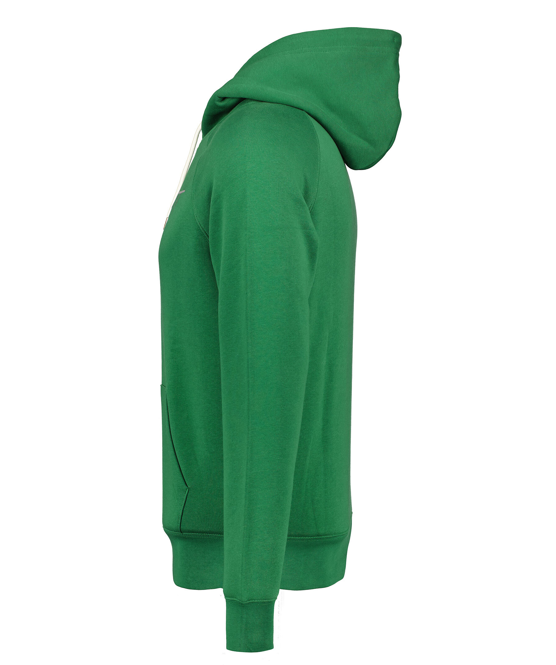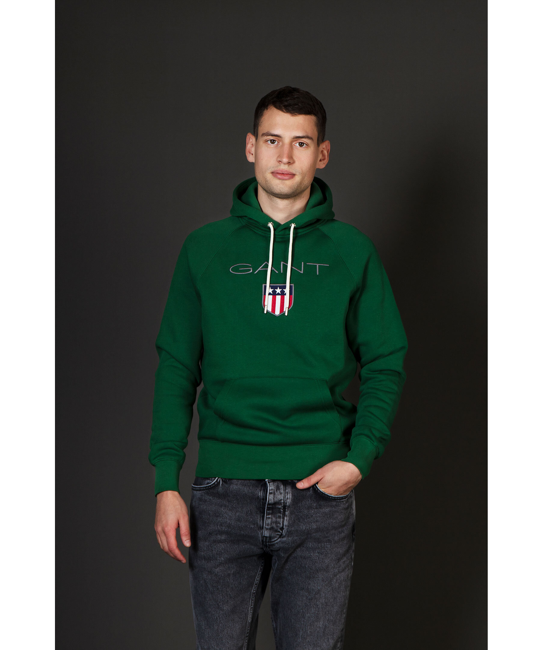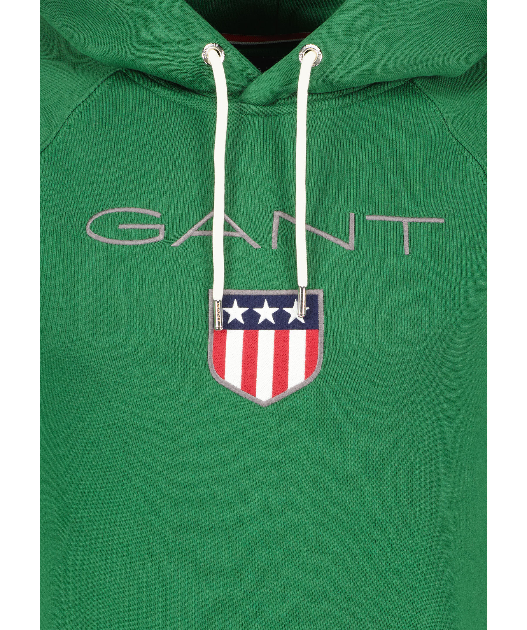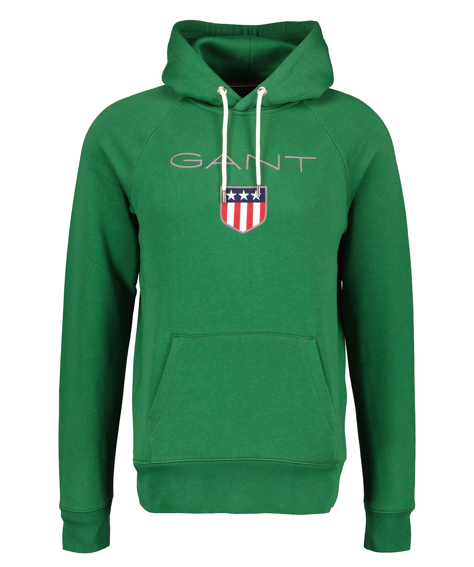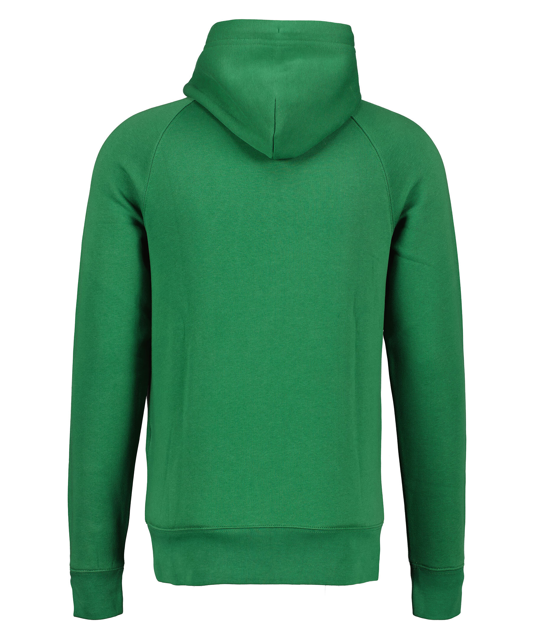Grön hoodie från Gant. Luva med vit snörning, ribbstickade muddar vid ärmslut och nedtill. Normal passform. Stor broderad logga på bröstet och känguruficka på magen.