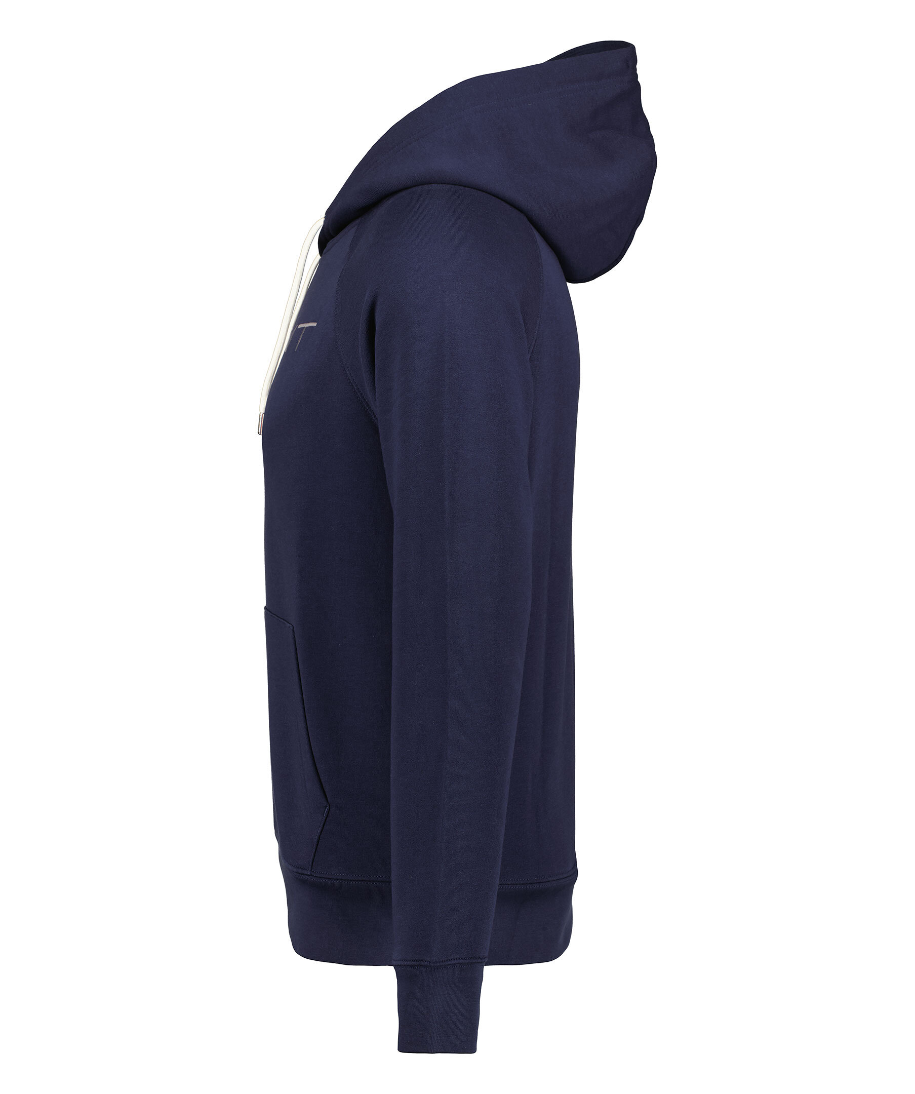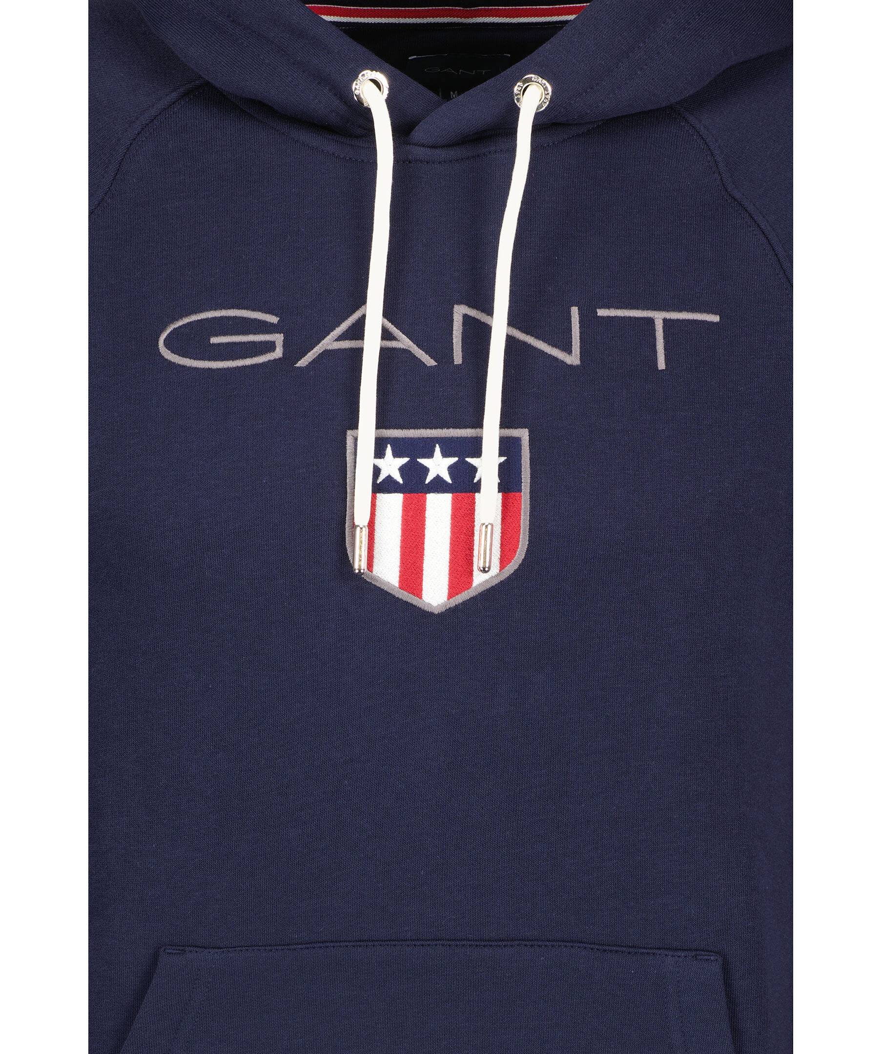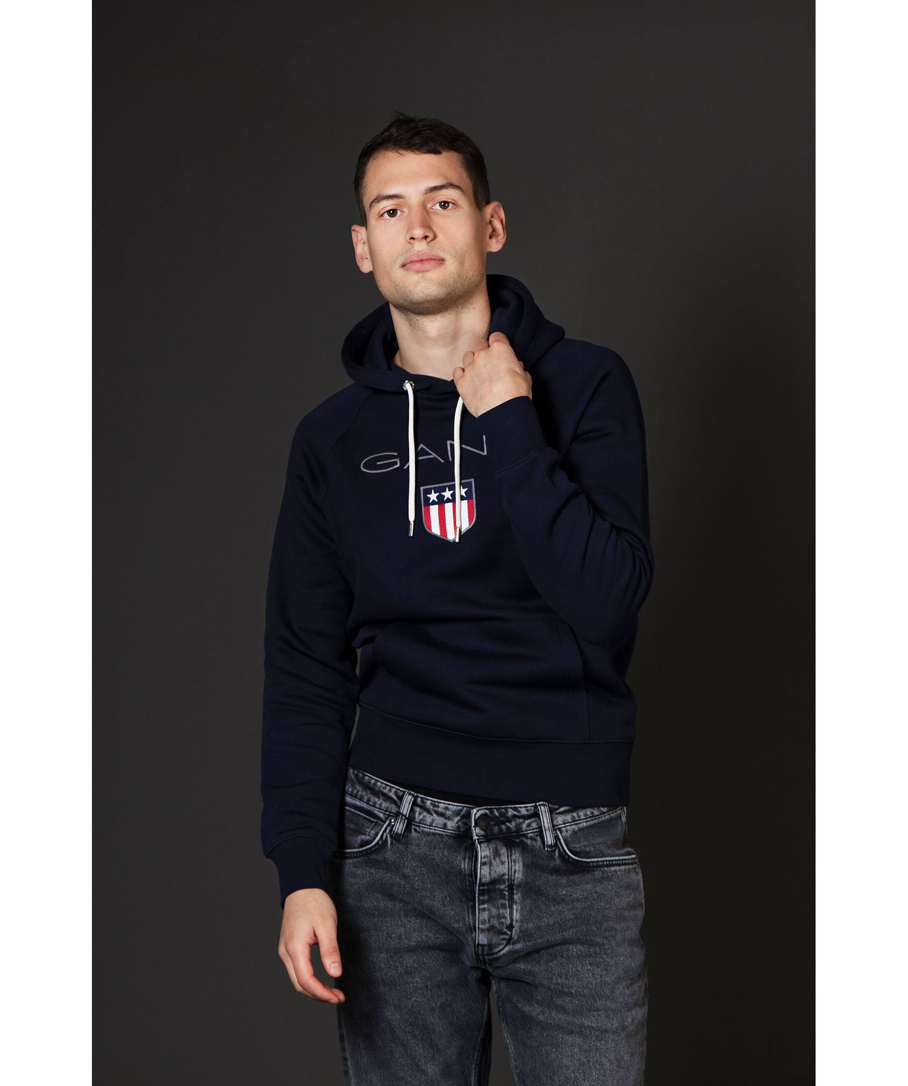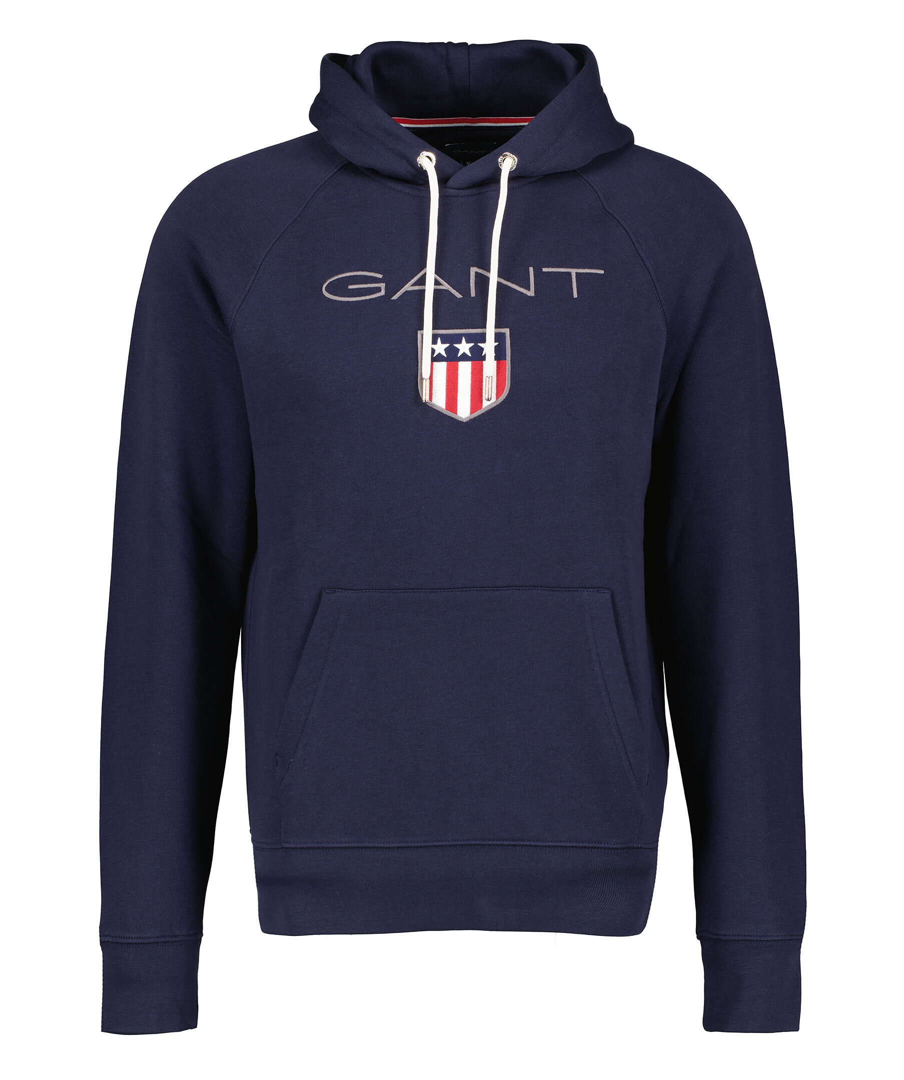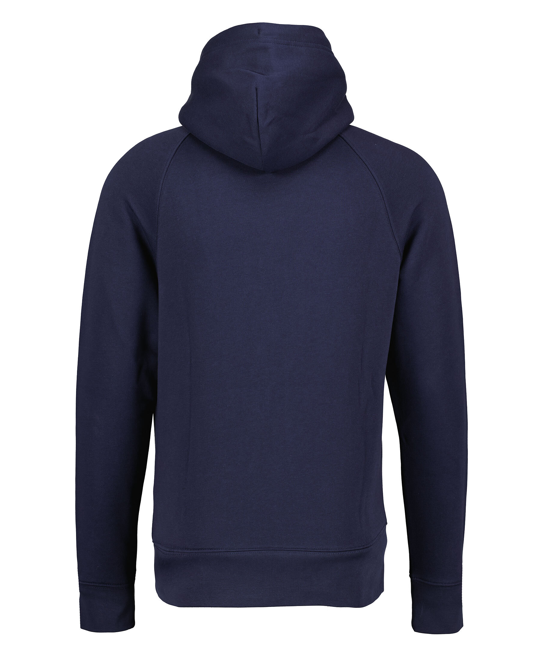Marinblå hoodie från Gant. Huva med dragsko, ribbstickade muddar vid ärmslut och nedtill. Normal passform. Stor broderad logga på bröstet. Känguruficka på magen.