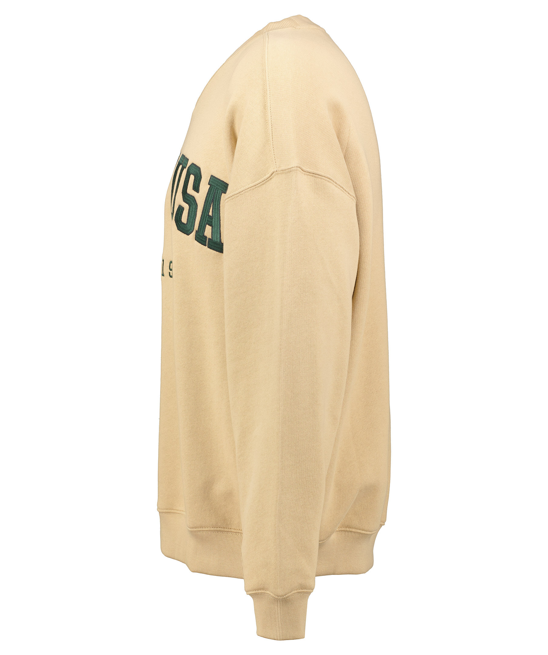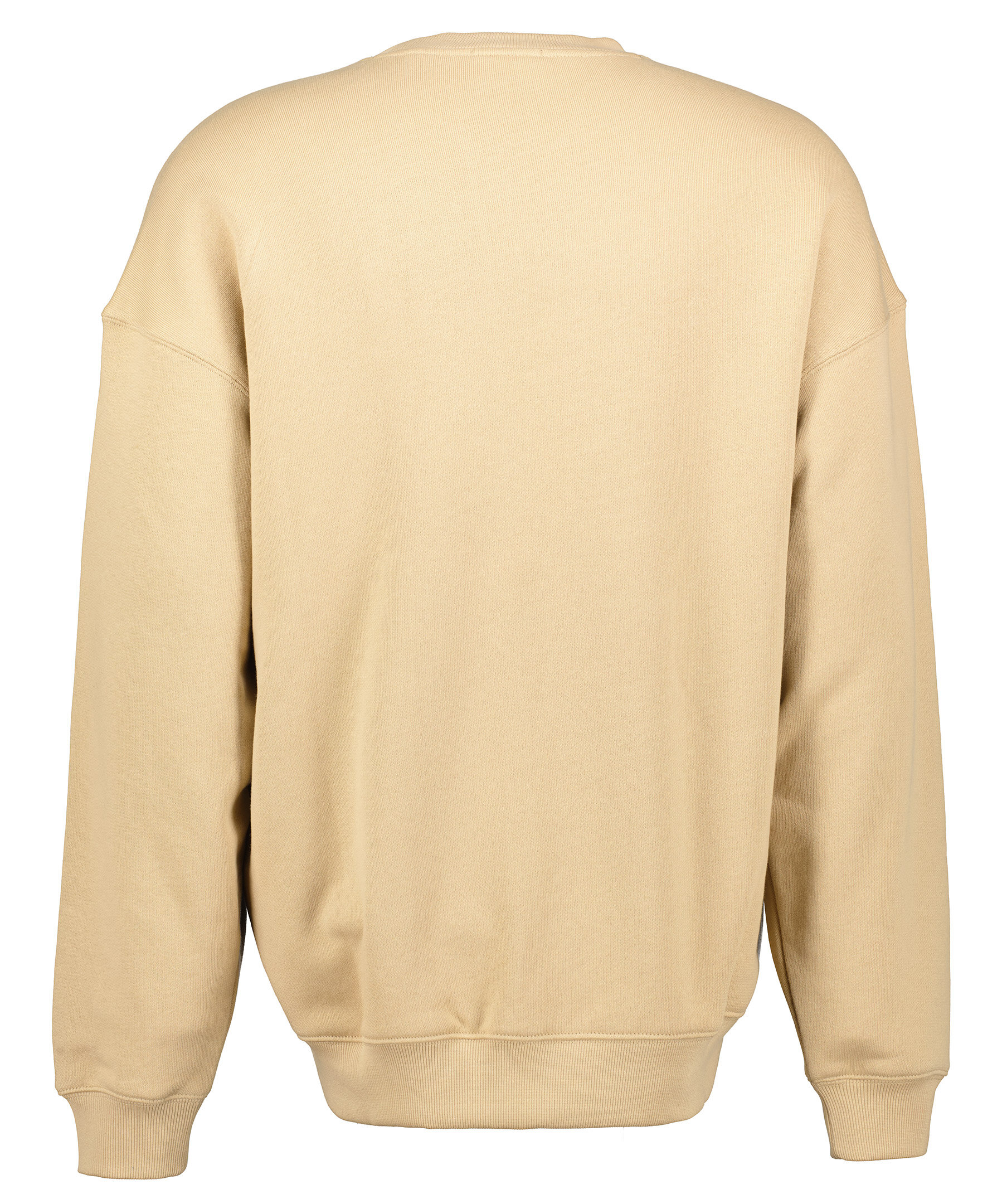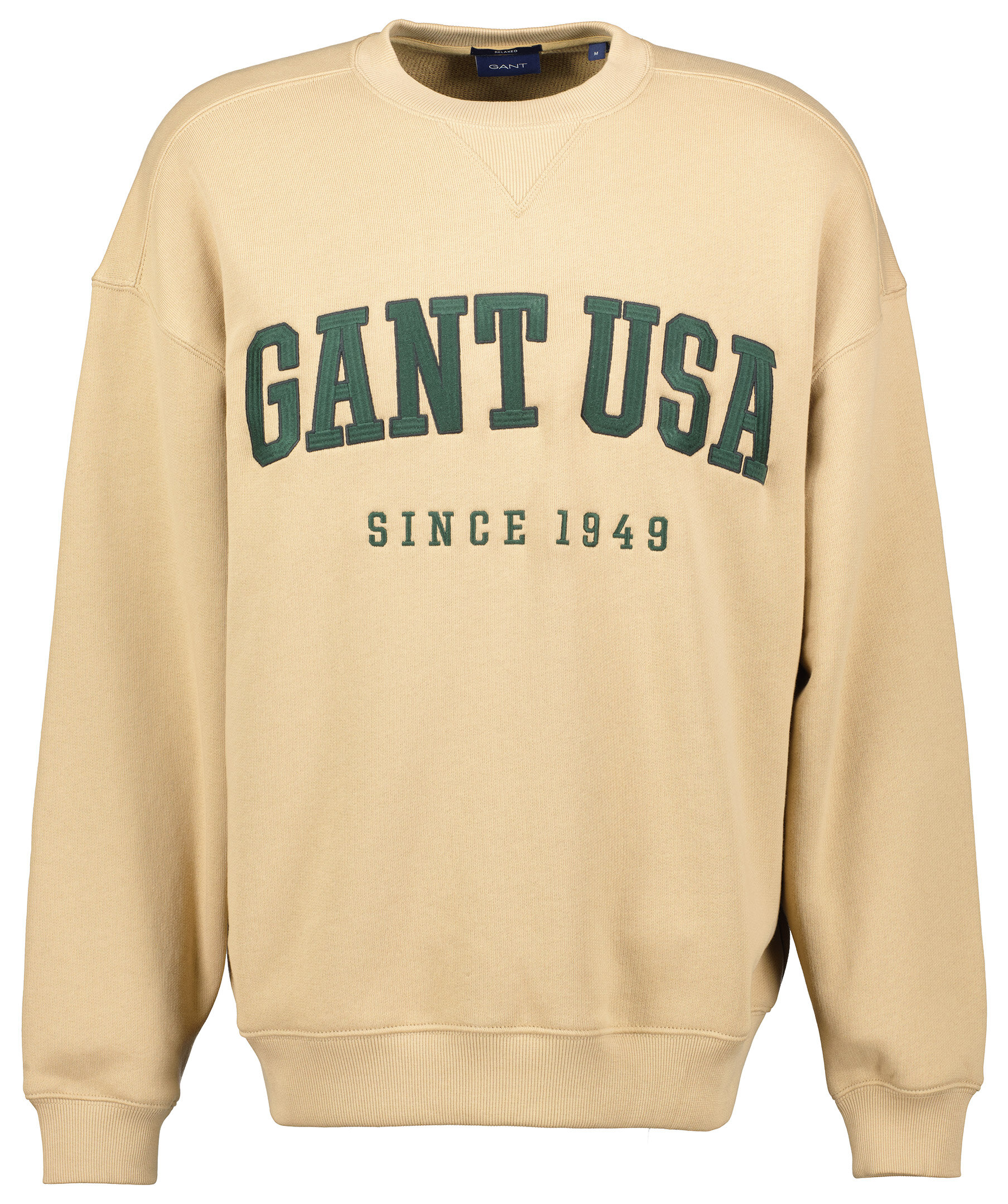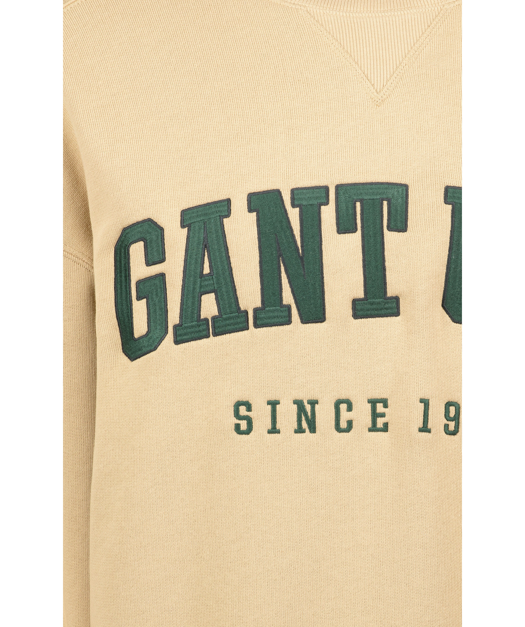 Beige oversized collegetröja från Gant. Grön och svart broderad logotyp över bröstet. Ribbstickade muddar vid ärm-, plaggslut och halsringningen. Tillverkad i 100% Bomull.