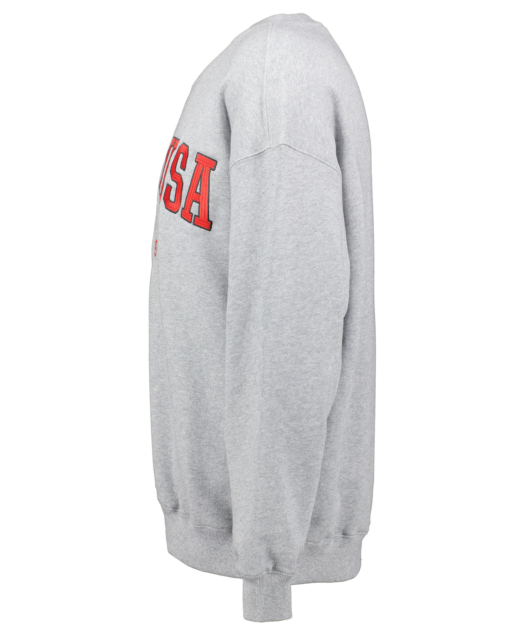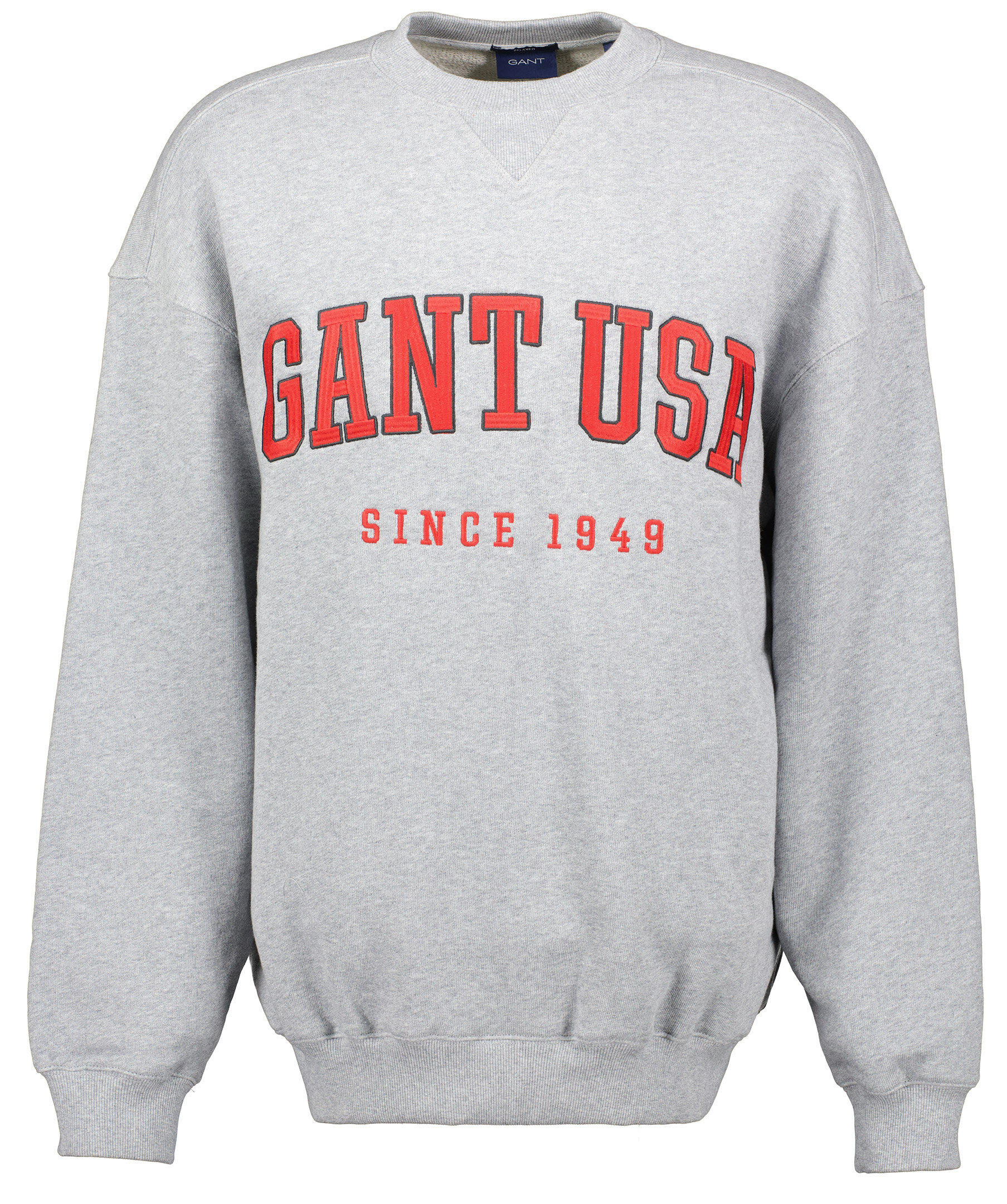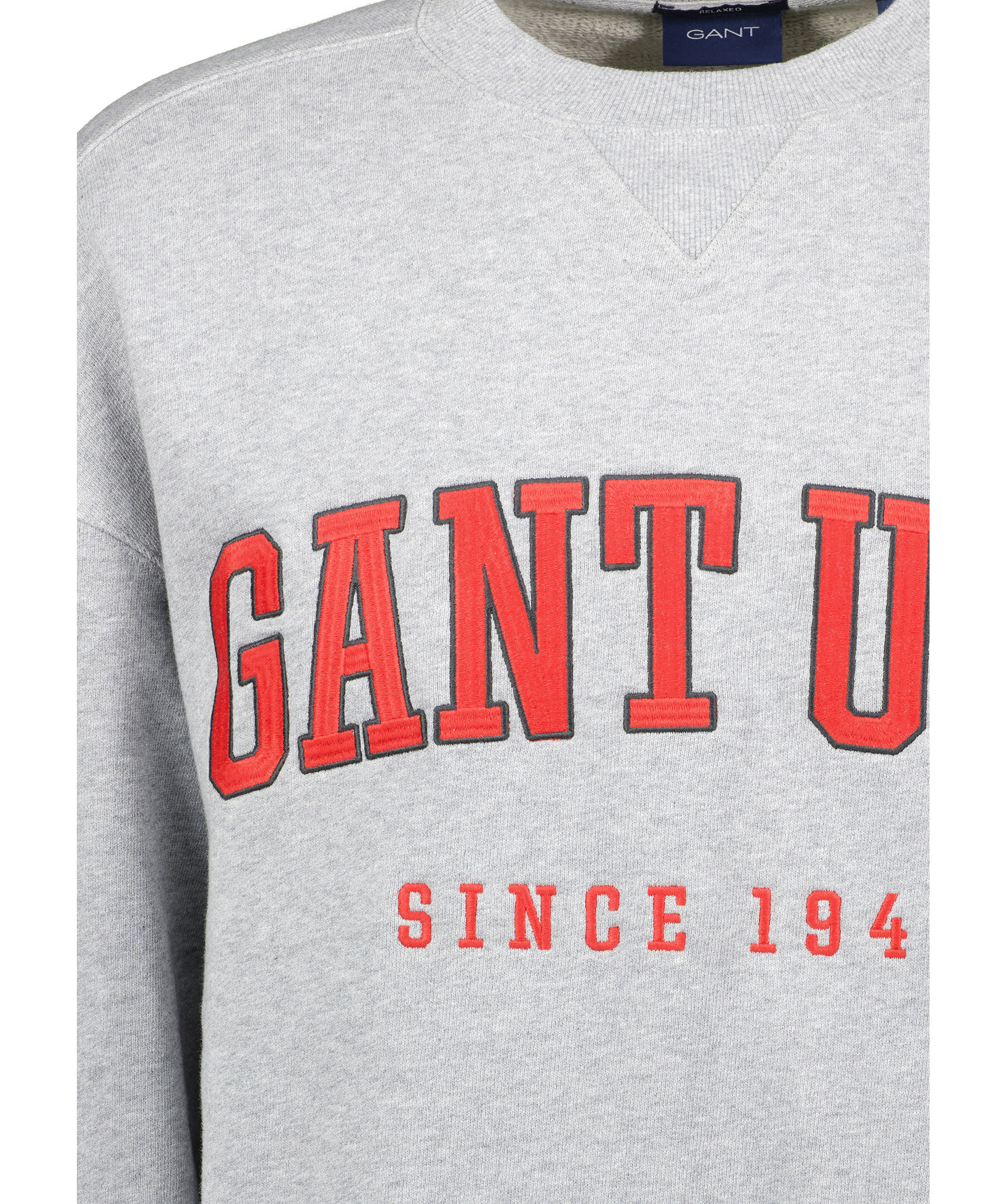 Grå melerad oversized collegetröja från Gant. Röd och svart broderad logotyp över bröstet. Ribbstickade muddar vid ärm-, plaggslut och halsringningen. Tillverkad i 100% Bomull.