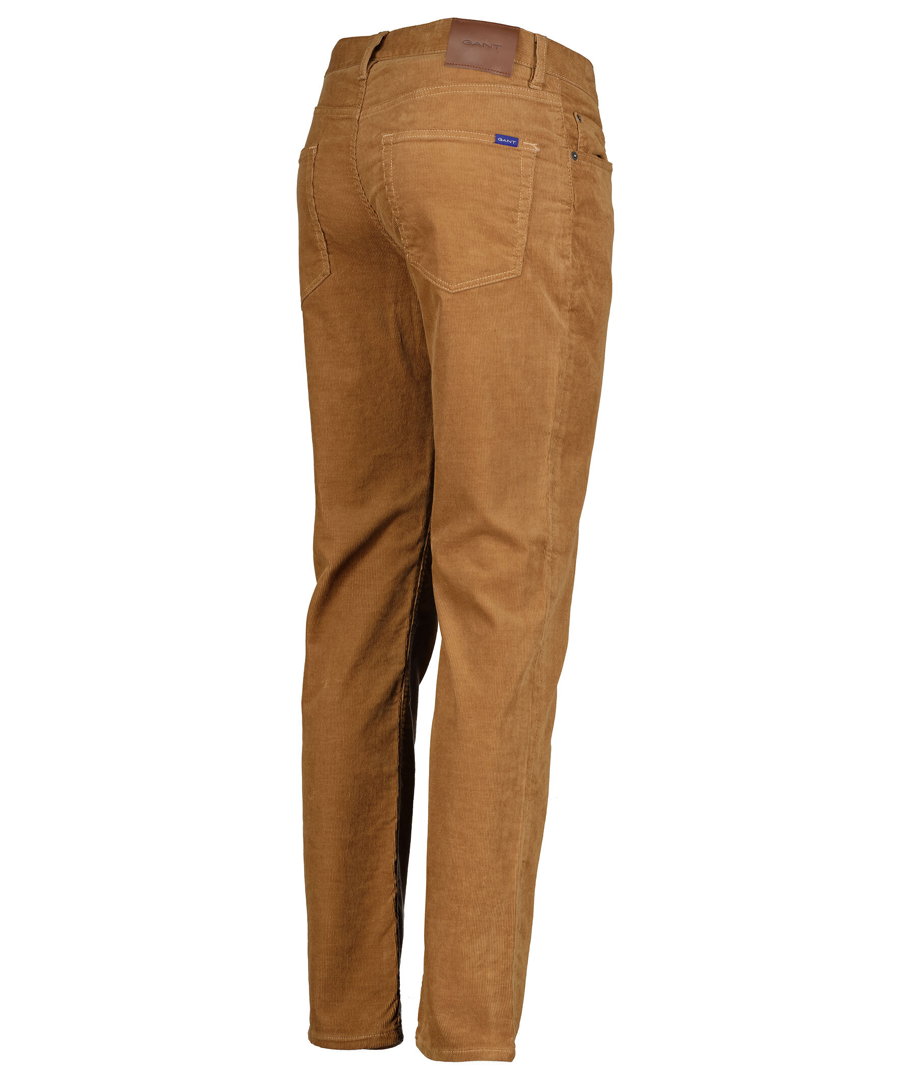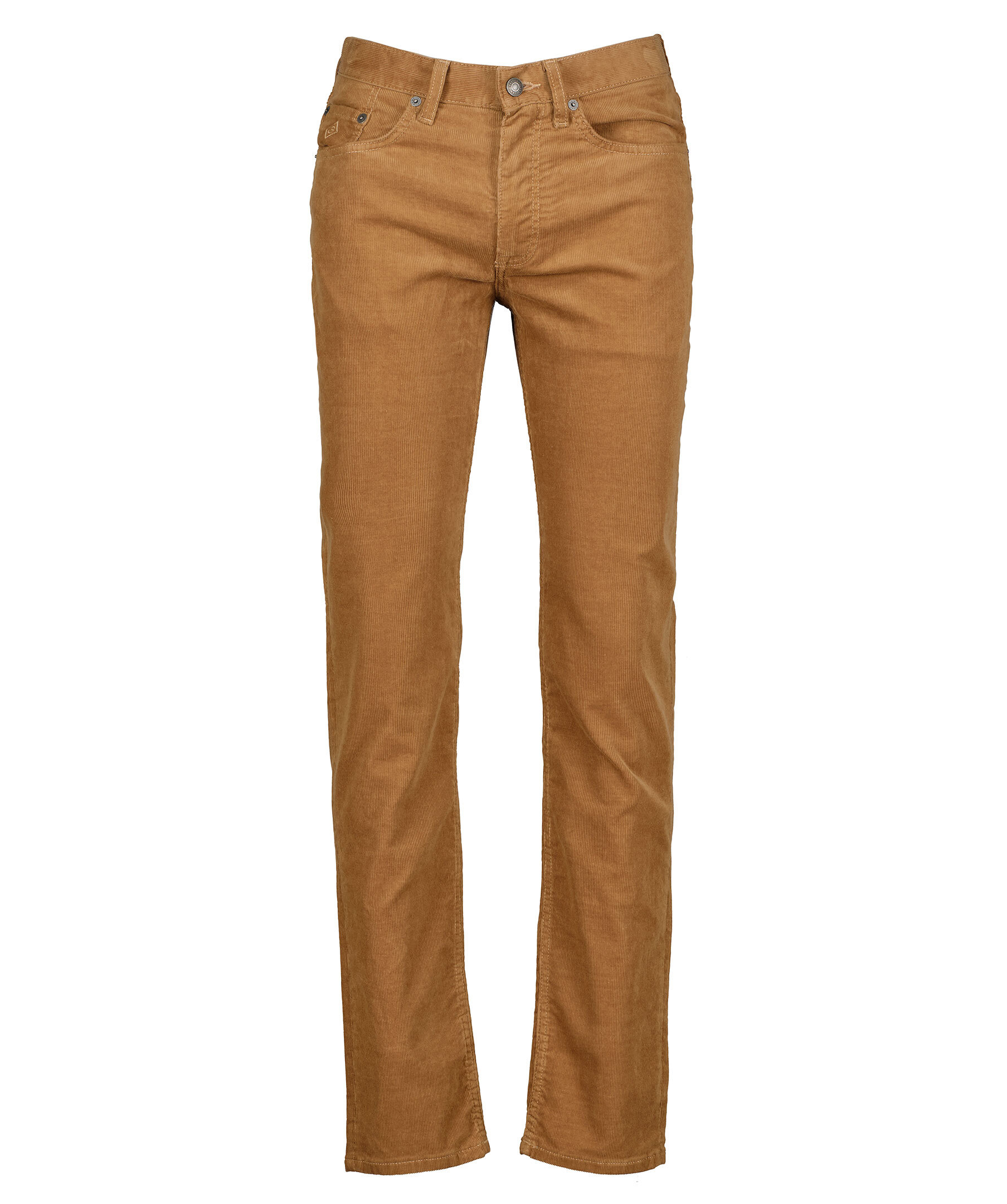 Kamelfärgade jeans i manchester från Gant. Jeansen har en smal passform och tillverkad i ett mellantjockt manchestertyg. Specialfärgade för att ge en lätt använd look. Mellanhög midja och bekväm stretch. Gant logotyp på läderlappen vid linningen. Innerbenslängden är 77cm i storlek 32'32.