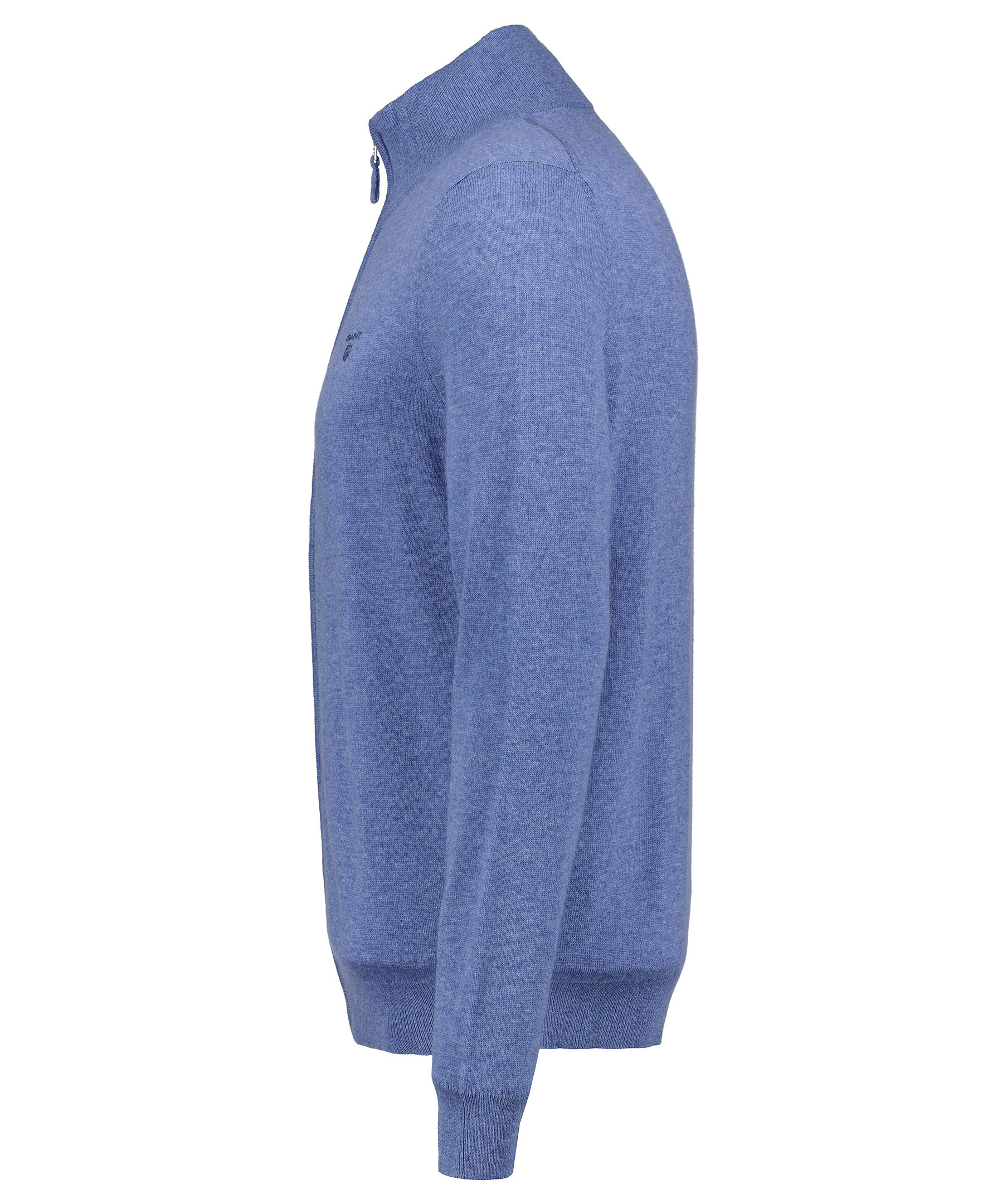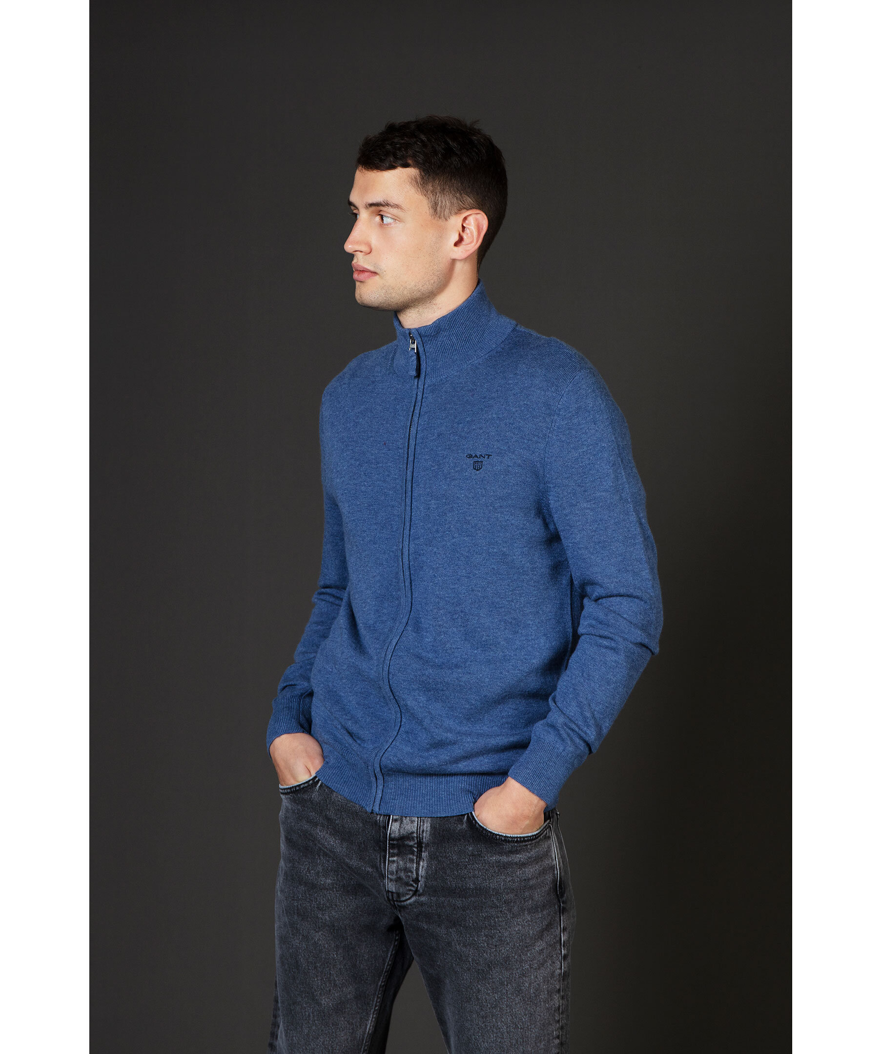 Blå finstickad cardigan från Gant. Tröjan är gjord i ett tunt superfint lammull. Normal passform, ribbstickade muddar, två framfickor och broderad logotyp på bröstet.