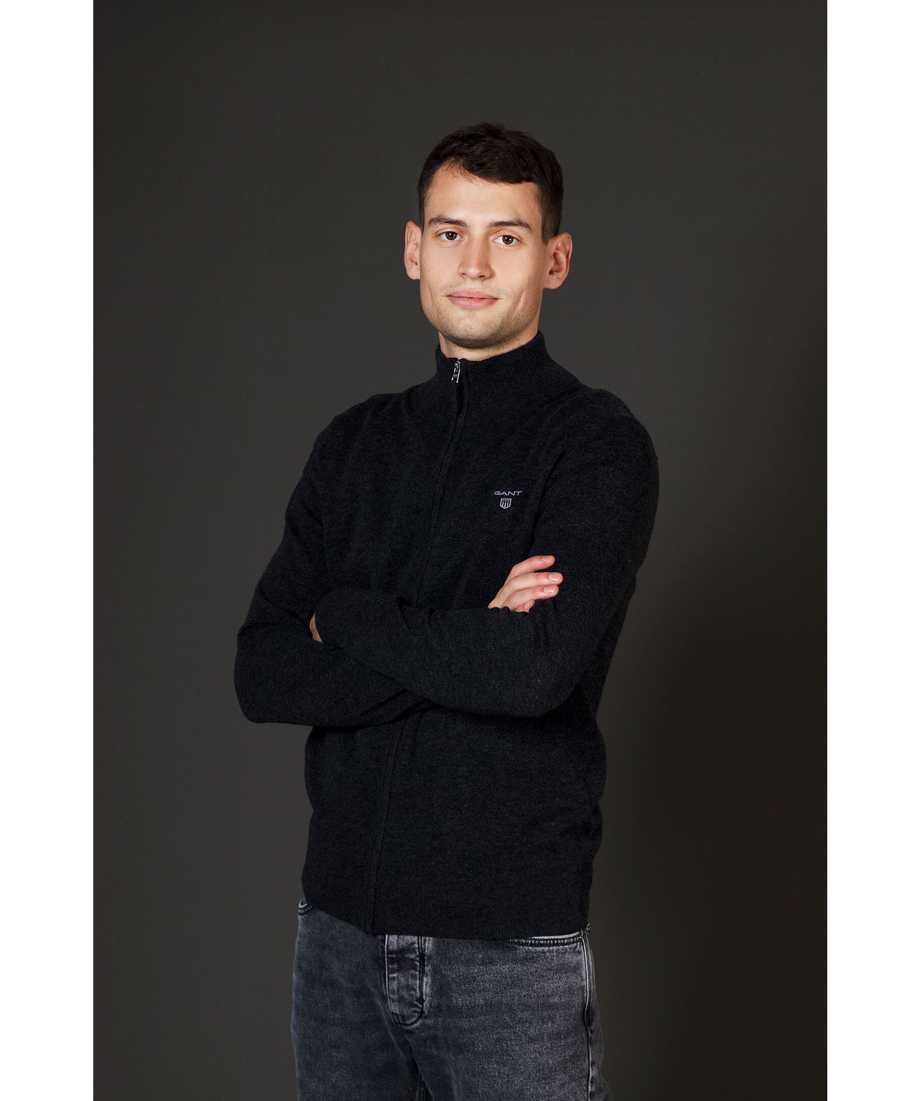 Mörkgrå finstickad cardigan från Gant. Tröjan är gjord i ett tunt superfint lammull. Normal passform, ribbstickade muddar, två framfickor och broderad logotyp på bröstet.