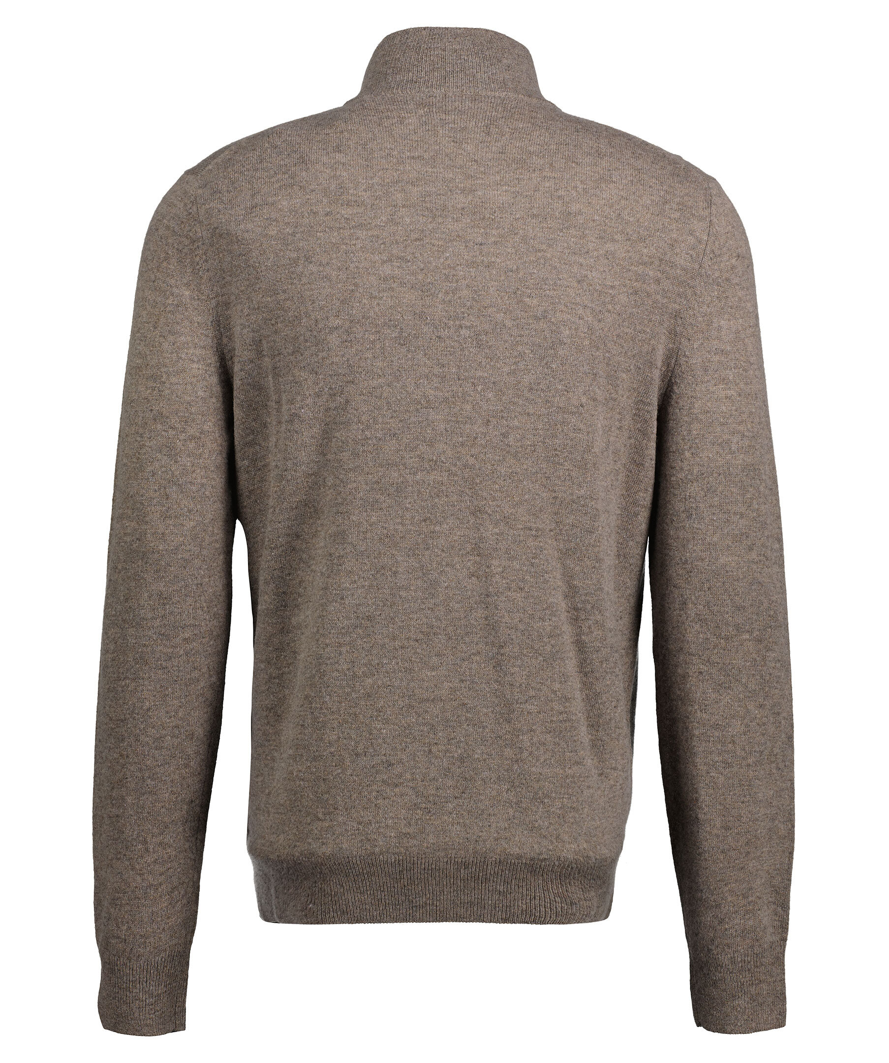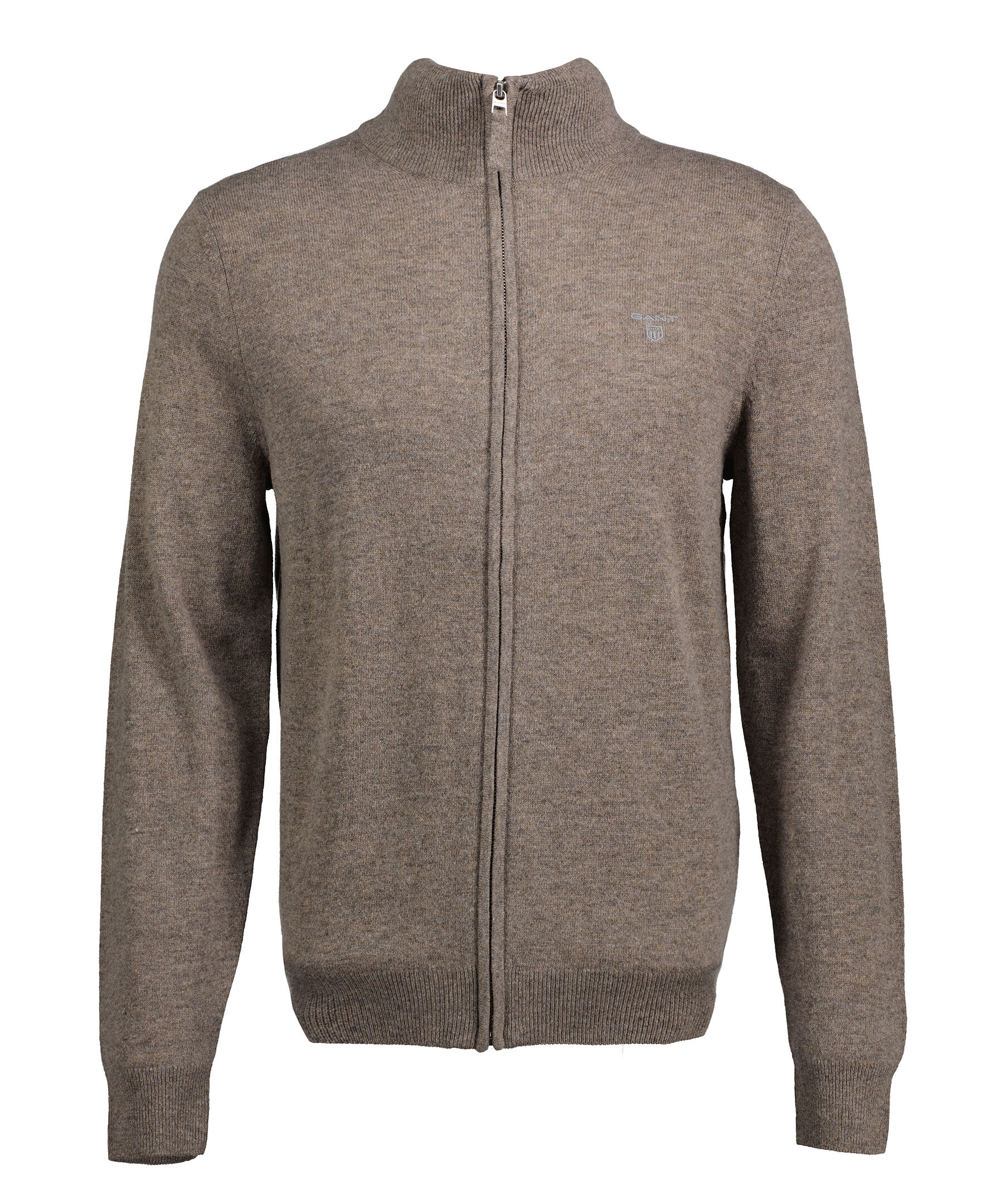 Beigemelerad cardigan med zip från Gant. Ribbstickade muddar i kragen, ärm- och plaggslut. Broderad logga på bröstet. Tillverkad i 100% Lammull.