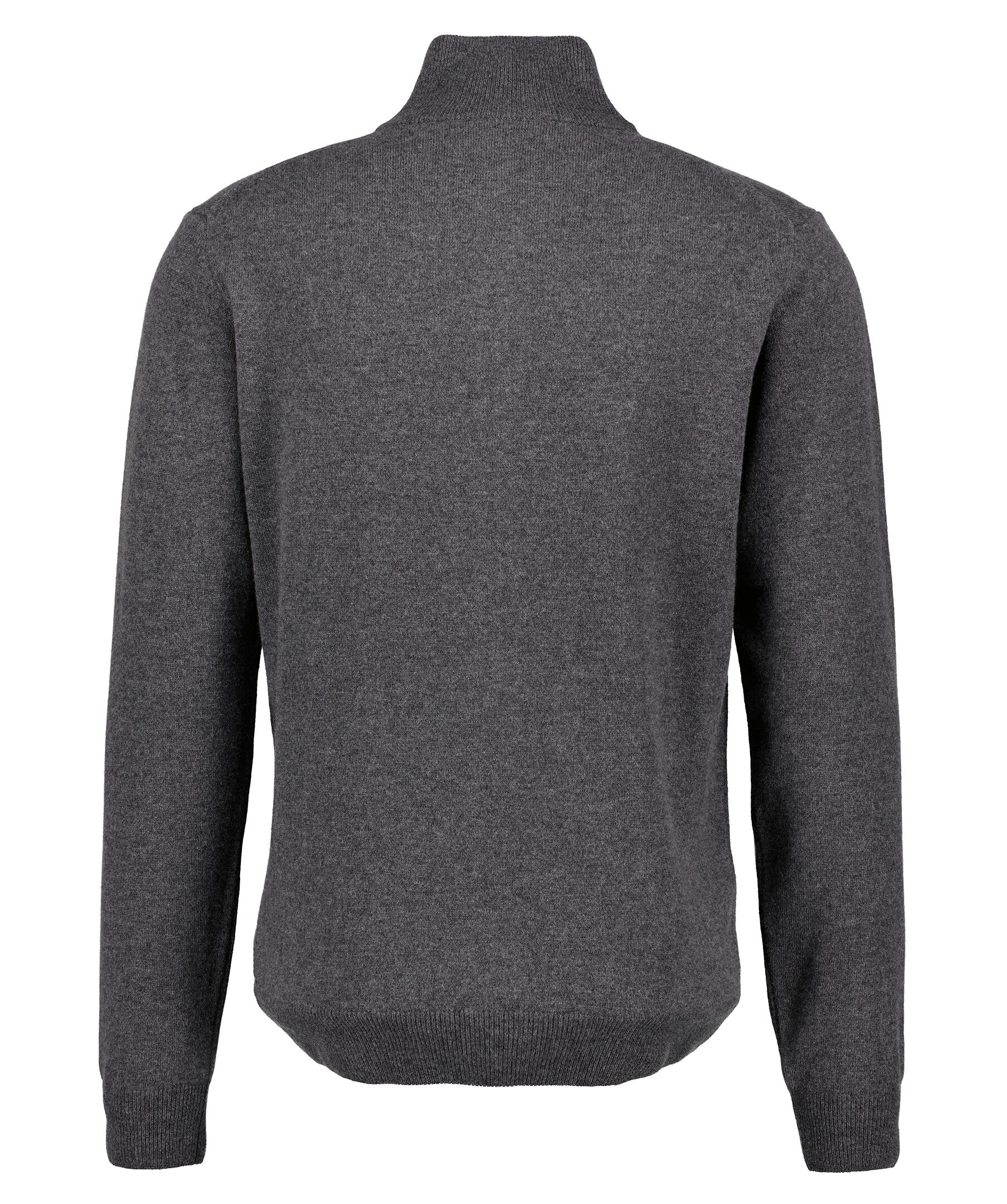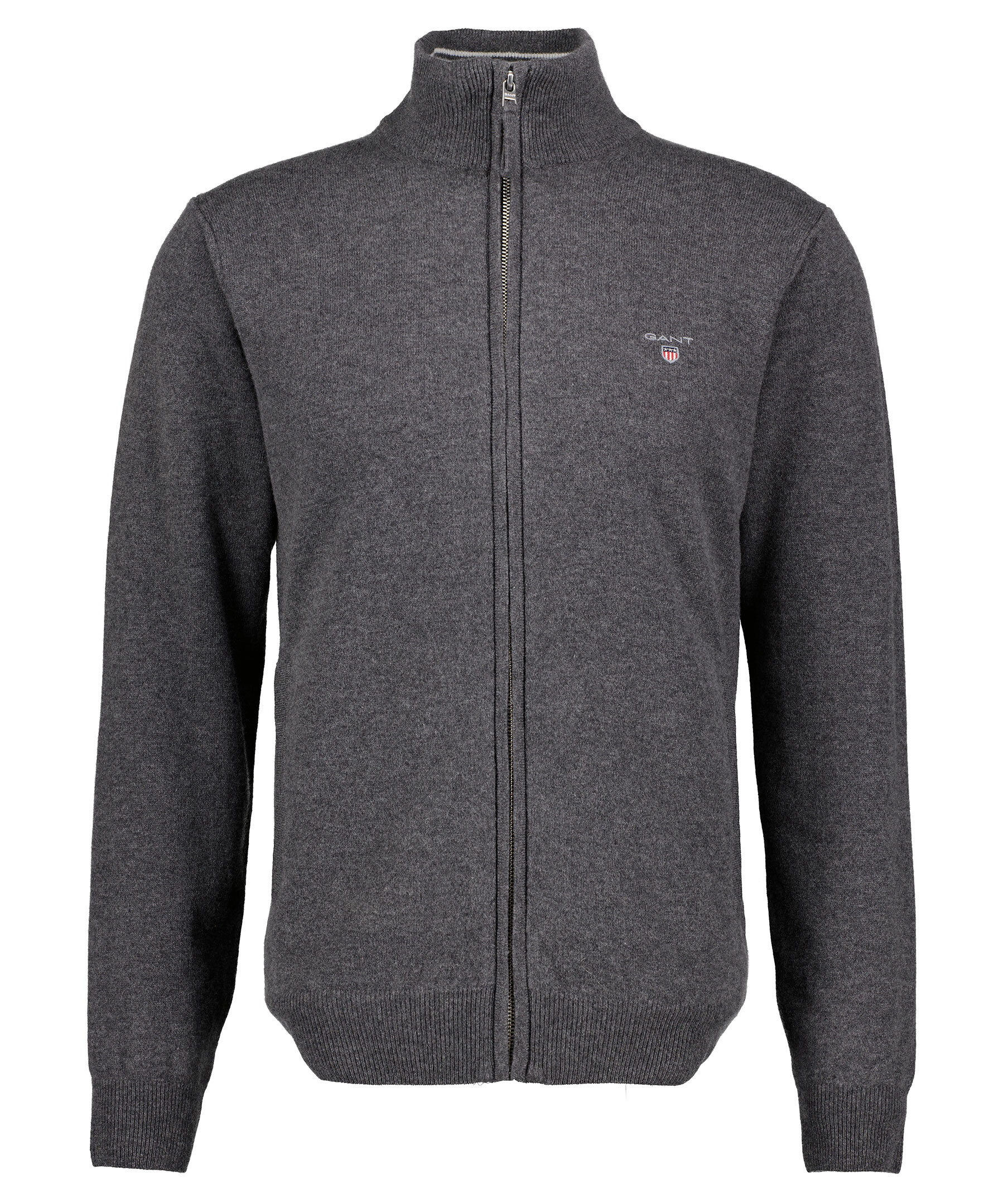Mörkgrå stickad cardigan från Gant. Tröjan är gjord i finstickad ull och stängs med en dragkedja i mitten. Broderad logotyp på bröstet. Ribbstickade muddar vid krage, ärm och plaggslut.