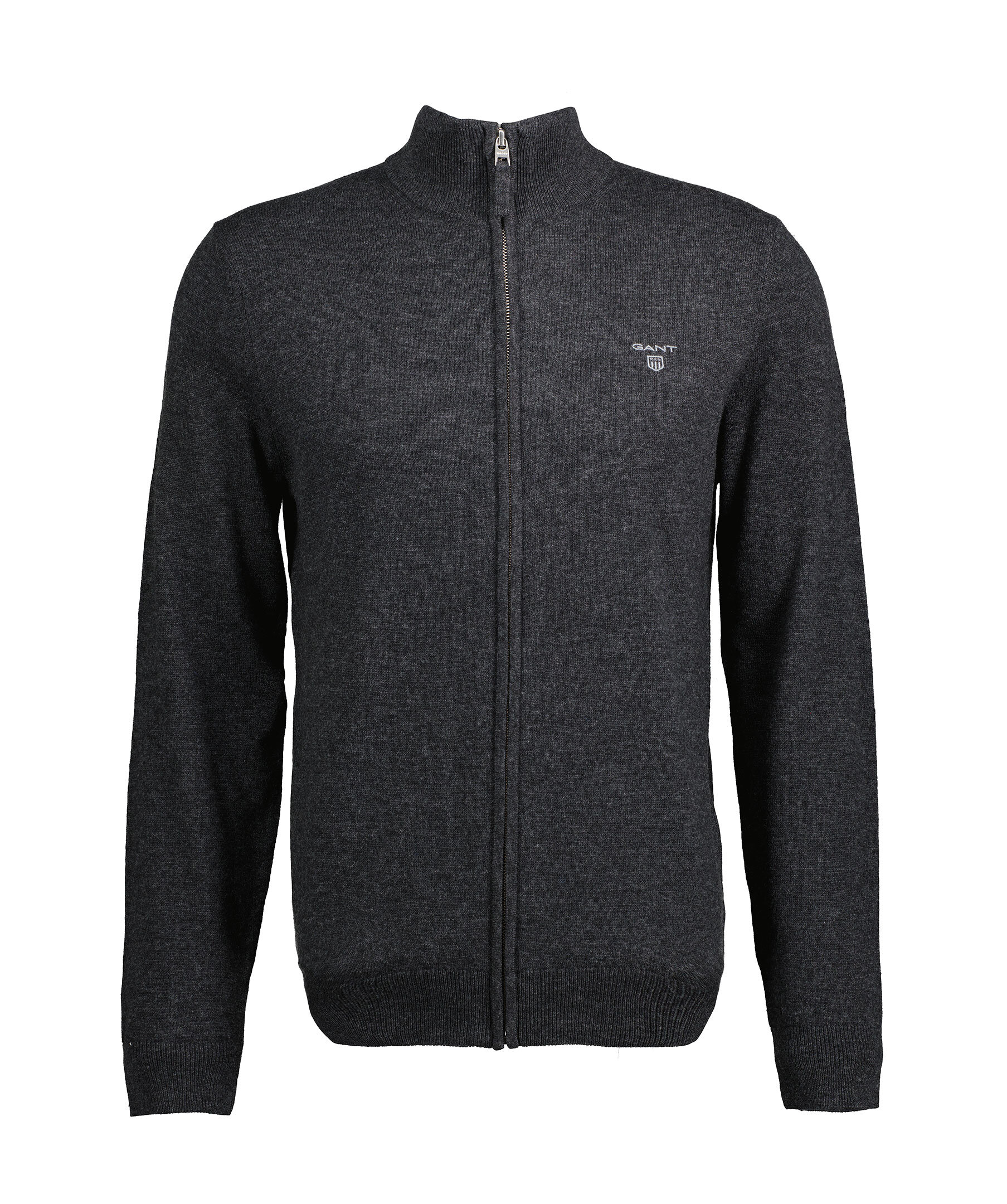 Mörkgrå cardigan med zip från Gant. Ribbstickade muddar i kragen, ärm- och plaggslut. Broderad logga på bröstet. Tillverkad i 100% Lammull.