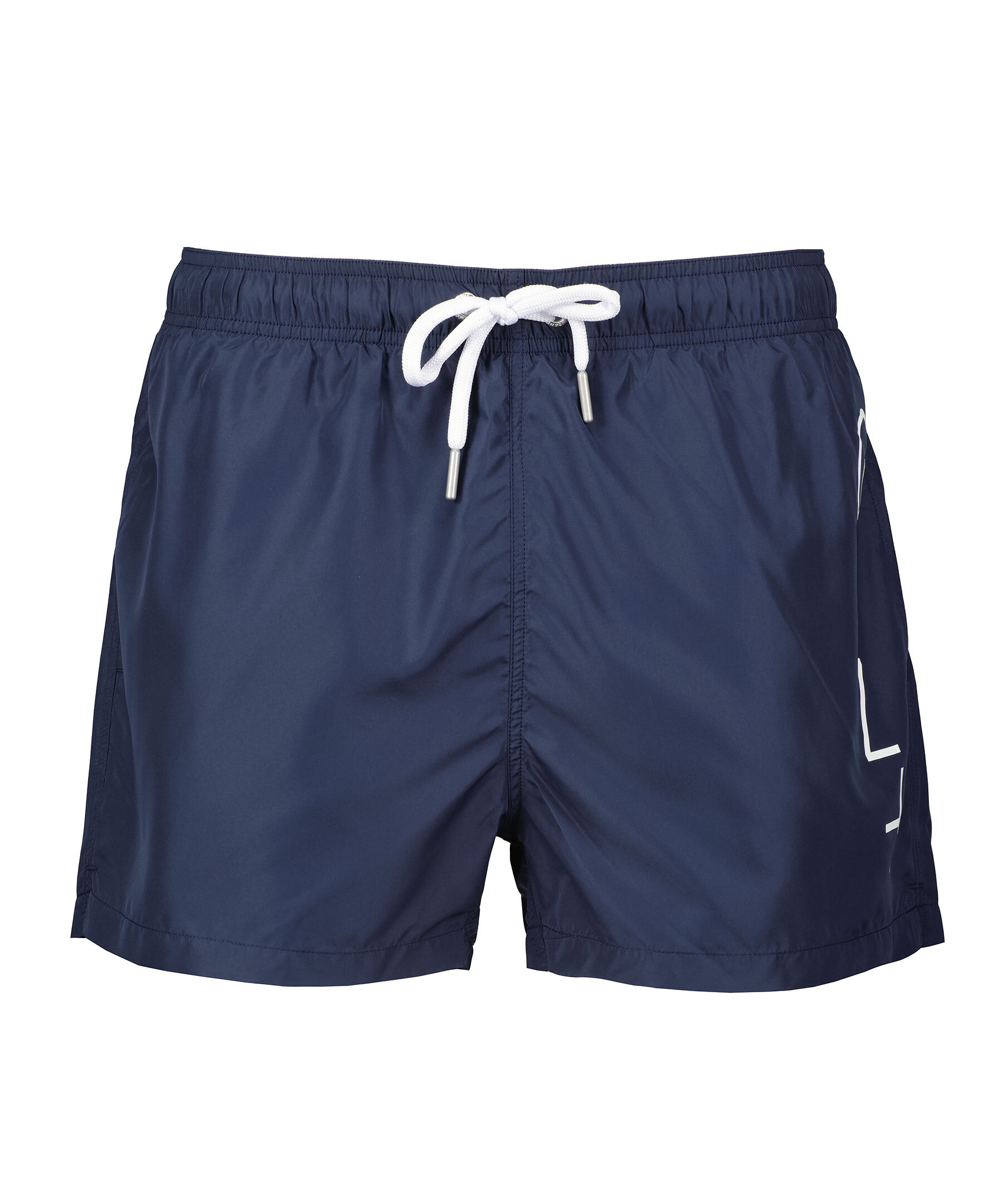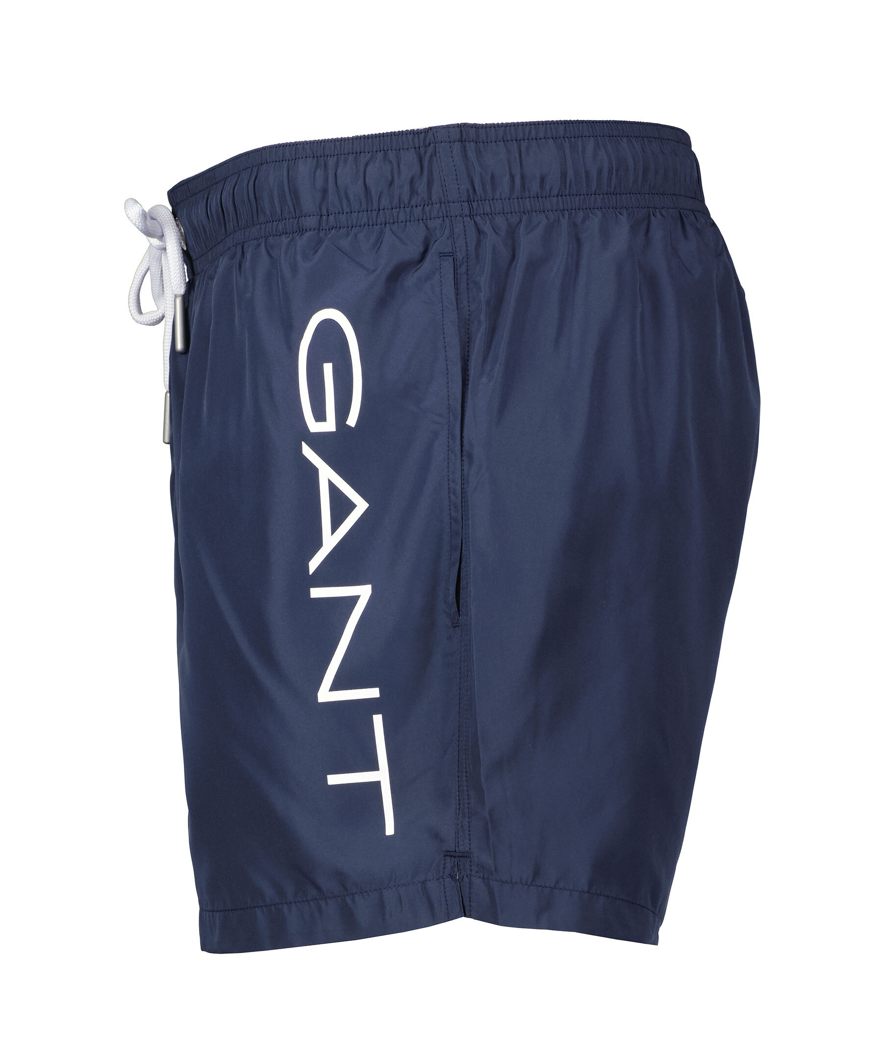 Marinblåa badbyxor från Gant. Vit logotyp längs ena benet. Elastisk midja med dragsko. Tillverkade i polyester.