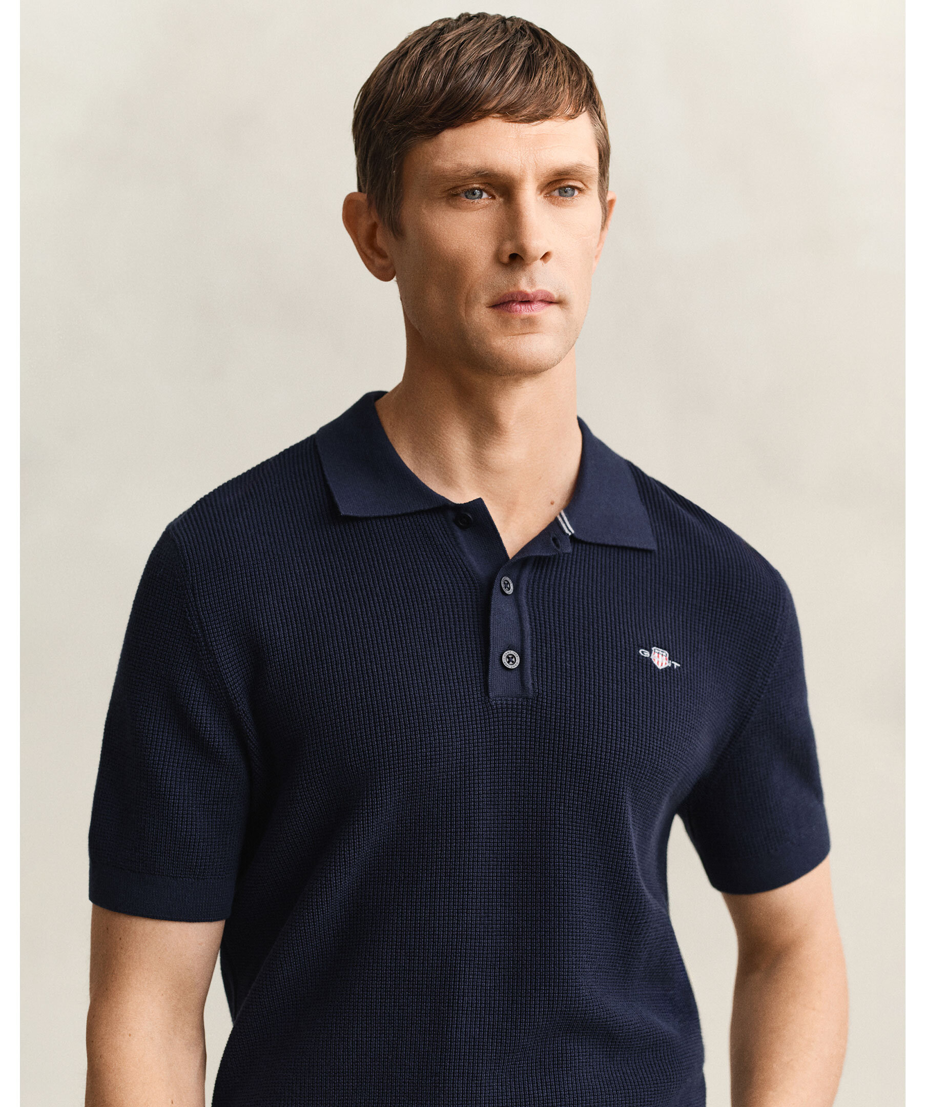 Kortärmade pikétröja från Gant. Tillverkad i en bomullsblandning med diskret våffelstickad struktur. Tröjan har en normal passform. Polokrage med knappslå, ribbade avslut och sköldbroderi på bröstet.