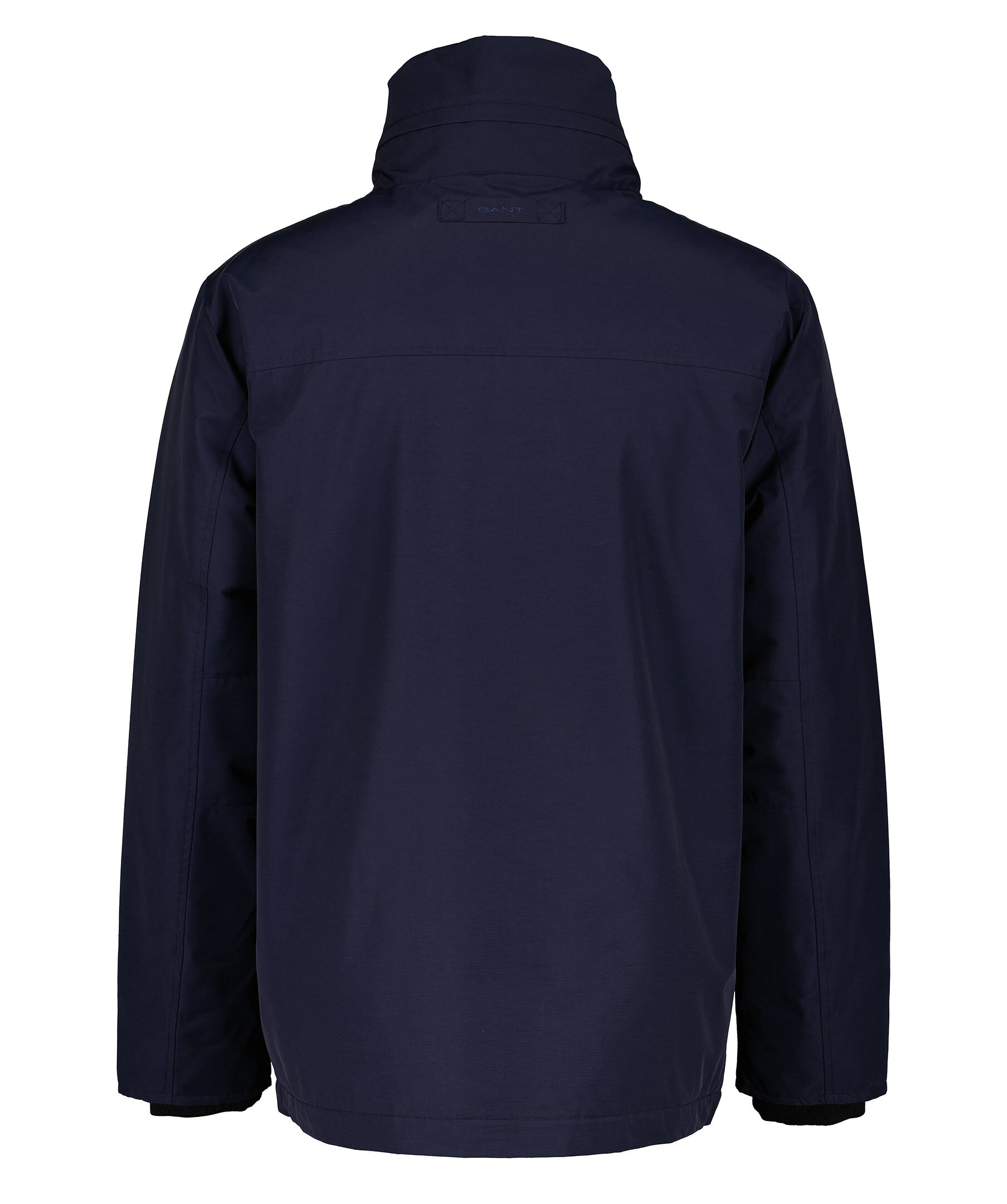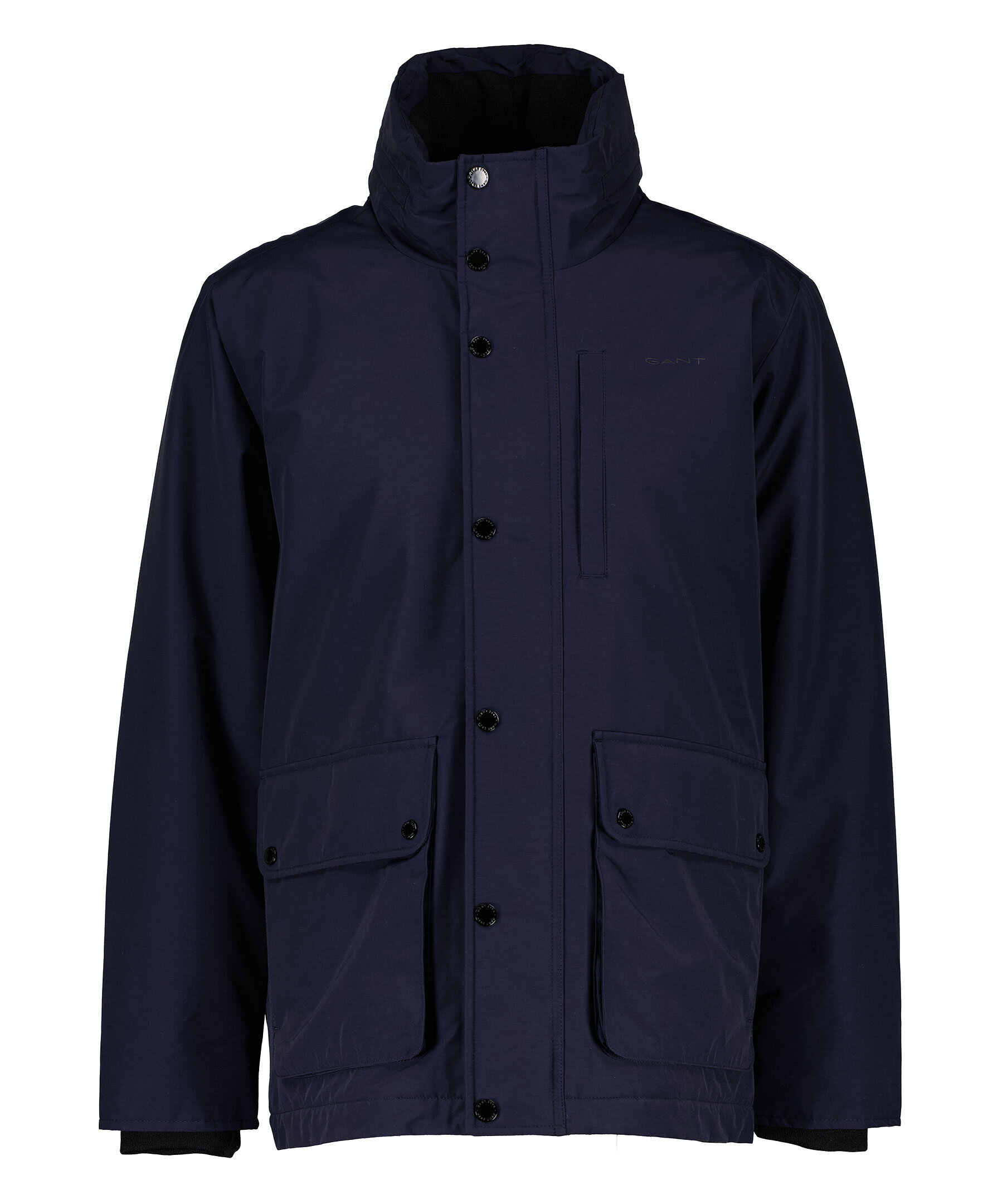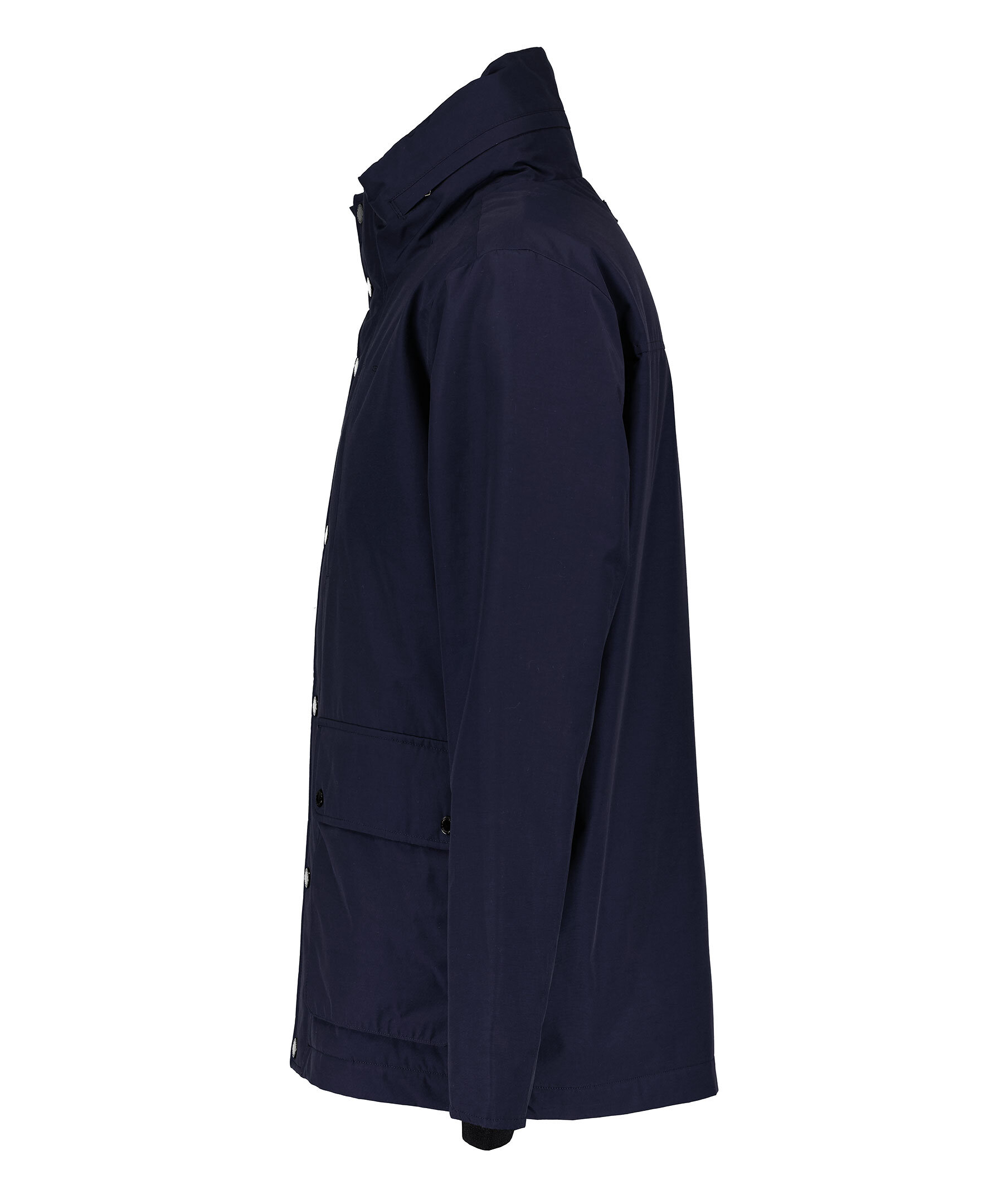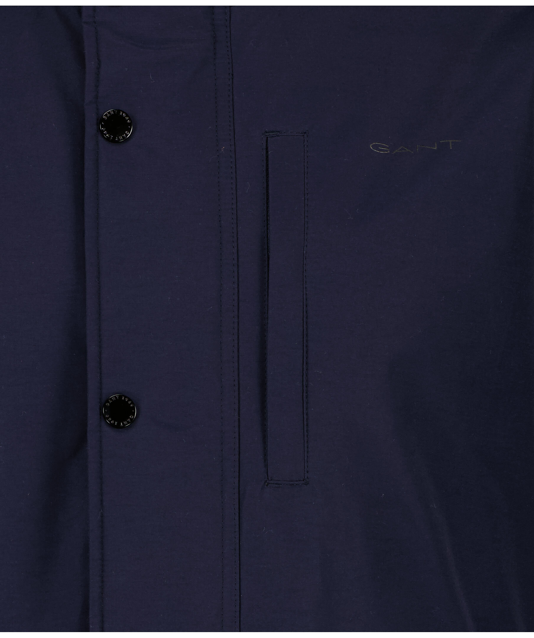 Marinblå, tunn och vattenavvisande jacka från Gant. Normal passform i en längd som slutar mitt på låret för högsta väderskydd. Den har tvåvägsdragkedja fram under en knappslå med tryckknappar och fungerar som ett skyddande lager vid ostadigt väder. Påsydda fickor och bröstficka med dragkedja. Tillverkad i en bomullsblandning.