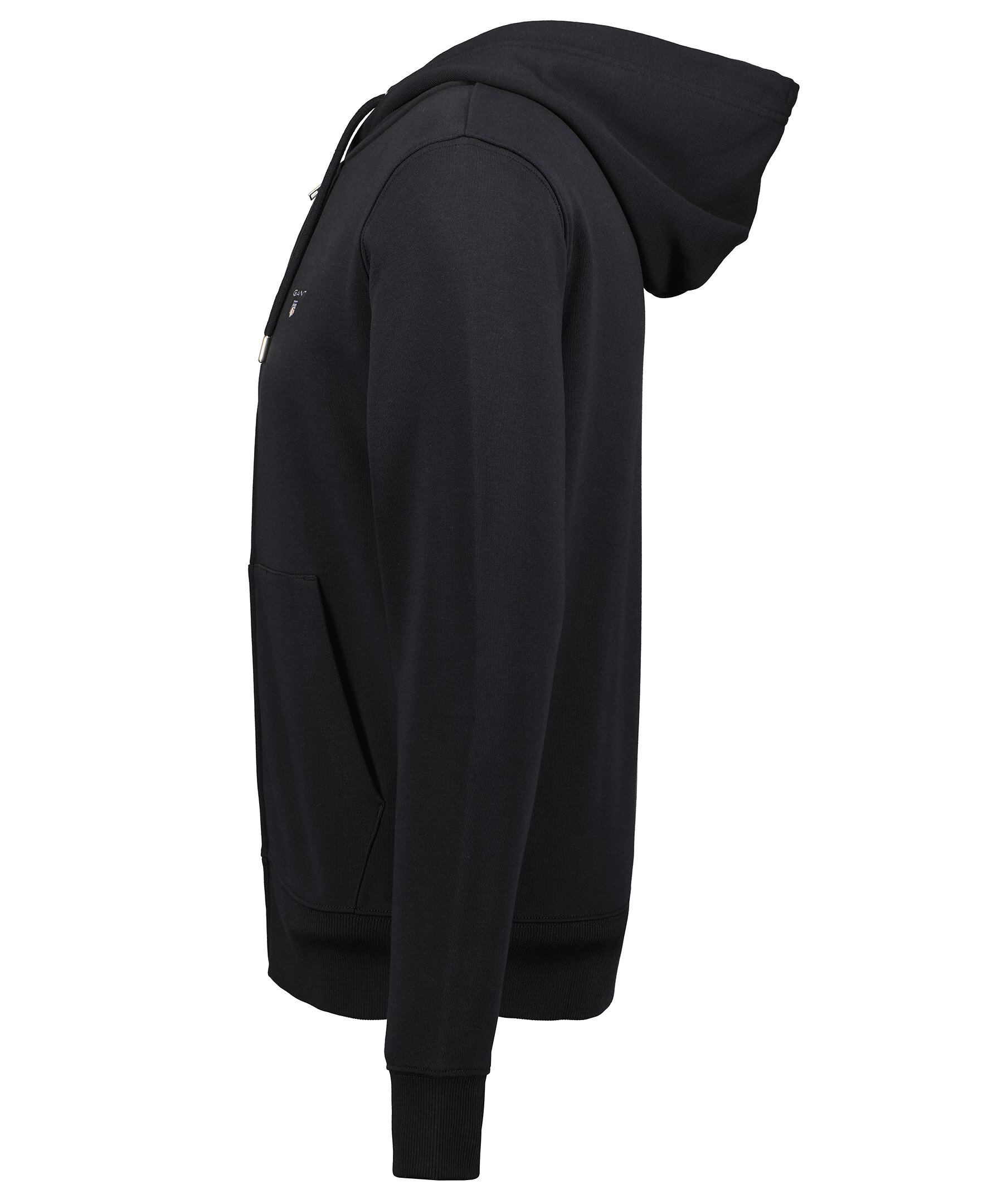 Svart huvtröjan från Gant. Normal passform, ribbstickade muddar i ärmslut och nertill. Huva med dragsko, två fickor fram samt hellång dragkedja. Broderad logga på vänster bröst.