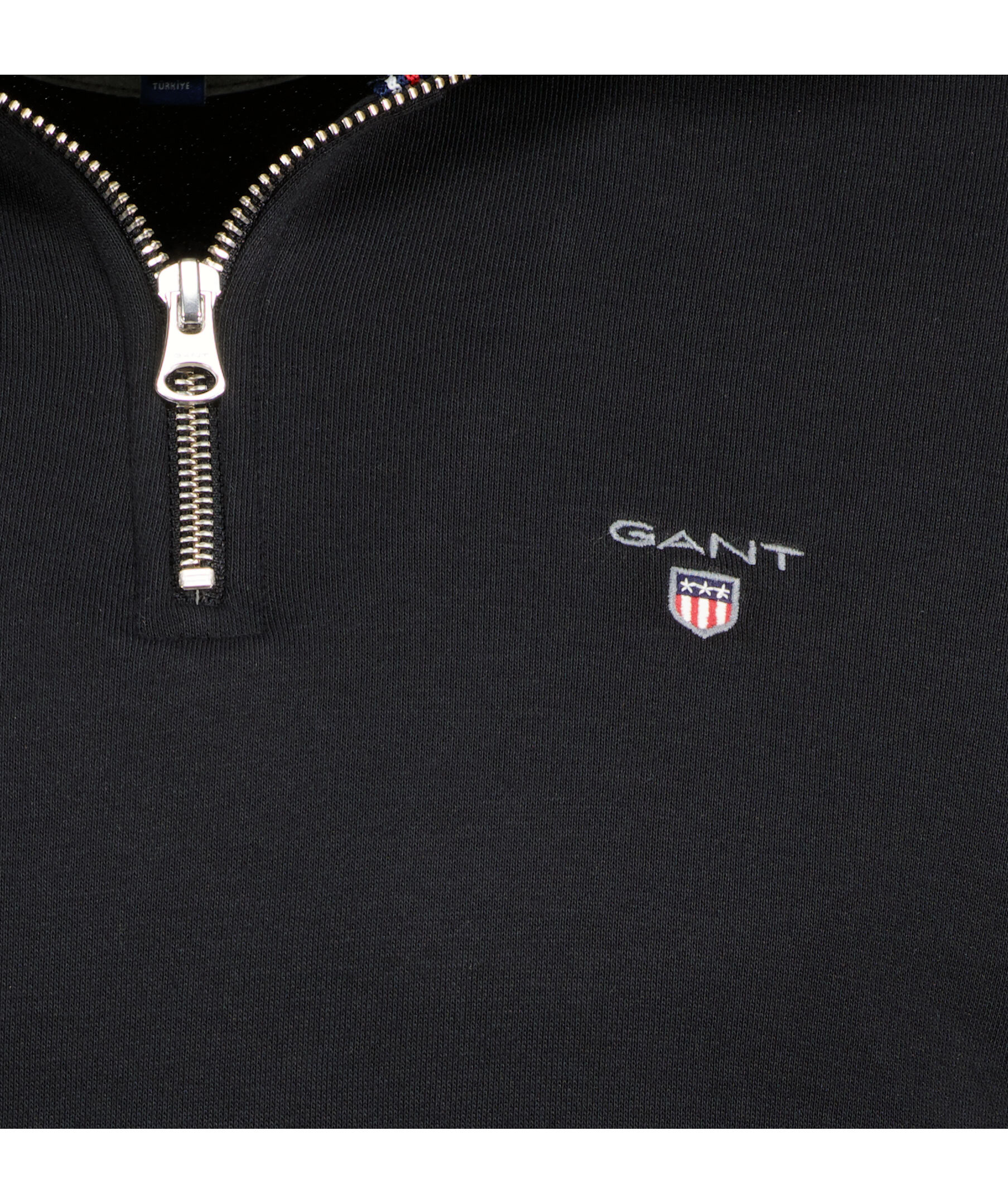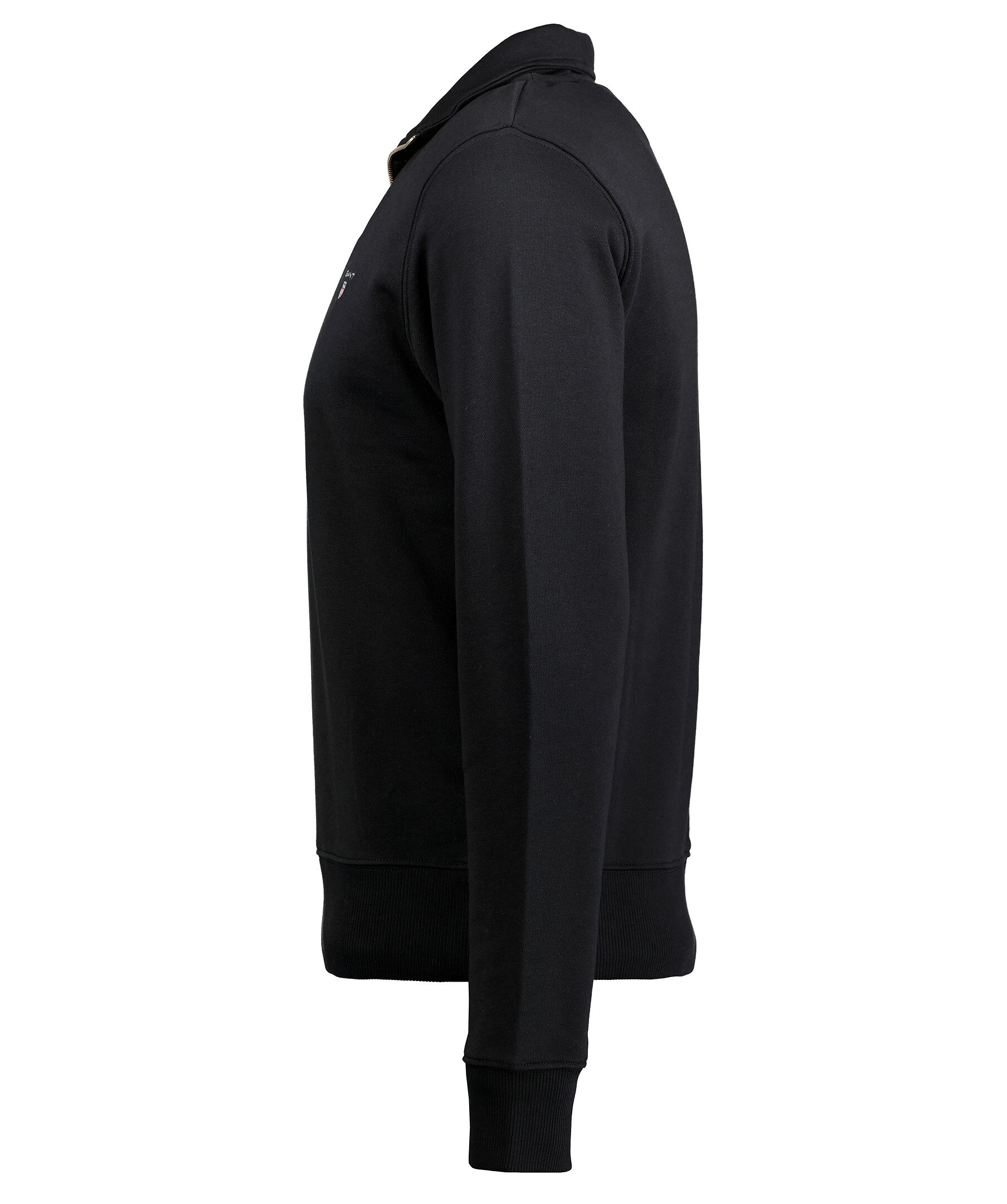 Svart half-zip från Gant. Broderad logotyp på vänster bröst. Ribbstickade muddar vid plagg- och ärmslut.