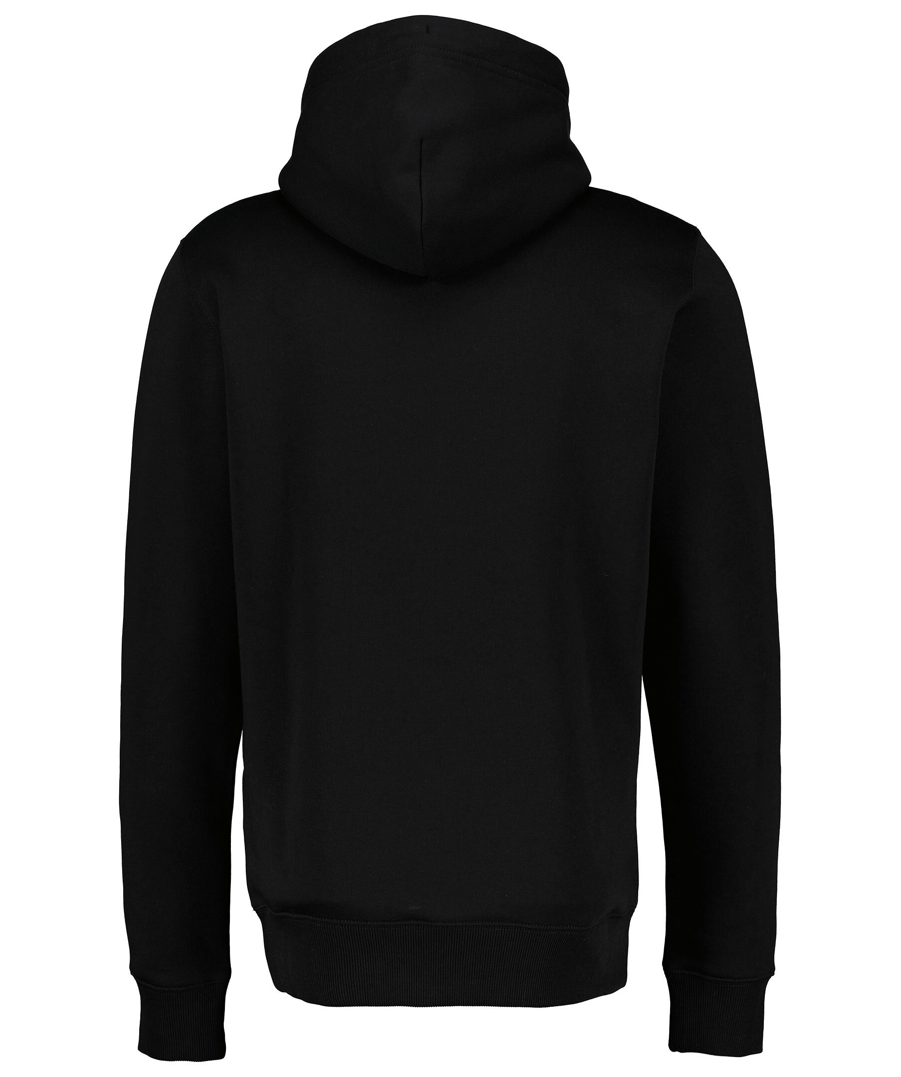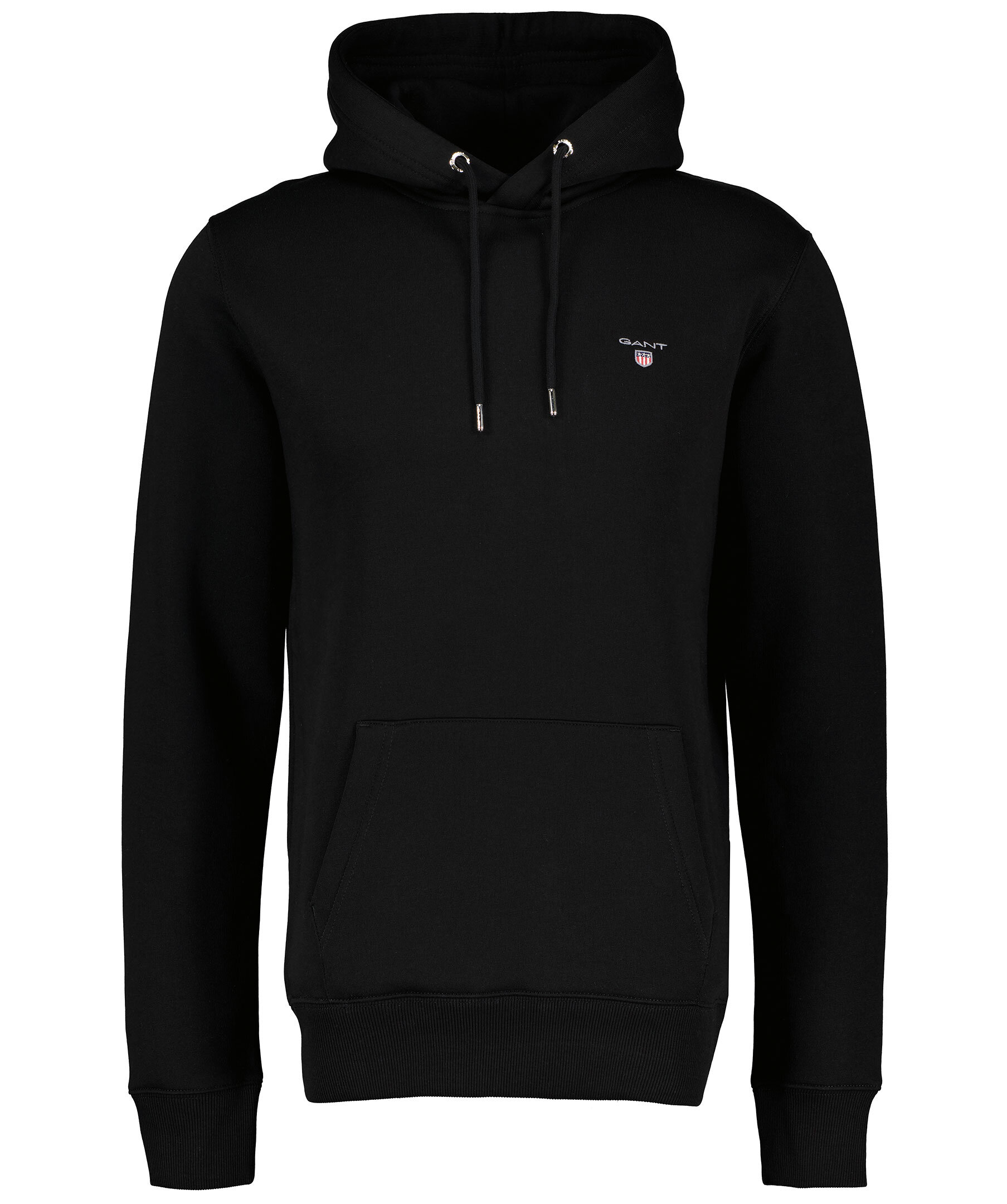 Svart hoodie från Gant, gjord i en mjuk blandning av bomull och polyester. Liten logotyp med Gant sköld på bröstet, snörning i luvan och ficka på magen. Ribbade muddar vid ärm och plaggslut.