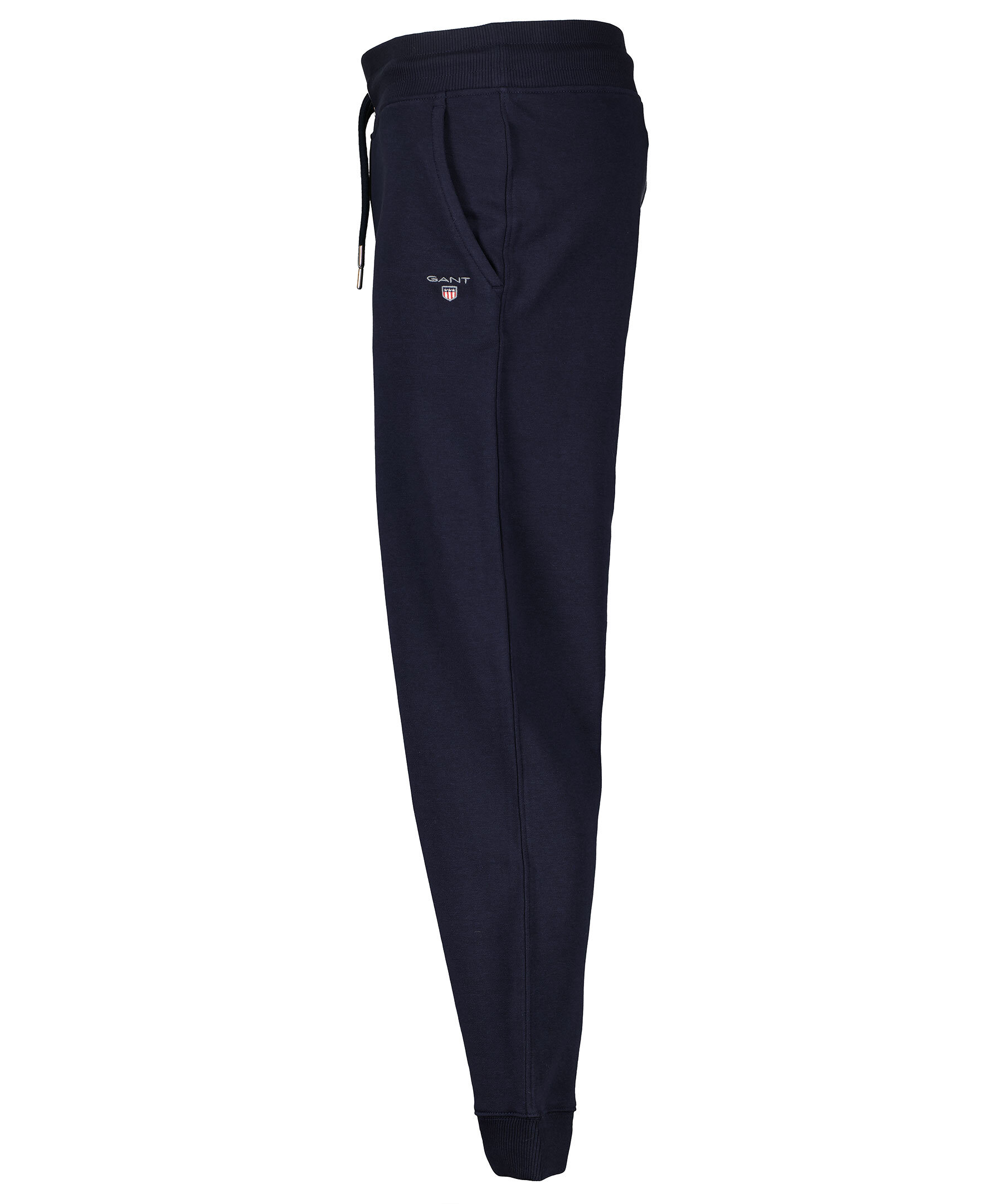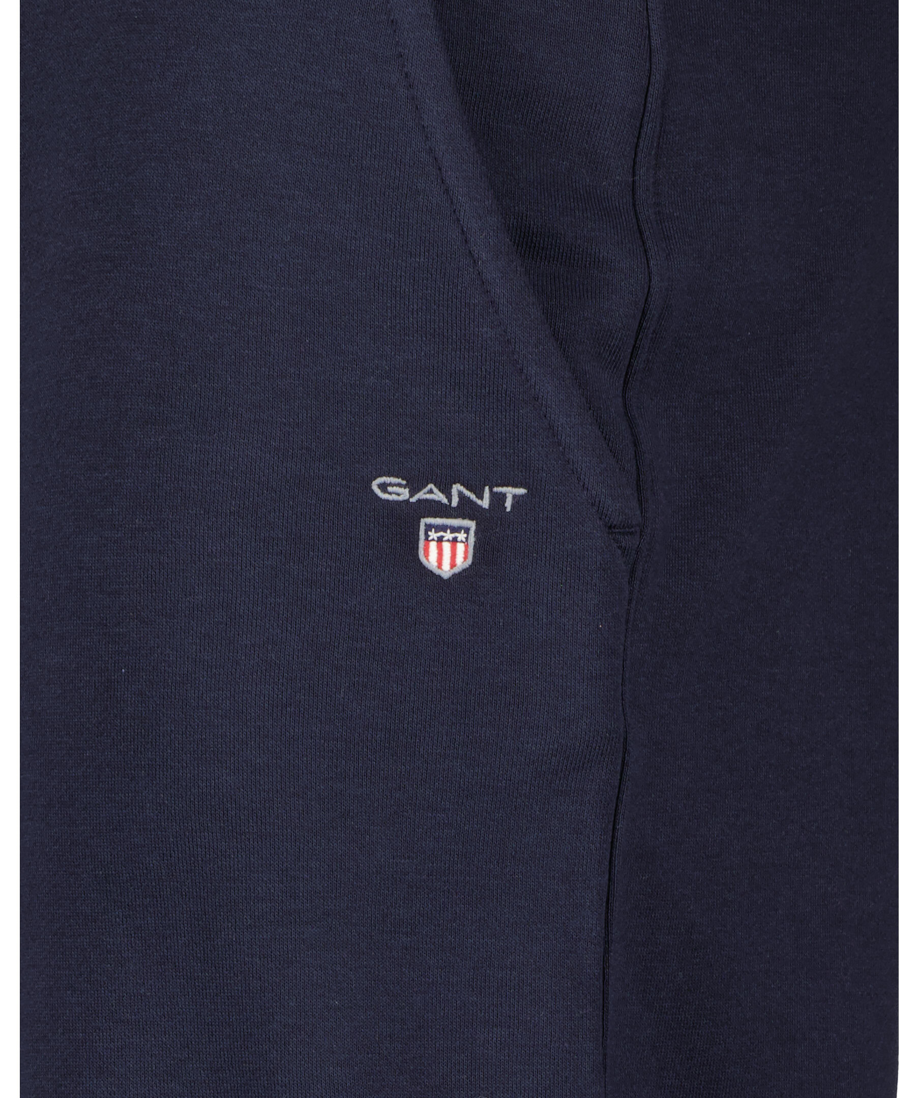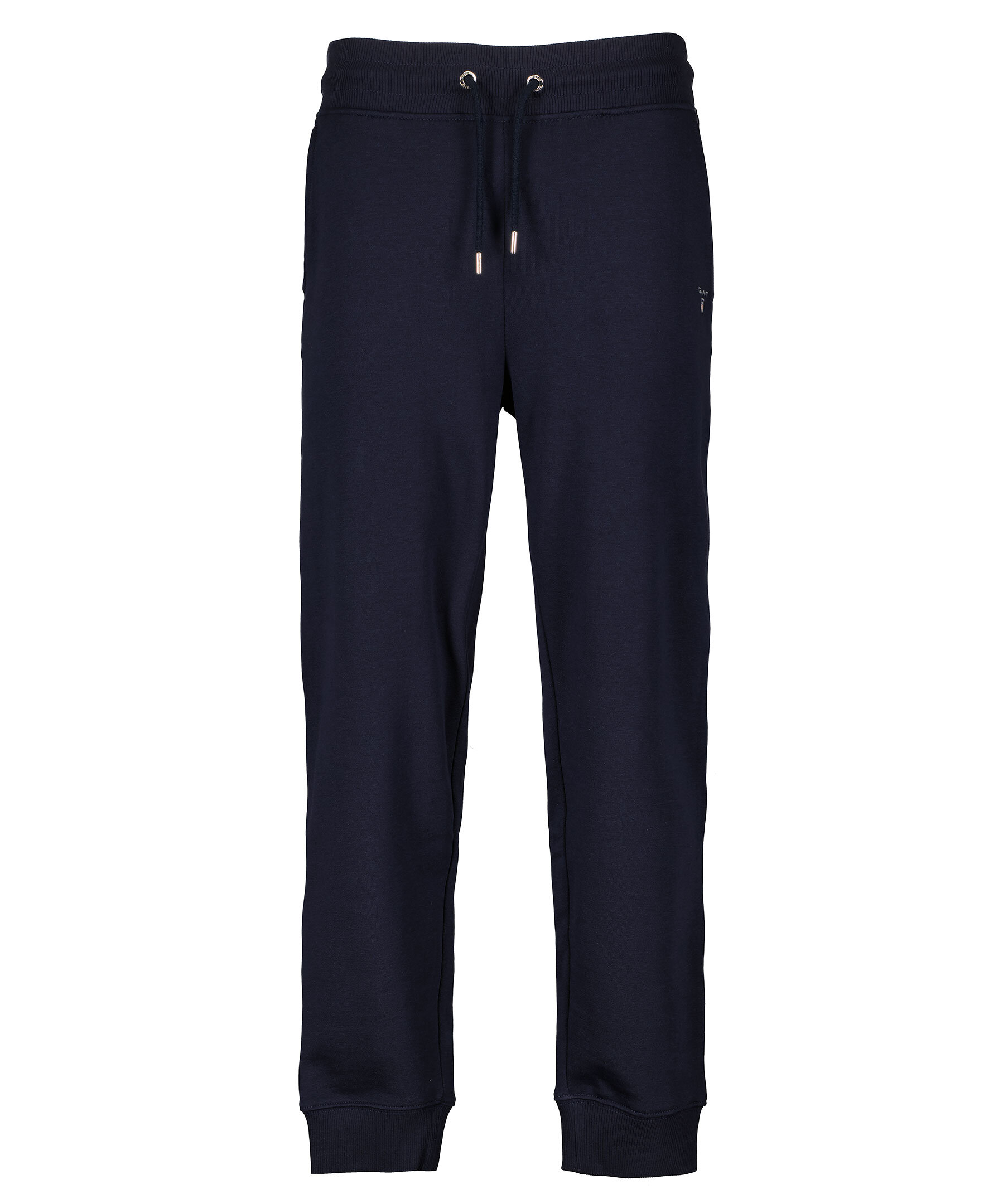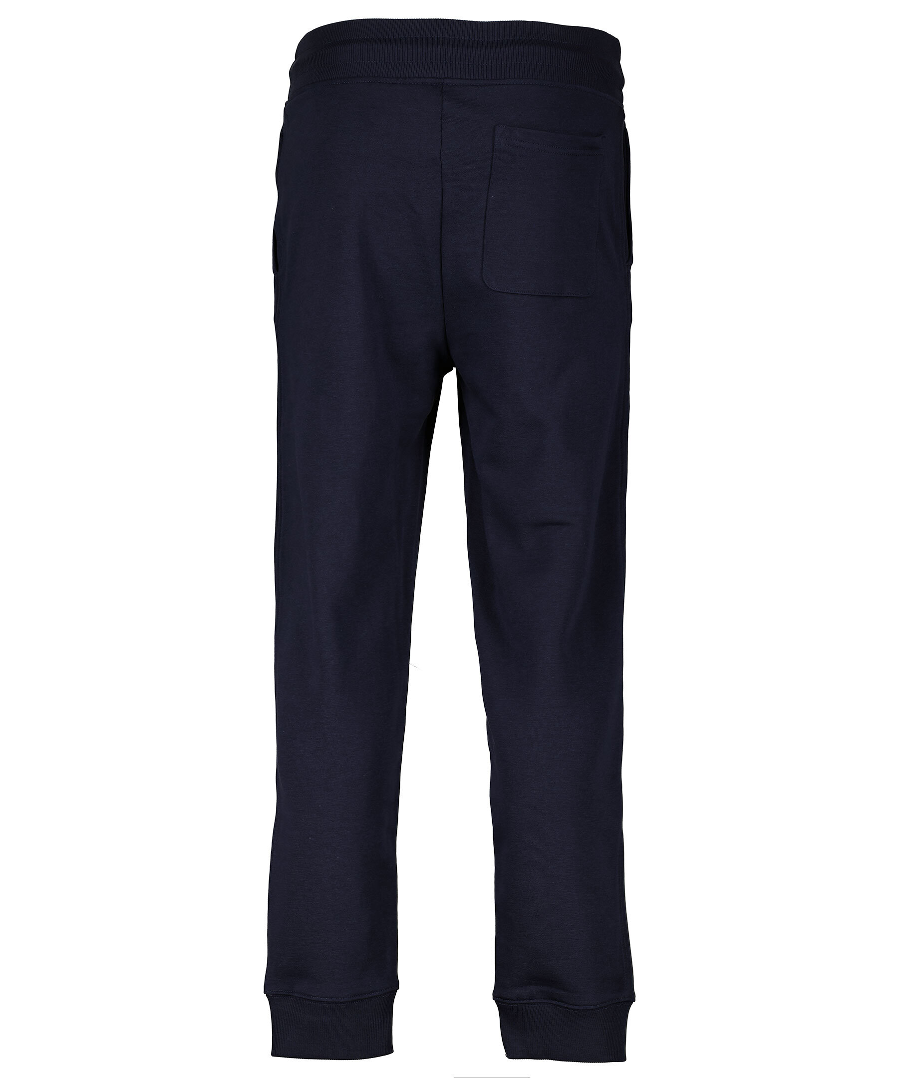 Marinblåa mjukisbyxor från Gant. Mudd och snörning i midjan samt muddar i benslut. Två framfickor, en bakficka samt en liten broderad logotyp på vänster byxben. Tillverkade i bomullsblandning.