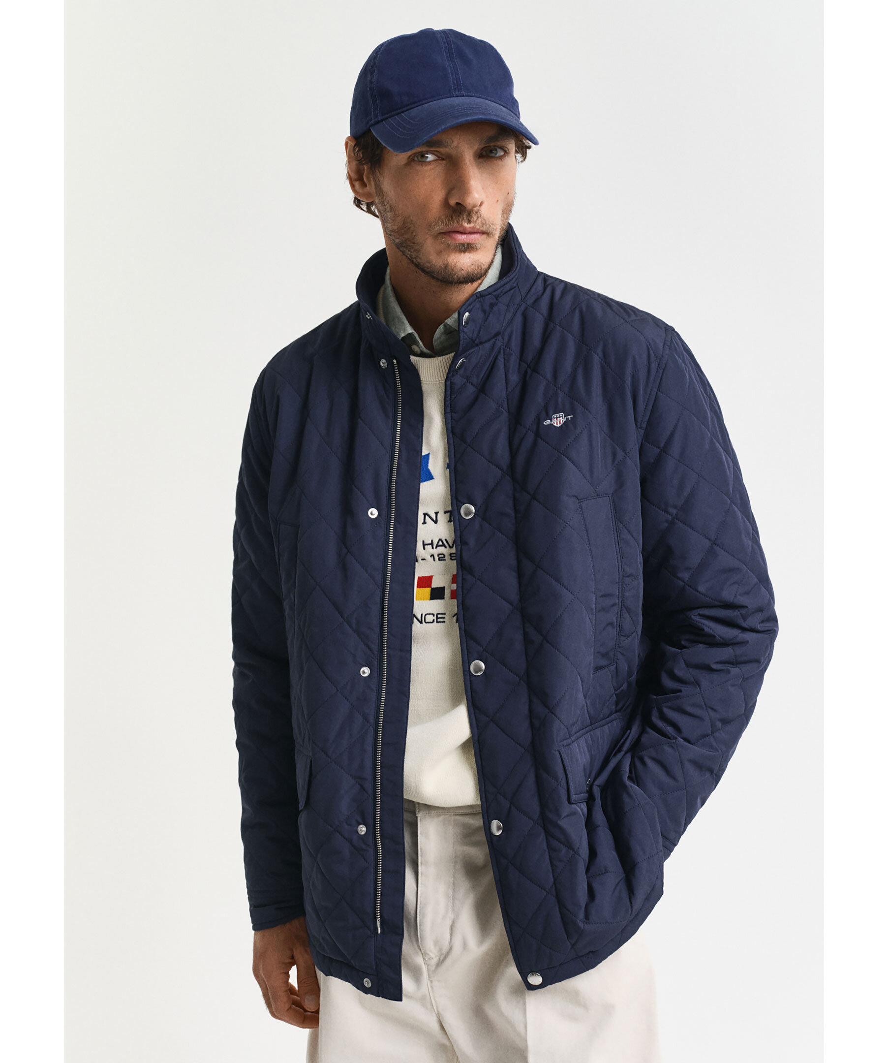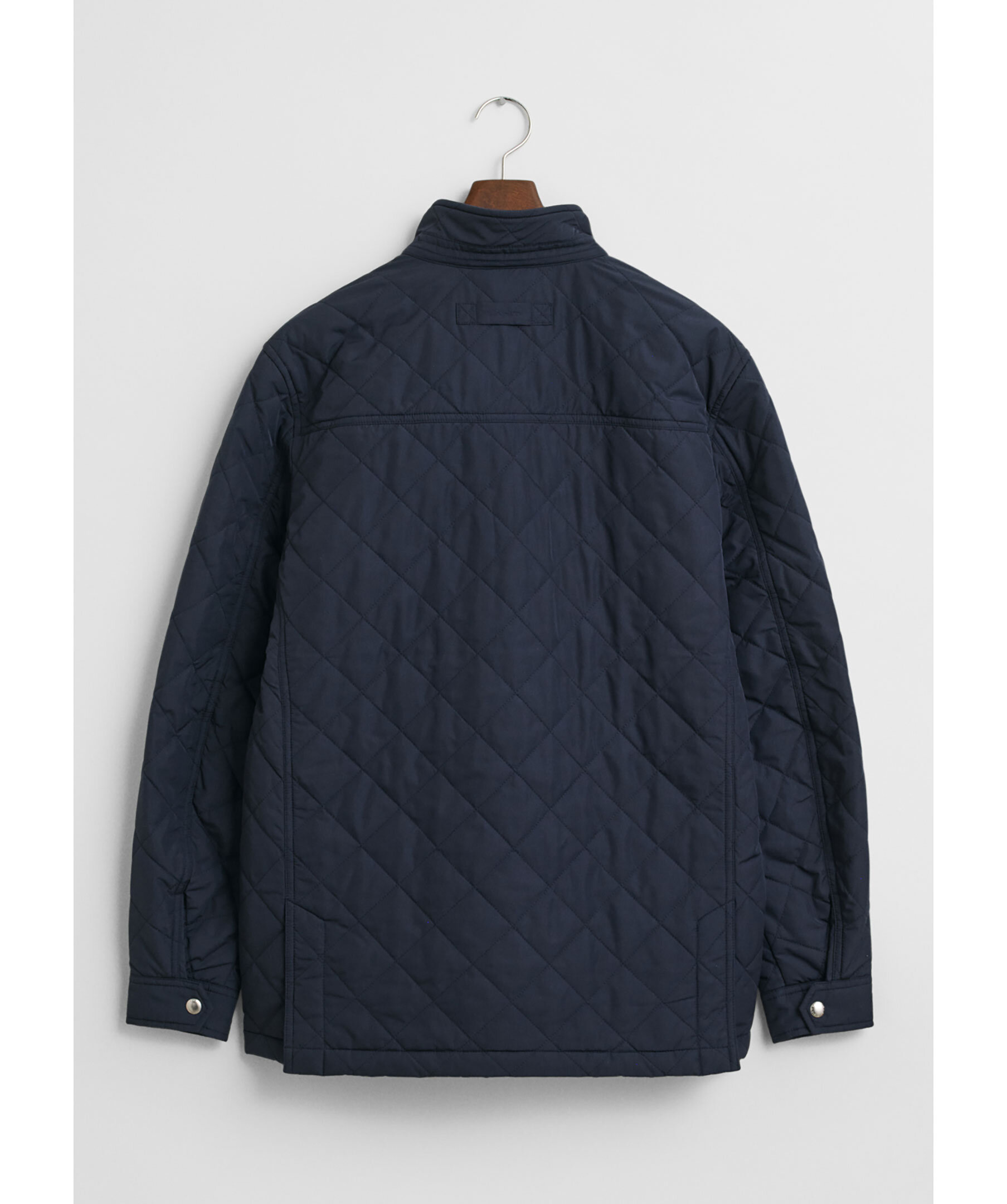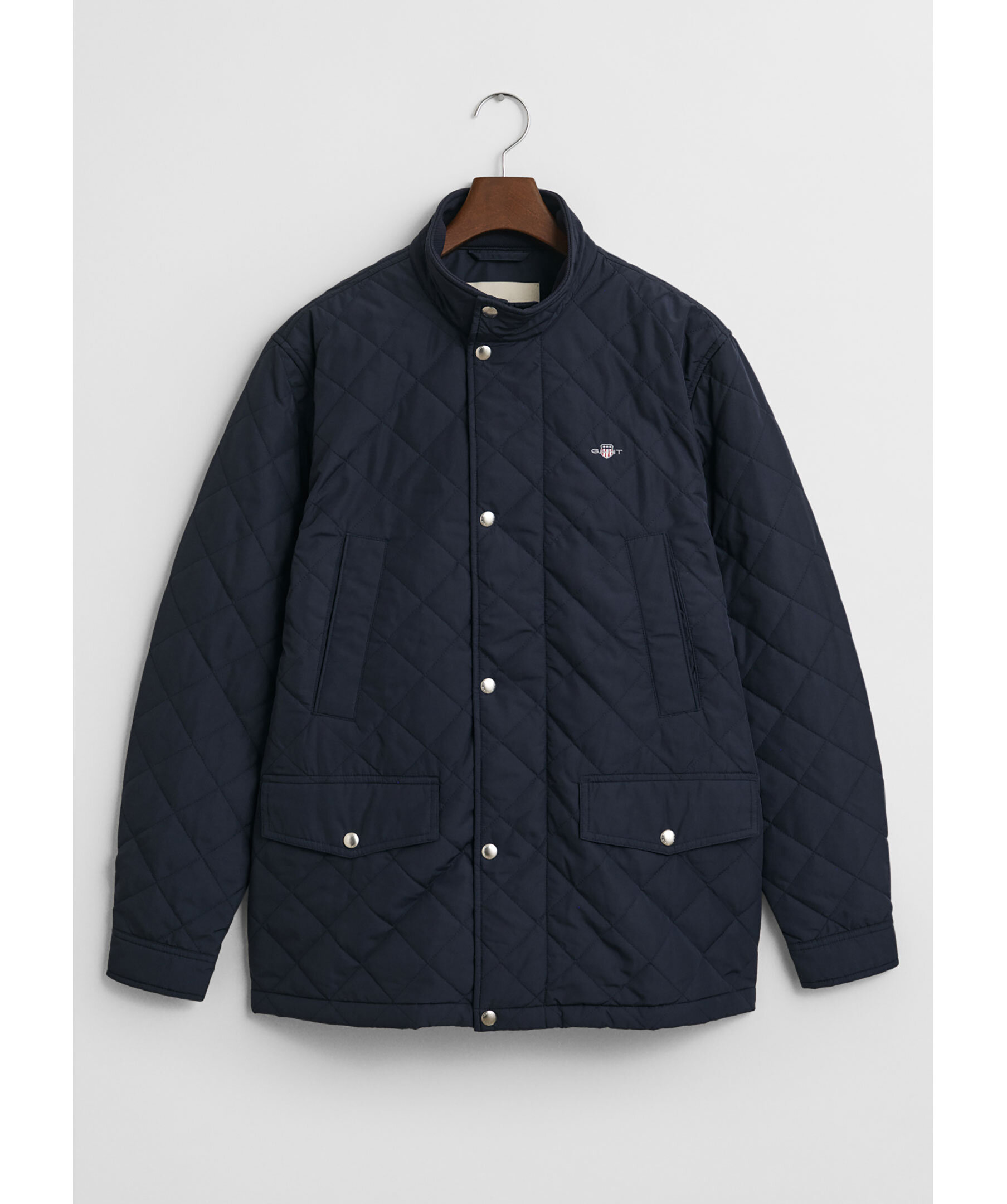 Mörkblå, quiltad jacka med ståkrage från Gant. Jackan stängs med dold dragkedja och tryckknappar och har två fickor med lock och knapp samt två snedställda fickor ovanför och två innerfickor. Broderad logotyp och locker loop bak gör jackan komplett. Jackan har en vattenavvisande DWR-beläggning (Durable Water Repellent) som hjälper till att leda bort vatten i lätt regn. Tillverkad i polyester.