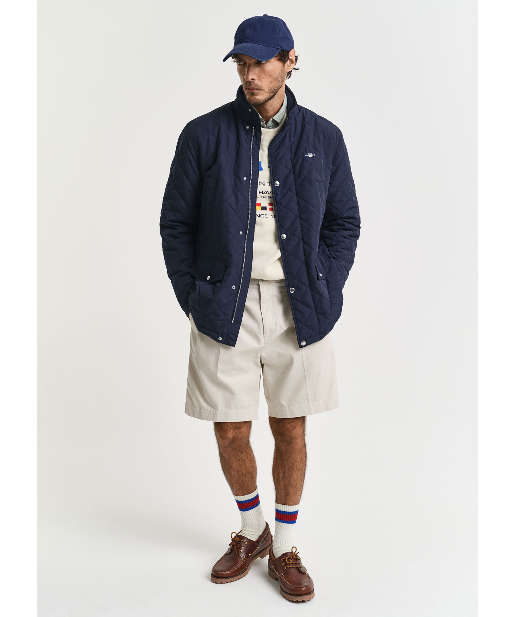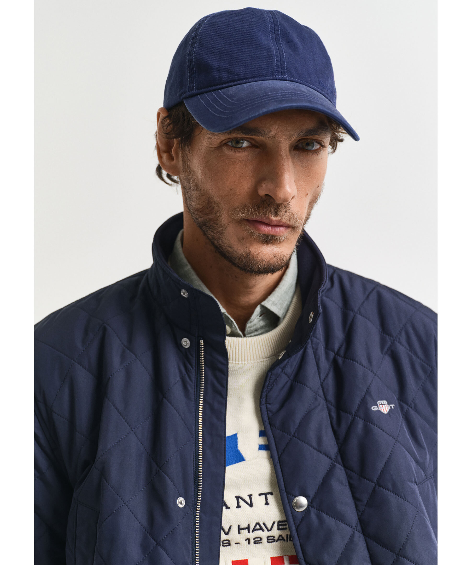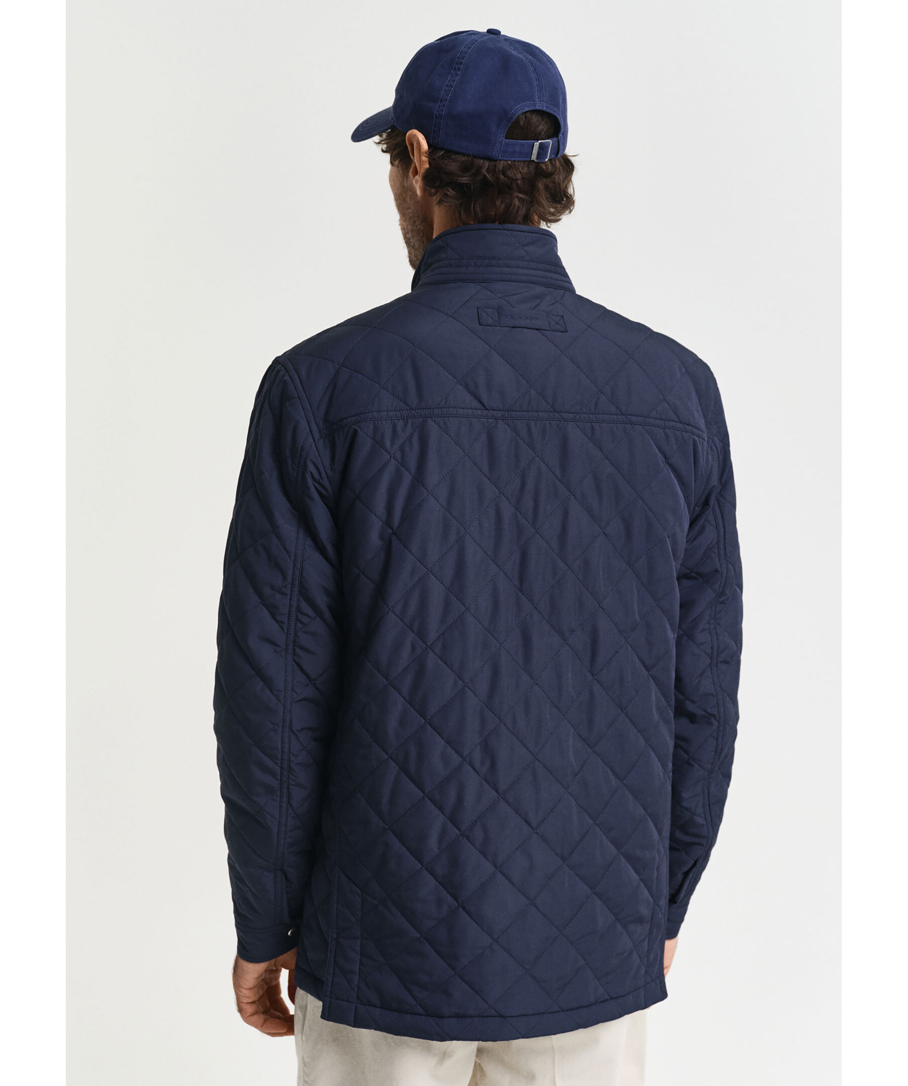 Mörkblå, quiltad jacka med ståkrage från Gant. Jackan stängs med dold dragkedja och tryckknappar och har två fickor med lock och knapp samt två snedställda fickor ovanför och två innerfickor. Broderad logotyp och locker loop bak gör jackan komplett. Jackan har en vattenavvisande DWR-beläggning (Durable Water Repellent) som hjälper till att leda bort vatten i lätt regn. Tillverkad i polyester.