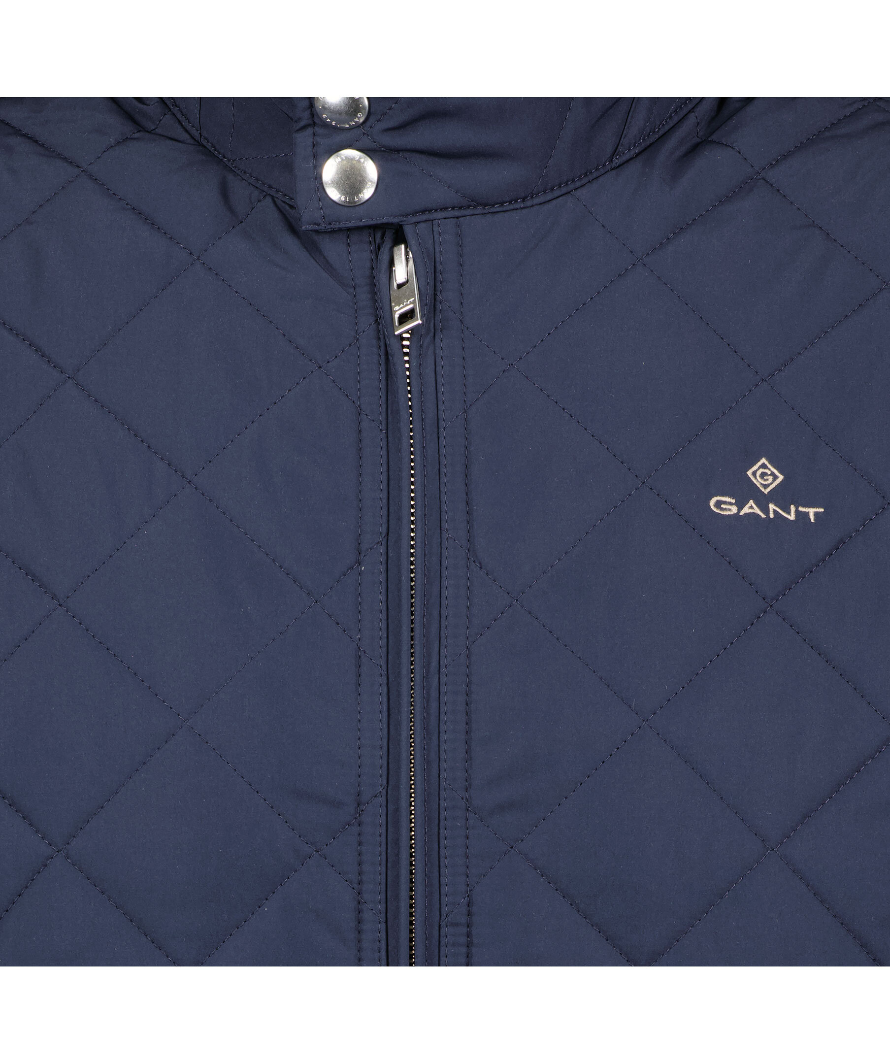 Marinblå, tunn quiltad vadderad väst från Gant. Stängs framtill med dragkedja. Två snedställda fickor framtill som stängs med tryckknappar. En innerficka som stängs med dragkedja. Broderad logotyp på vänster bröst.
