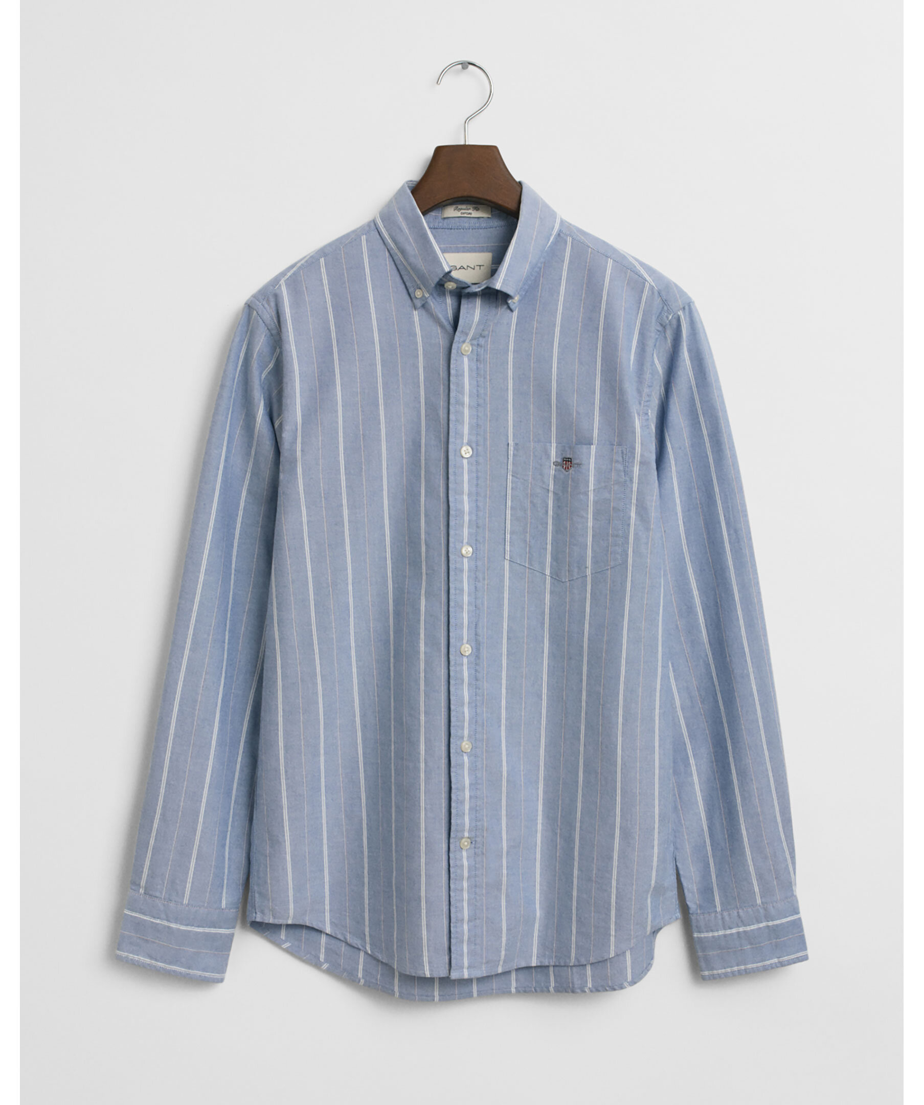 Ljusblå oxfordskjorta med smala ränder från GANT. Skuren i en normal passform och är tillverkad i bomull och har en mjuk Oxfordväv, hämtad från GANTs skjortarkiv. Designen inkluderar en button-down-krage, justerbara manschetter samt ett veck och GANTs karakteristiska locker loop i ryggen. Dessutom pryds bröstfickan av en diskret broderad GANT-sköld.