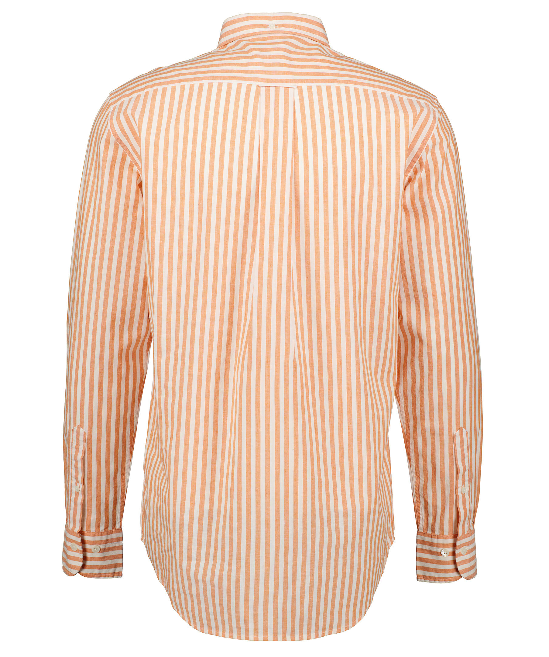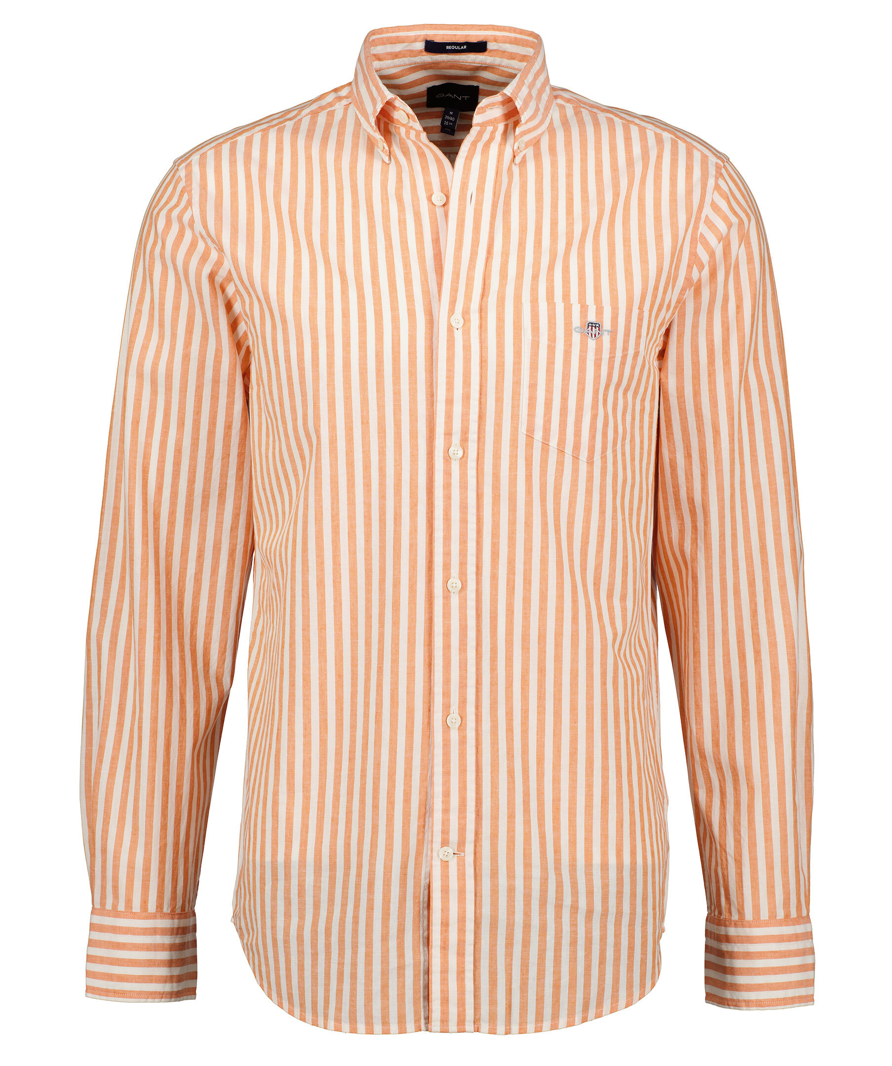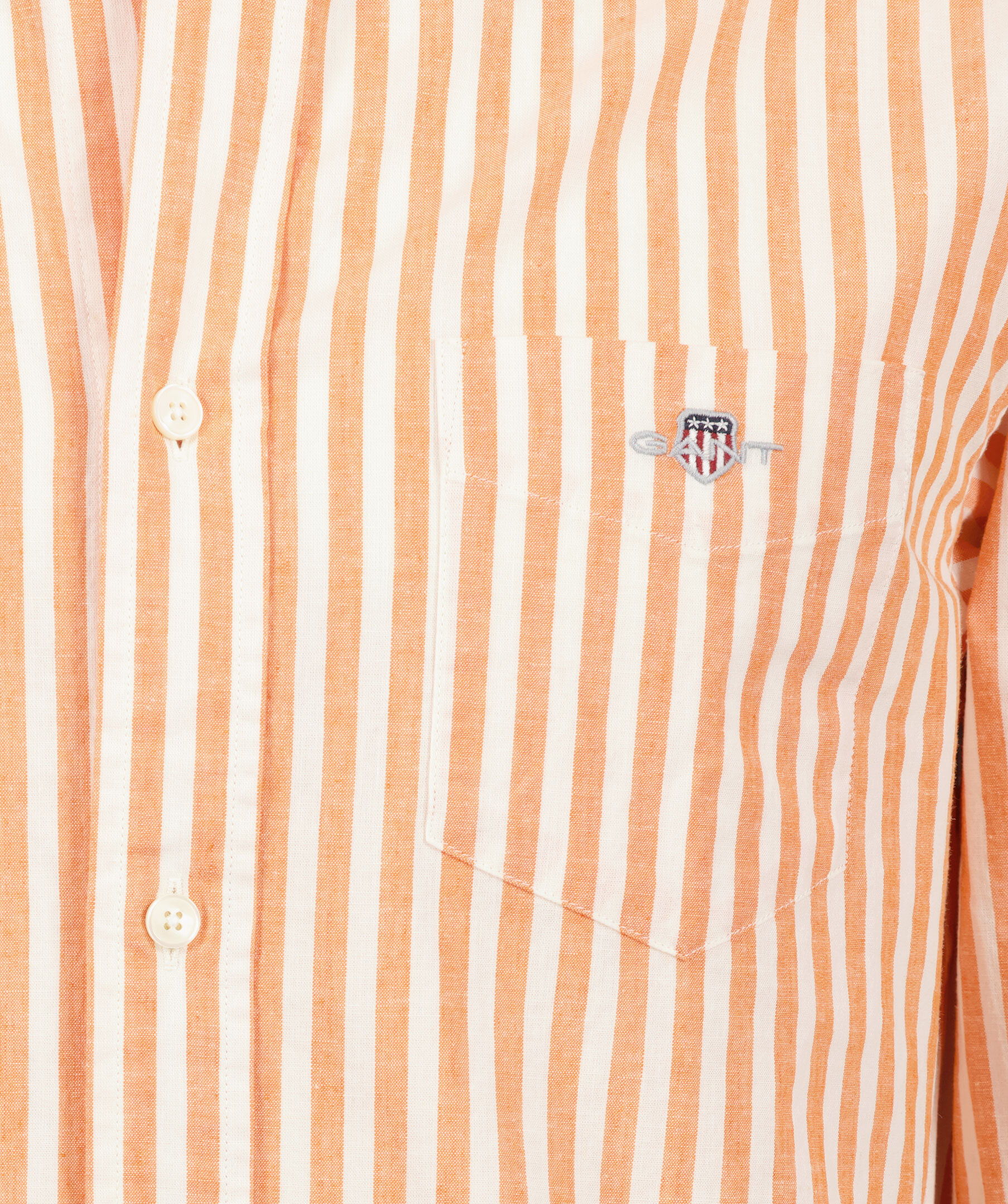 Vit och orange randig skjorta i en regular fit från Gant. Tillverkad i en bomull- och linneblandning. Bröstficka på vänster sida med broderad logotyp. Enkla manschetter med knappar och button down krage. Skjortan har vita knappar hela vägen framtill och en normal passform.