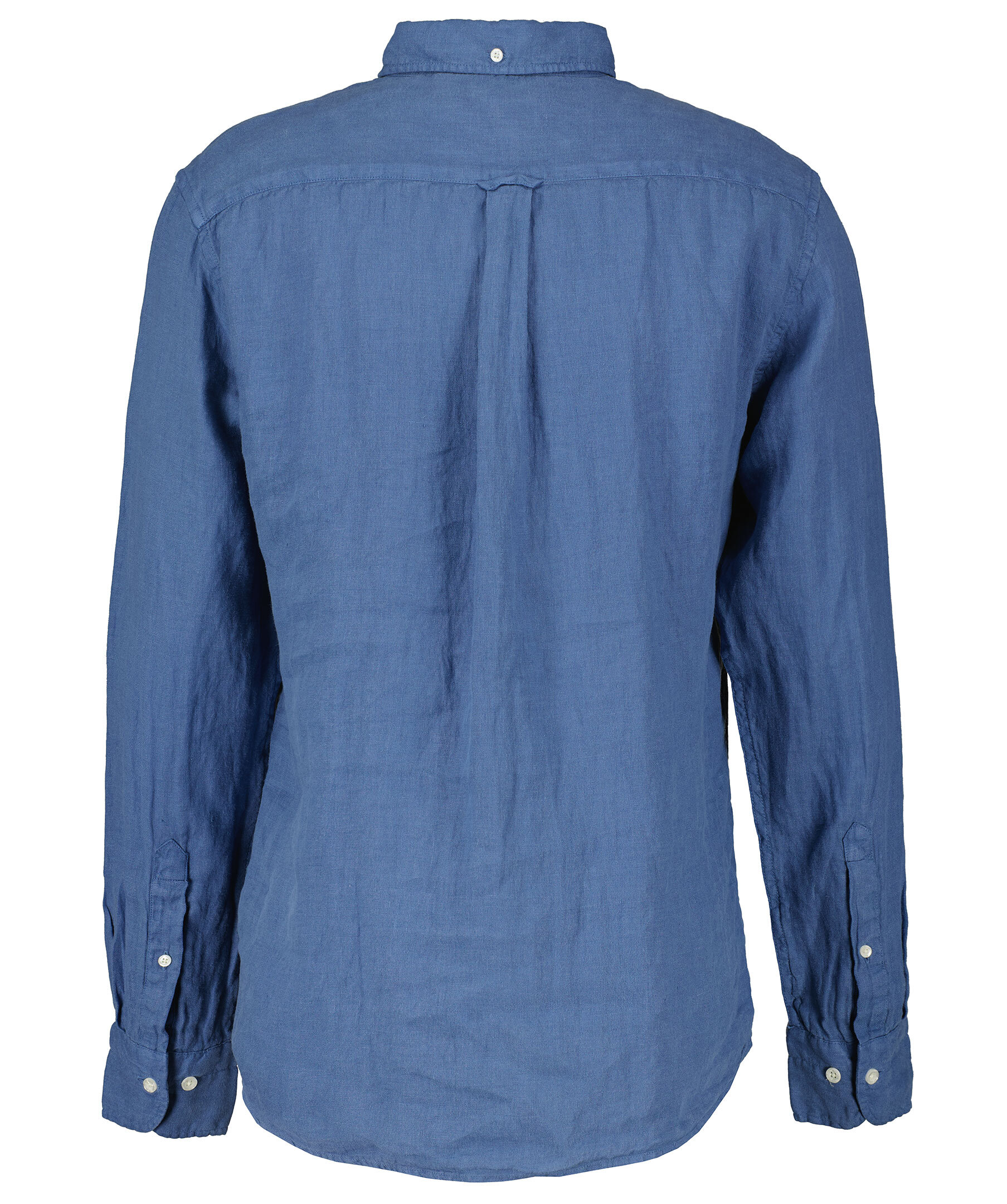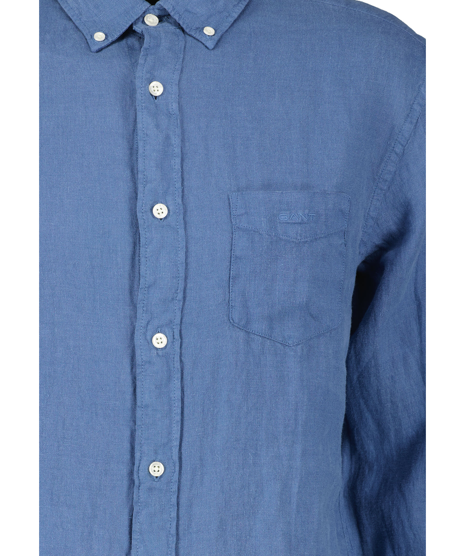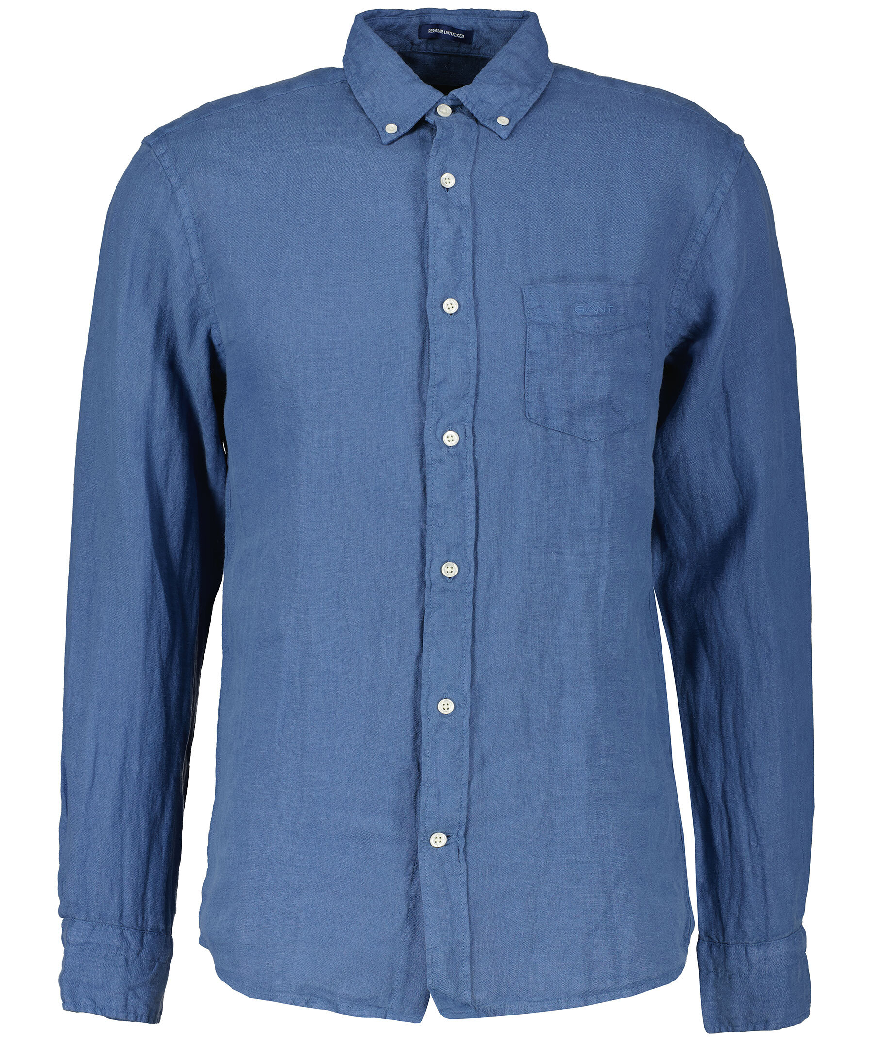 Blå skjorta i Regular fit från Gant. Tillverkad 100% linnetyg. Har vita knappar hela vägen fram, button down krage och dubbla manschetter. Liten broderad logotyp på vänster bröst.