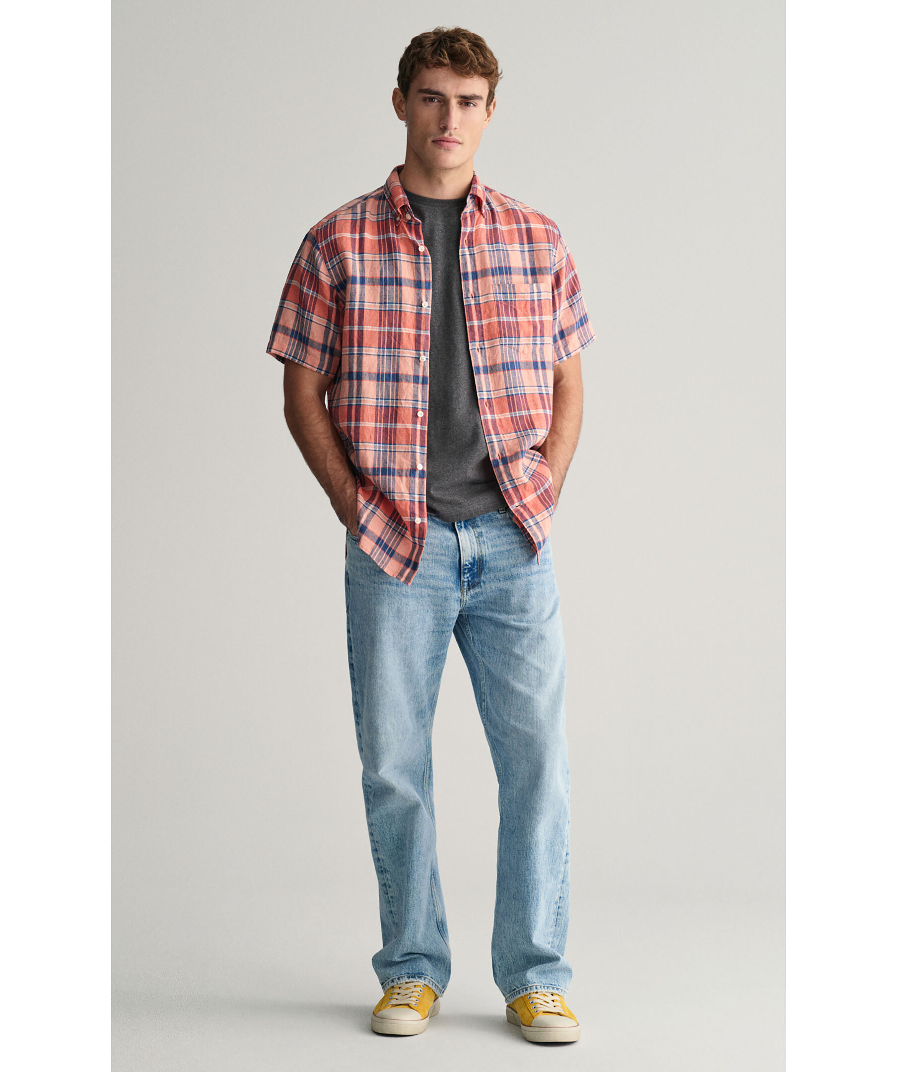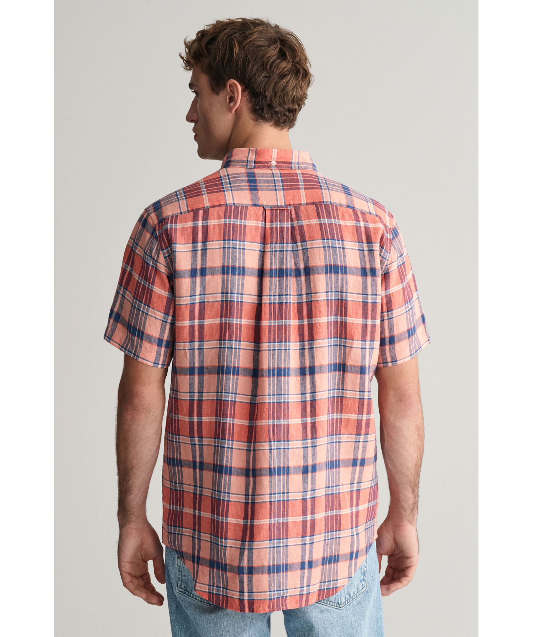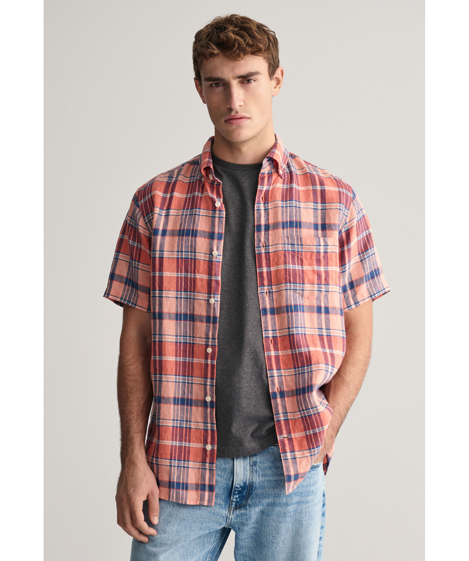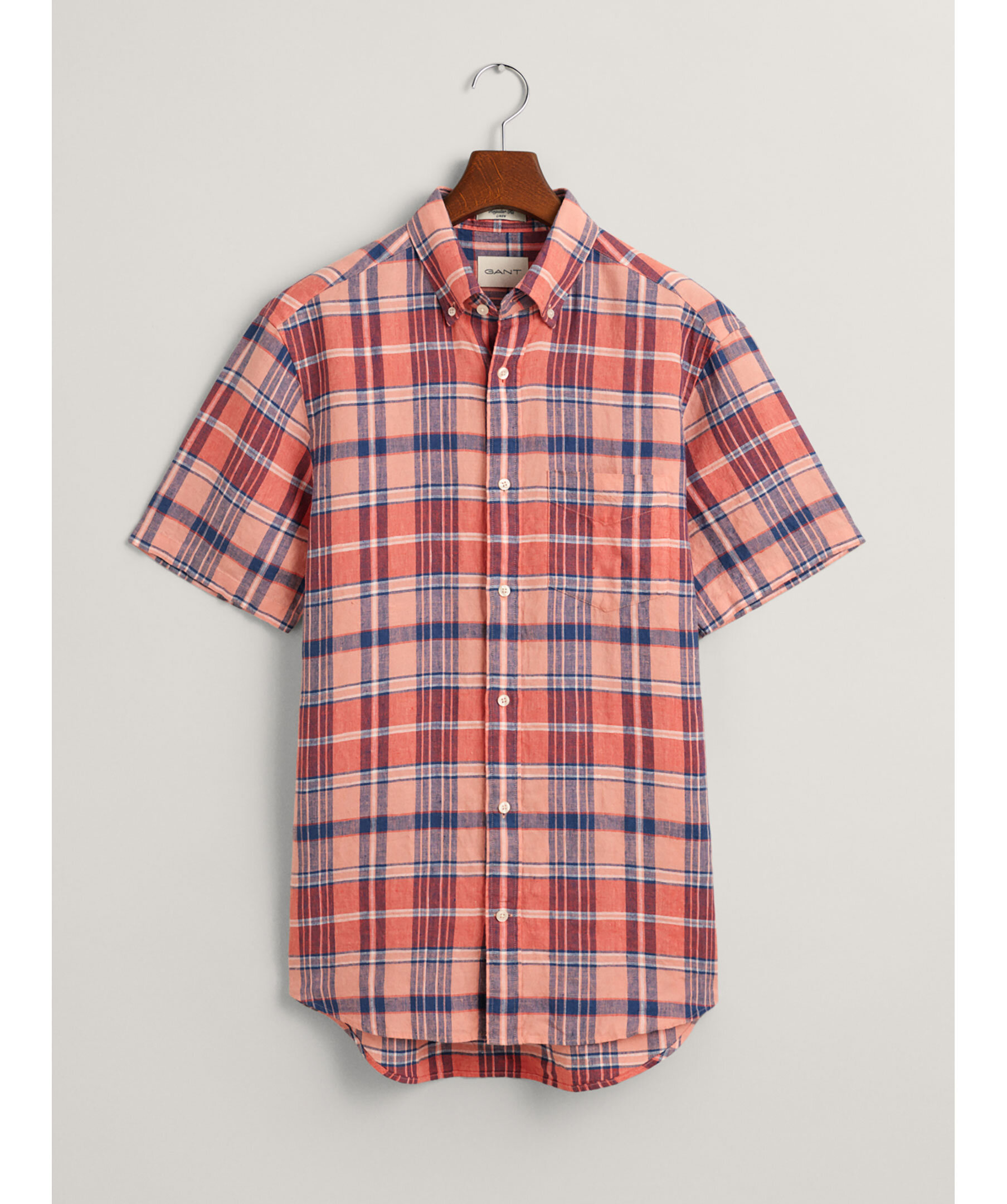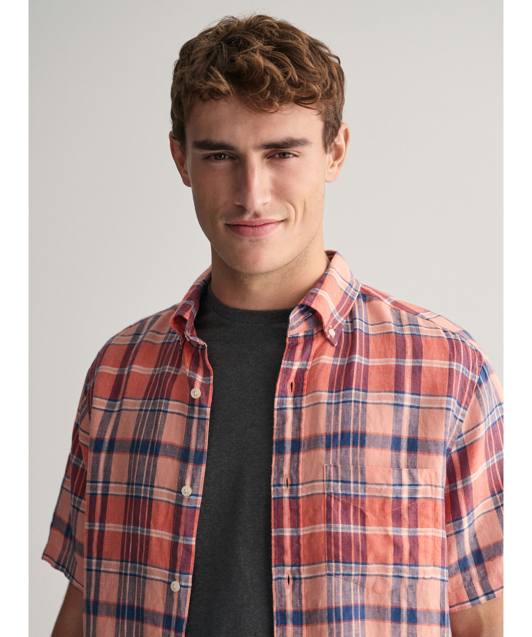 Rödrutig, kortärmad skjorta från Gant. Tillverkad i 100% linne som är naturligt luftigt med god andningsförmåga. Button down-krage, rundad fåll, bröstficka med broderad logotyp samt boxpleat med locker loop på ryggen. Normal passform.
