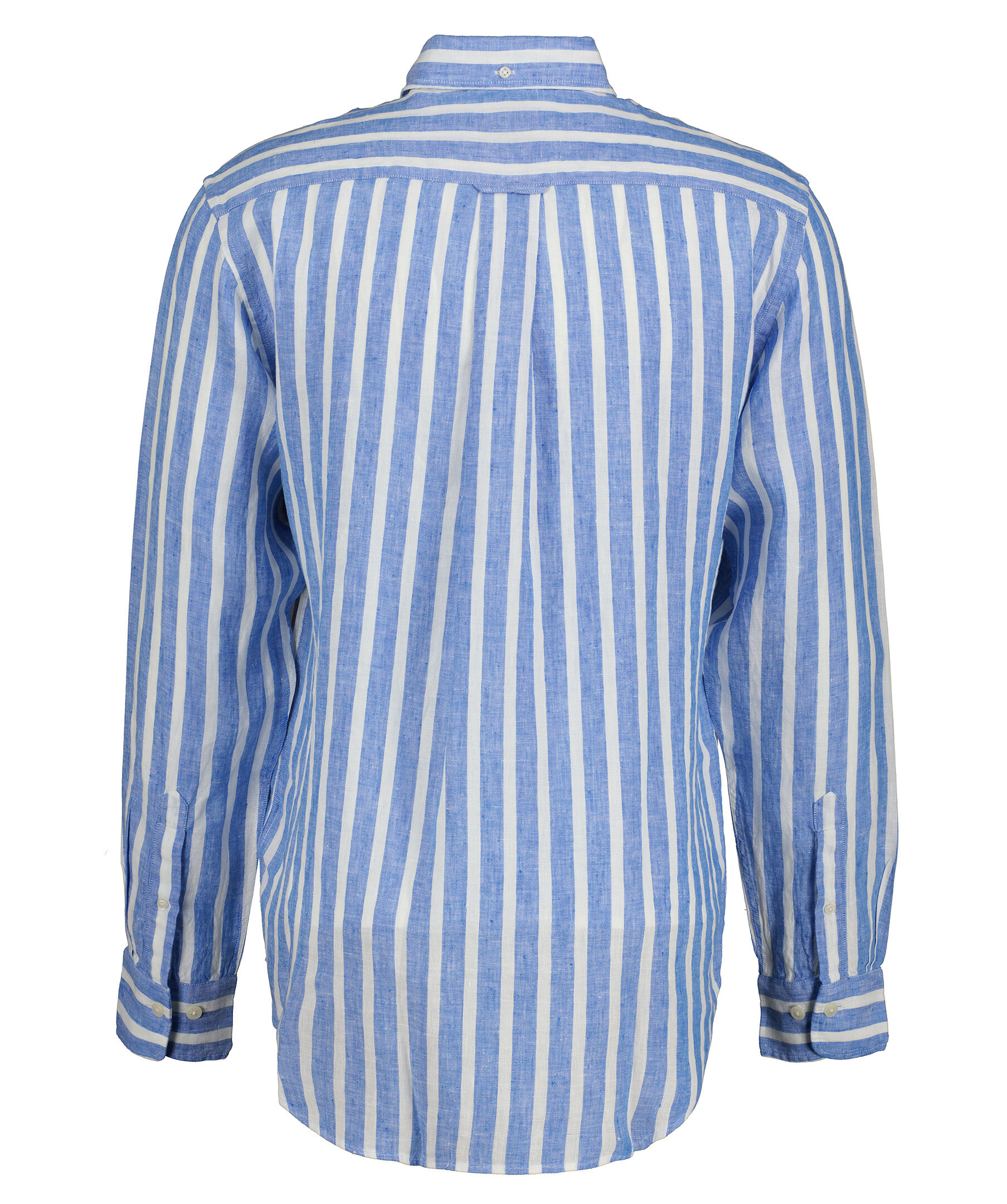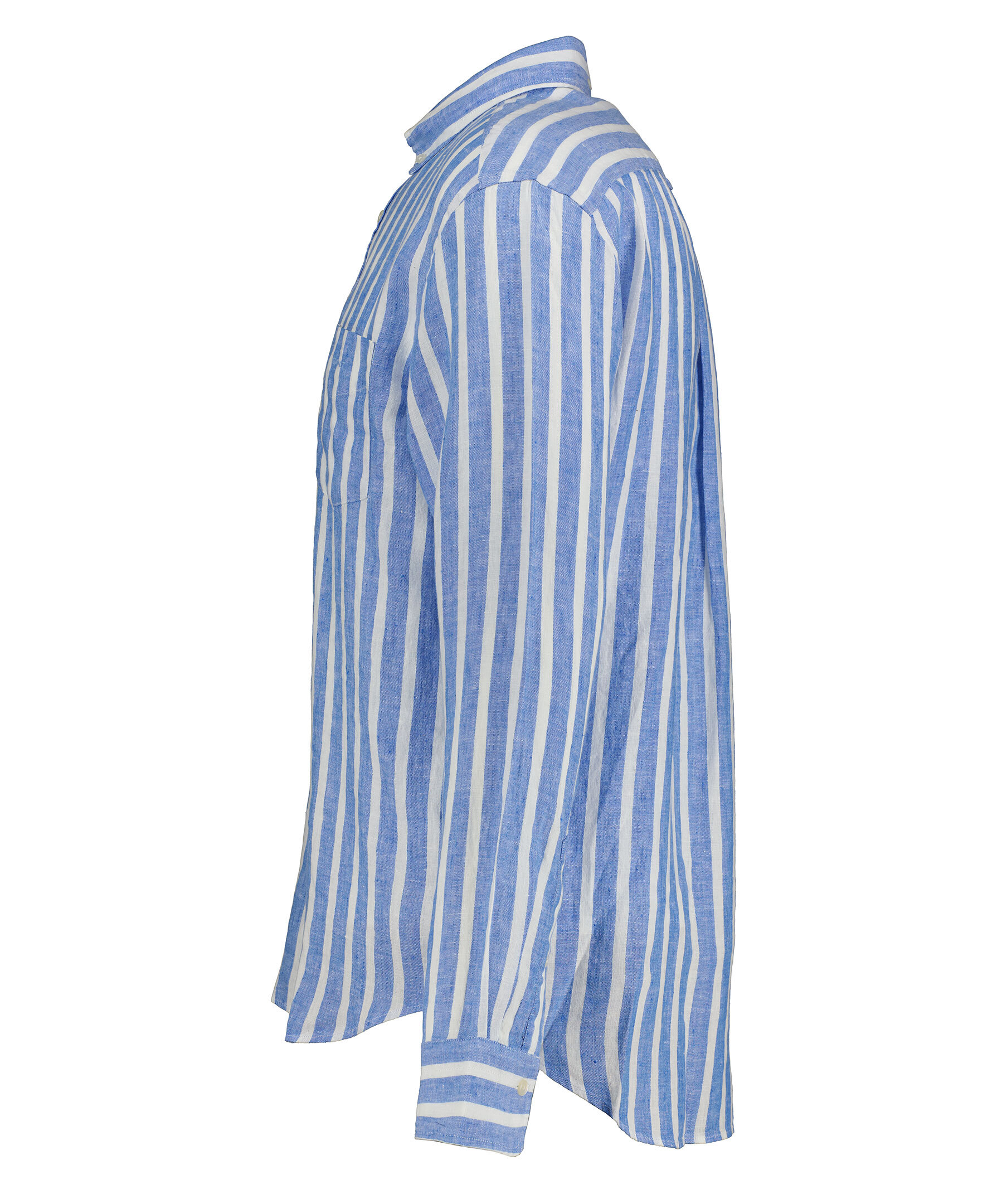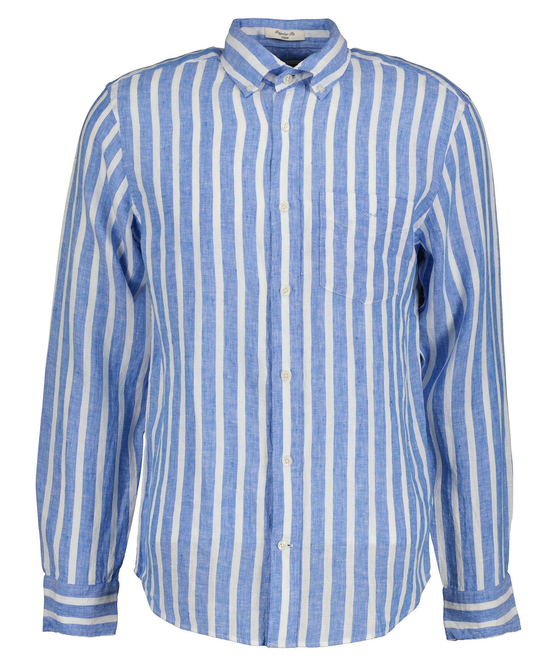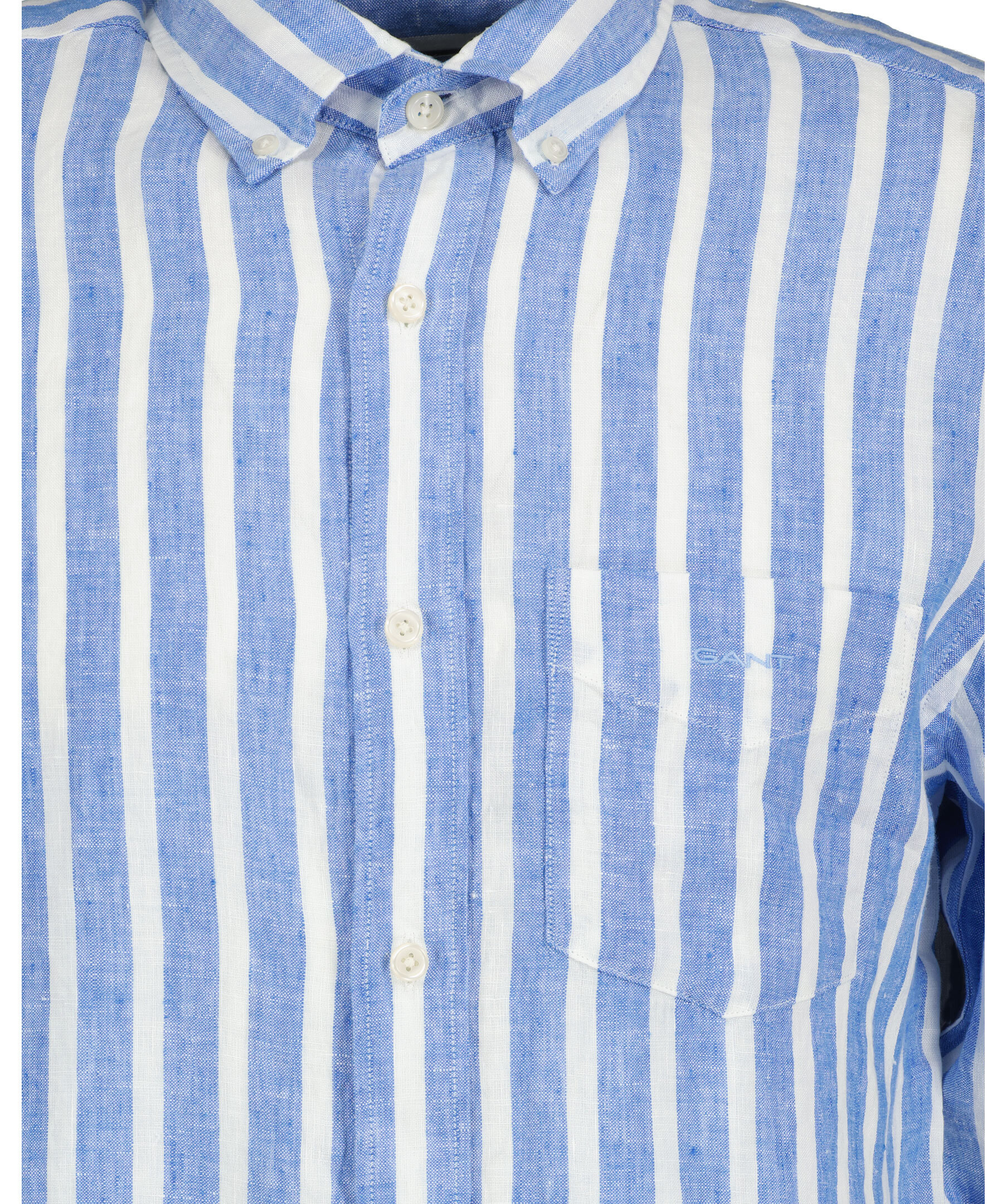 Himmelsblå och vit randig linneskjorta i ett perfekt sommarmaterial med yarn-dyed tvätt från Gant. Tillverkad i 100% lin. Broderad GANT-logotyp på bröstfickan. Skjortan har en rundad fåll och normal passform. Boxpleat med locker loop i ryggen.