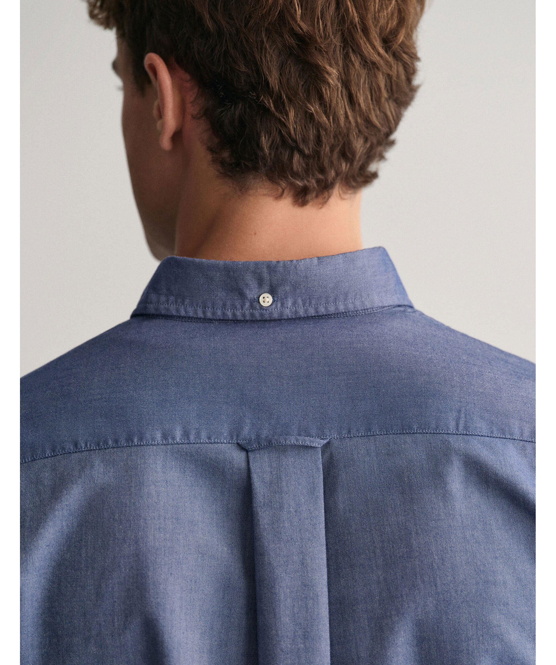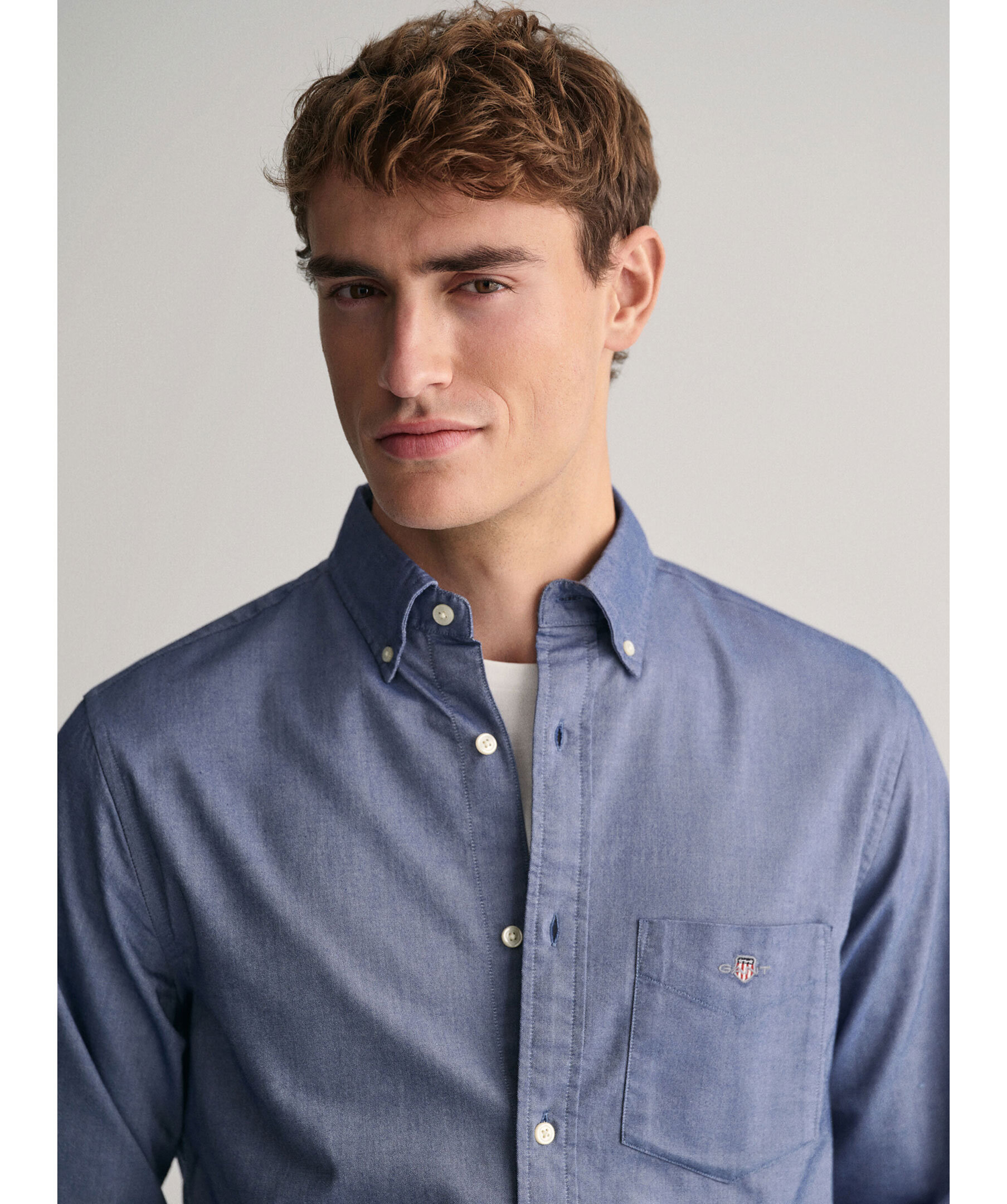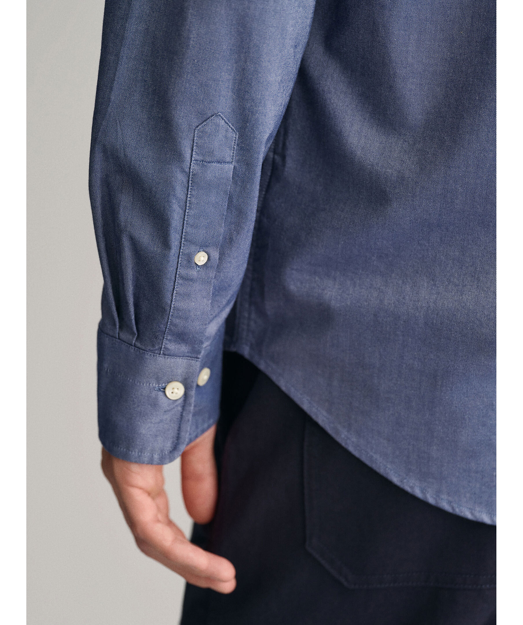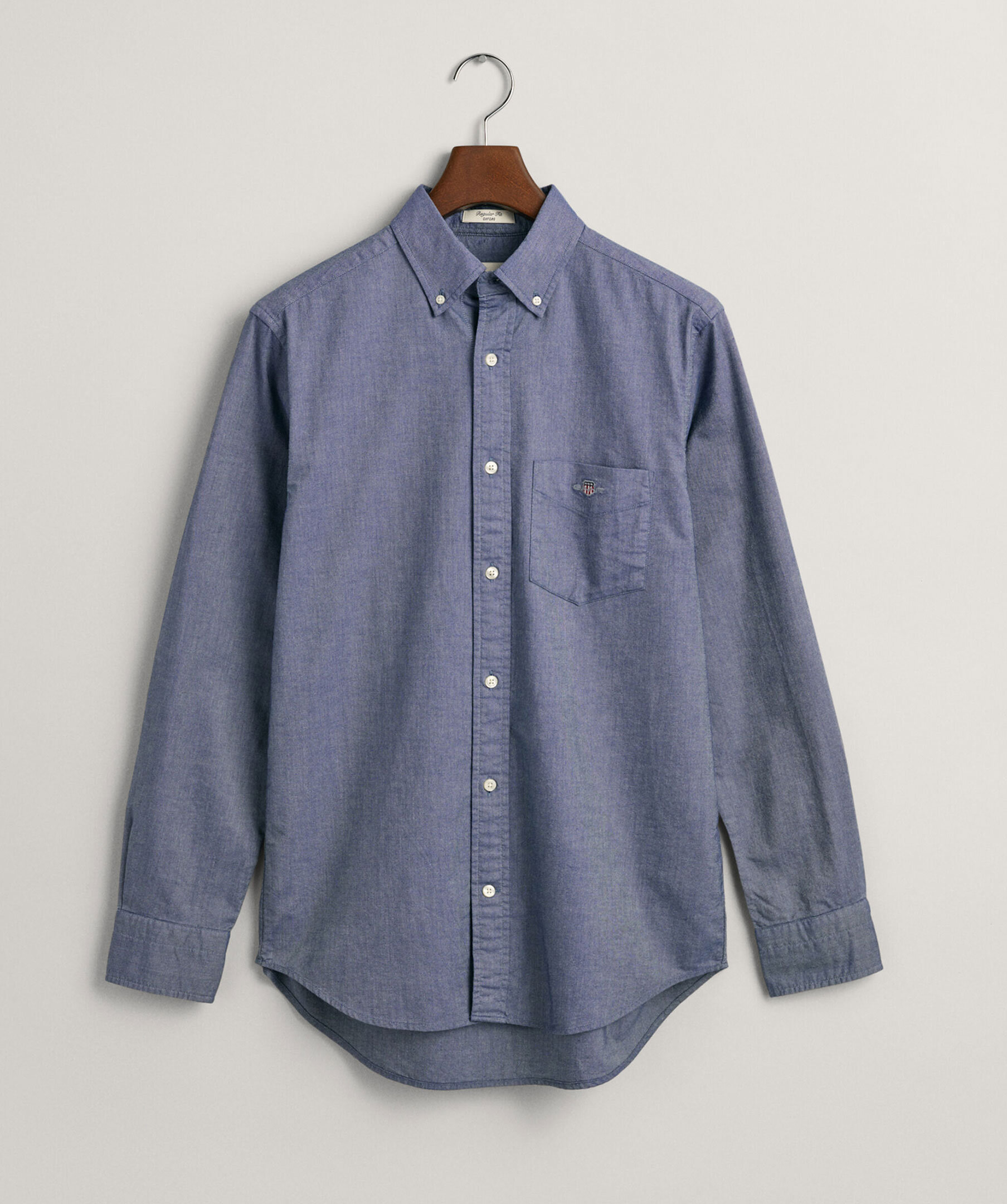 Blå oxfordskjorta i slitstark bomull från Gant. Skjortan har en 80-talsinspirerad sköldlogotyp med retrokänsla på bröstfickan. Skjortan har button down-krage och rundad fåll och är perfekt för businessgarderoben. Boxpleat med locker loop i ryggen och justerbara manschetter.