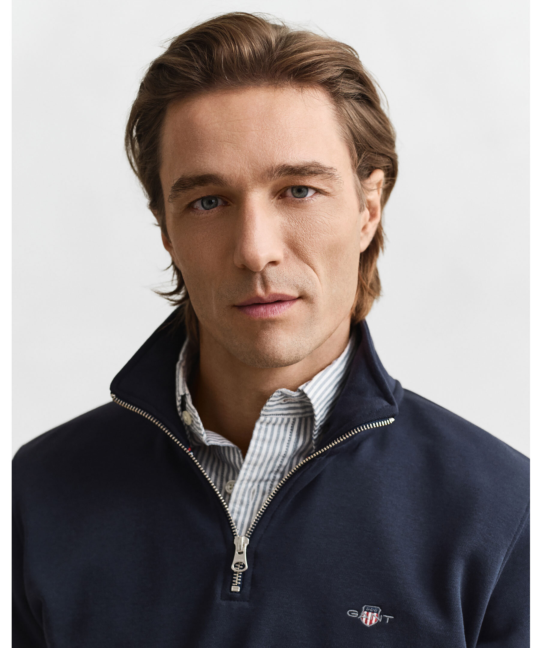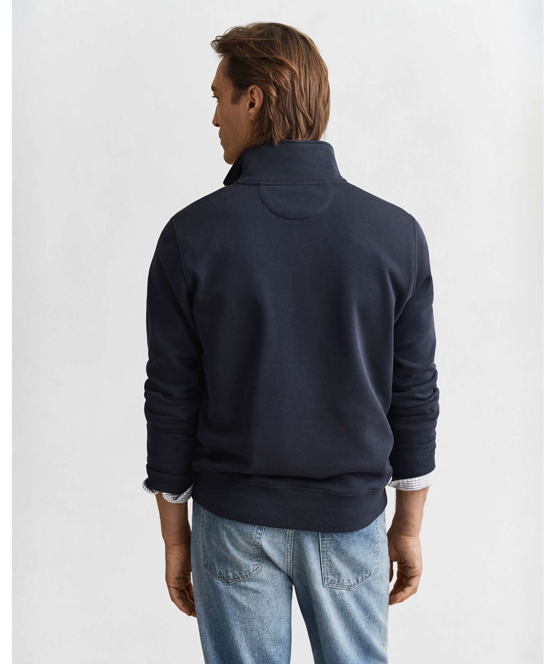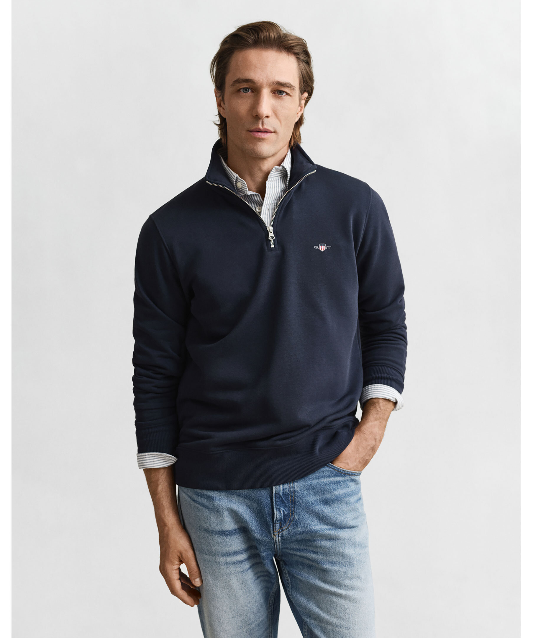 Marinblå, half-zip från Gant. Ribbade muddar och tillverkad i en bomullsblandning.