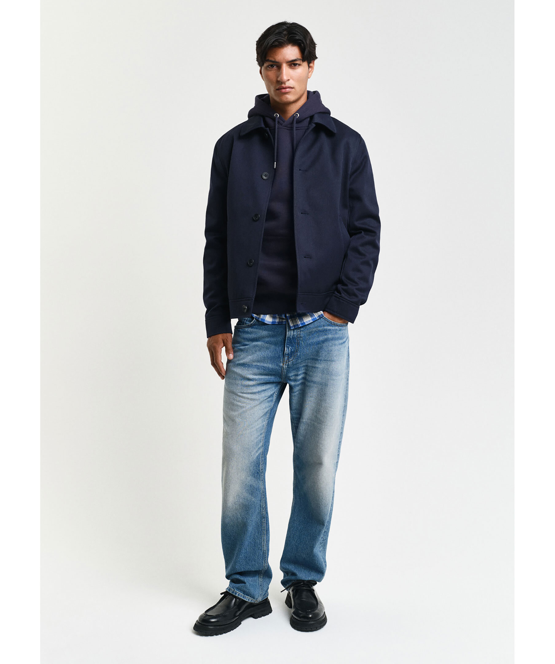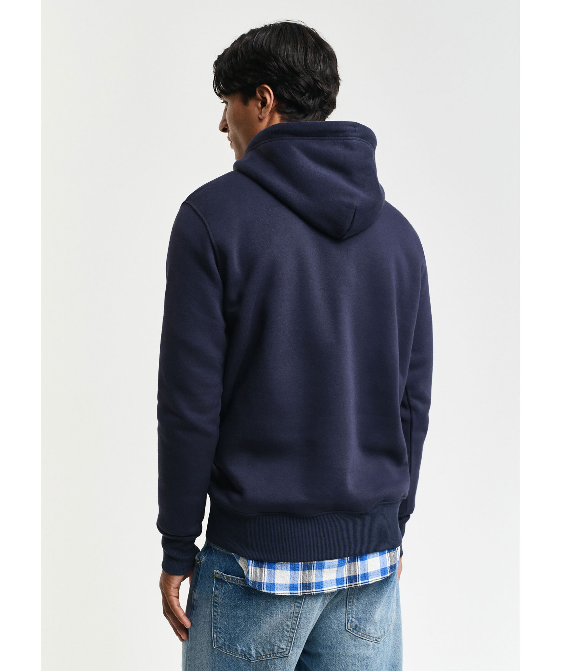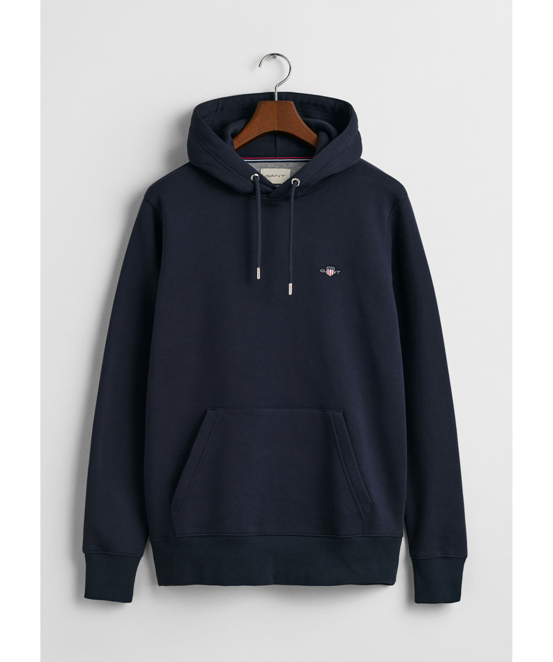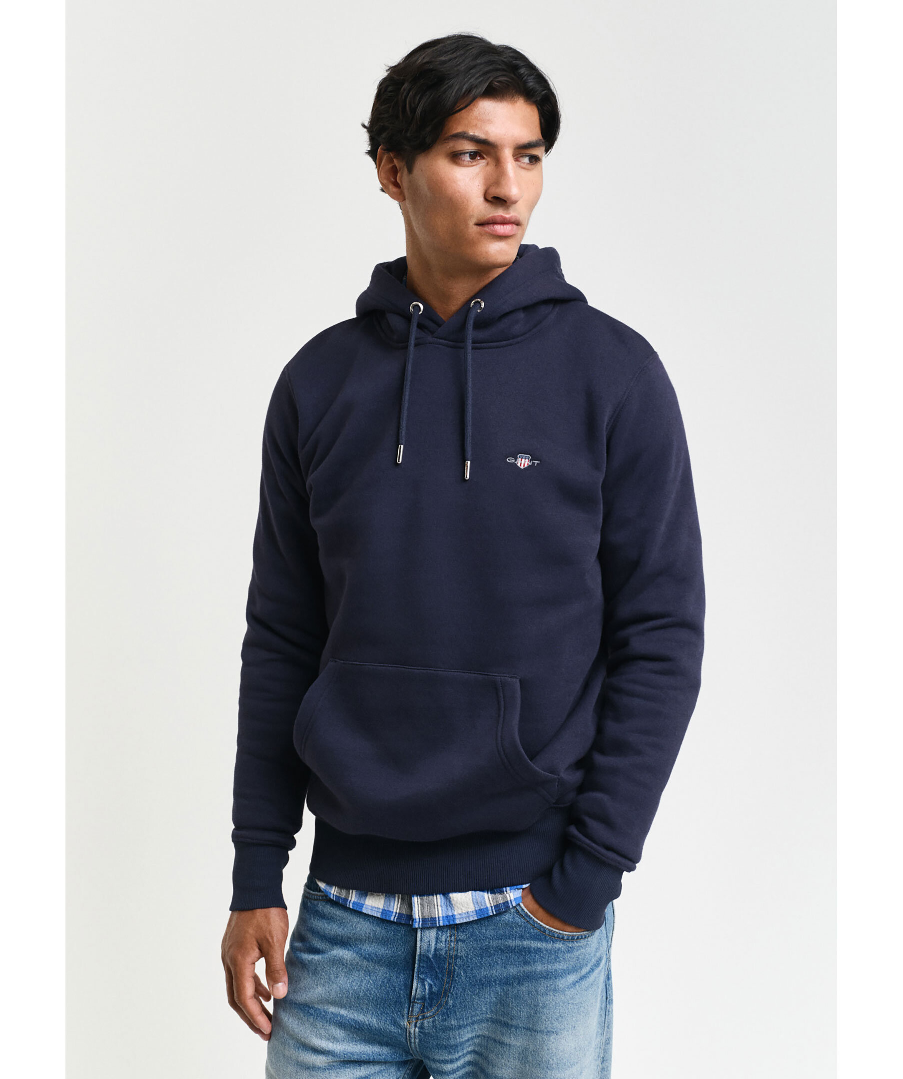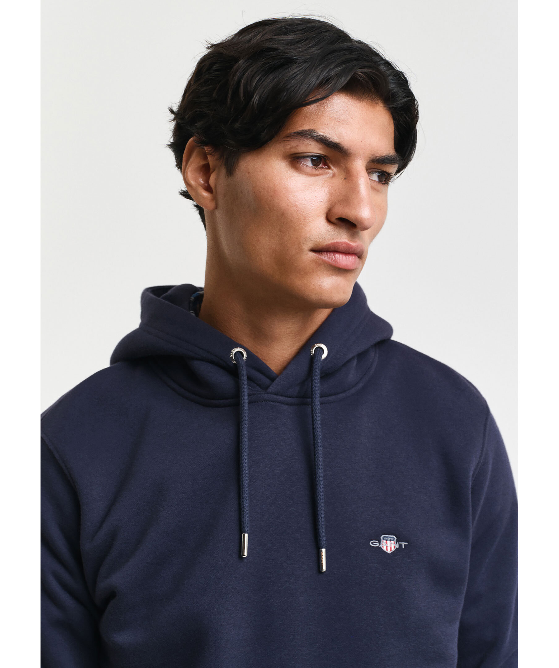 Mörkblå hoodie från Gant. Hoodien har huva, känguruficka på magen, ribbstickade muddar vid ärm- och plaggslut samt broderad Gant-logotyp på bröstet. Tillverkad i en bomullsblandning.