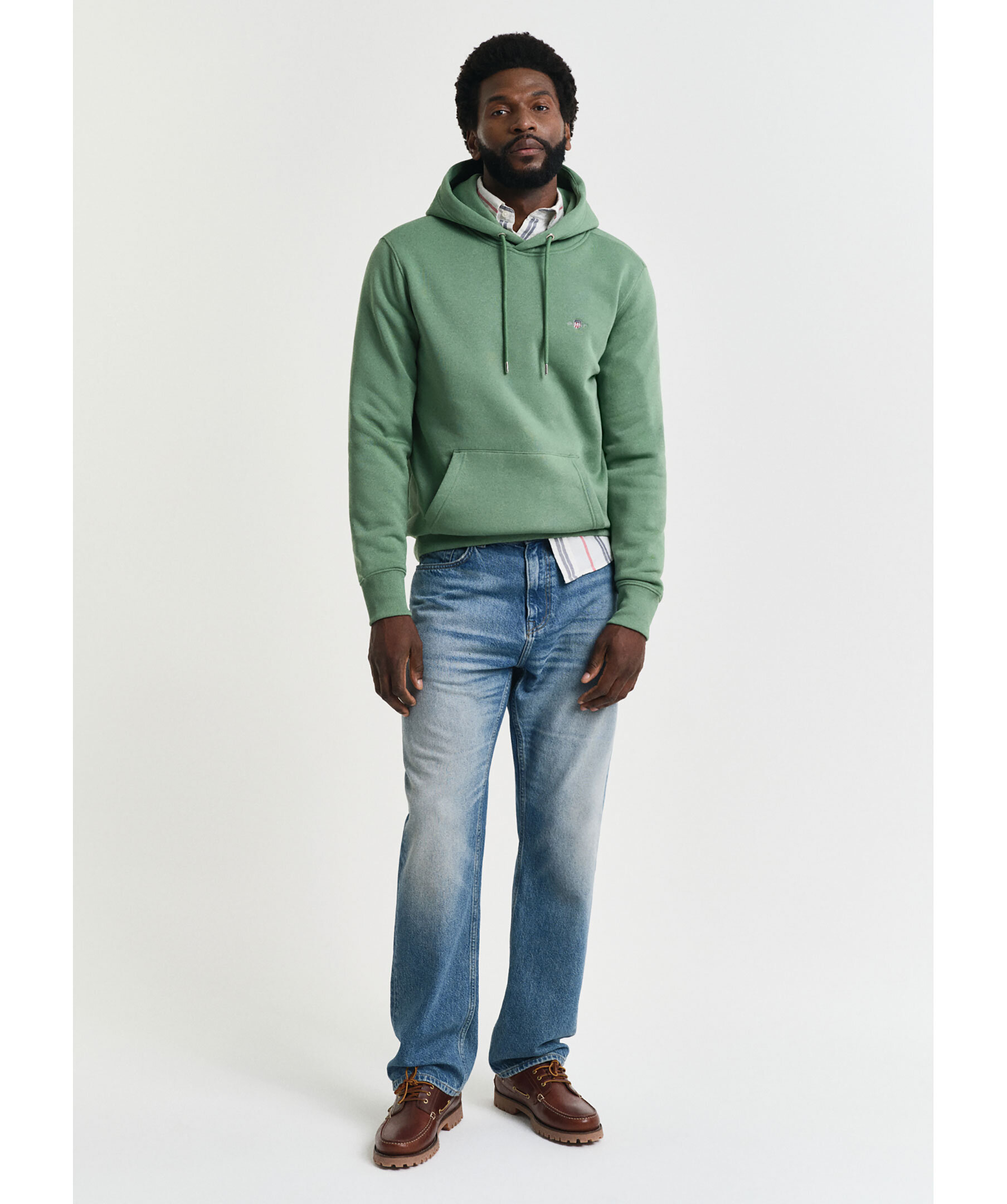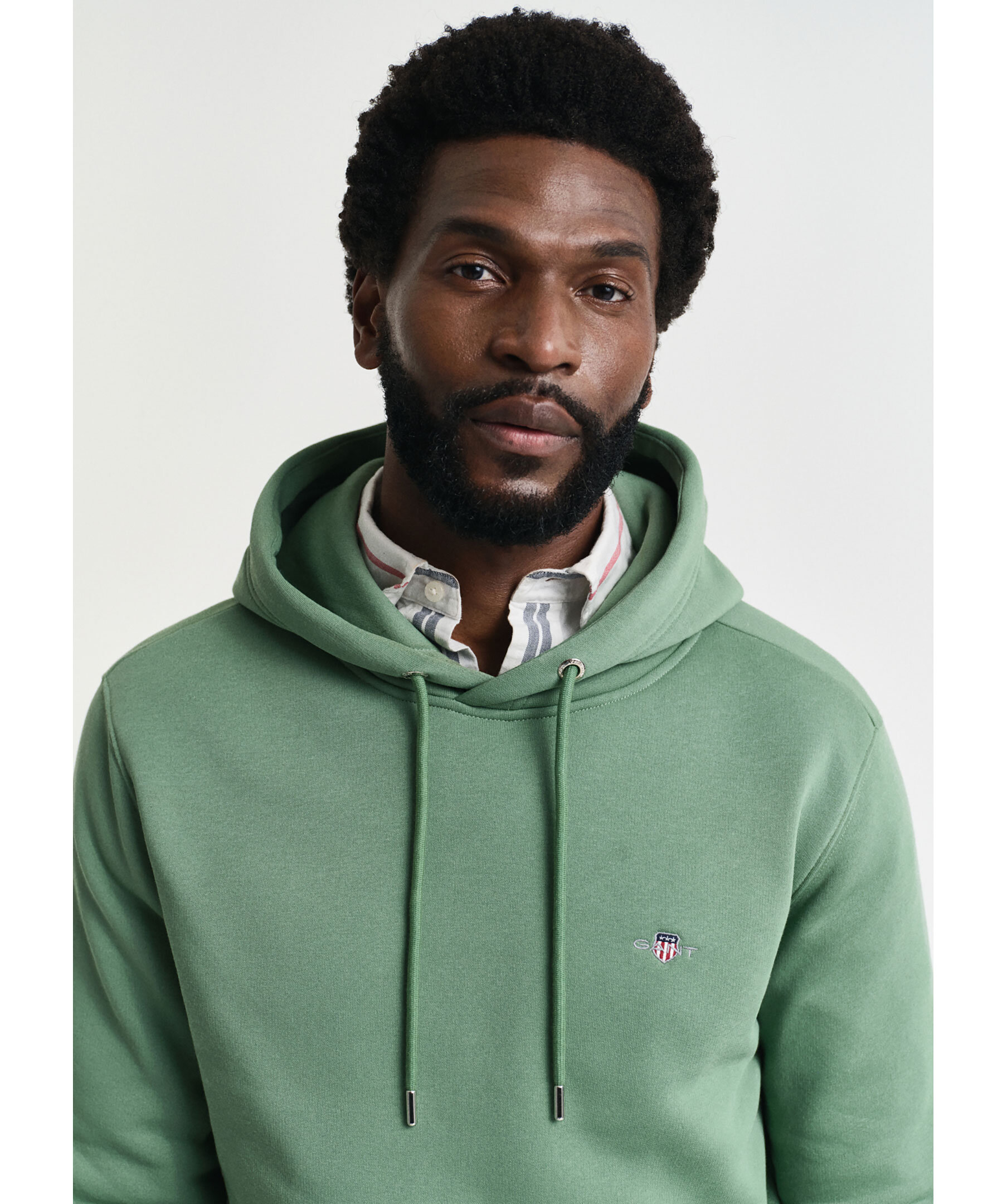 Grön hoodie från Gant. Hoodien har huva, känguruficka på magen, ribbstickade muddar vid ärm- och plaggslut samt broderad Gant-logotyp på bröstet. Tillverkad i en bomullsblandning.