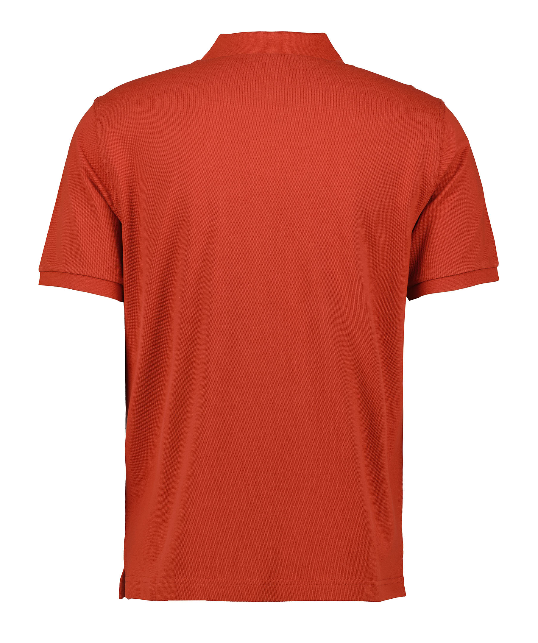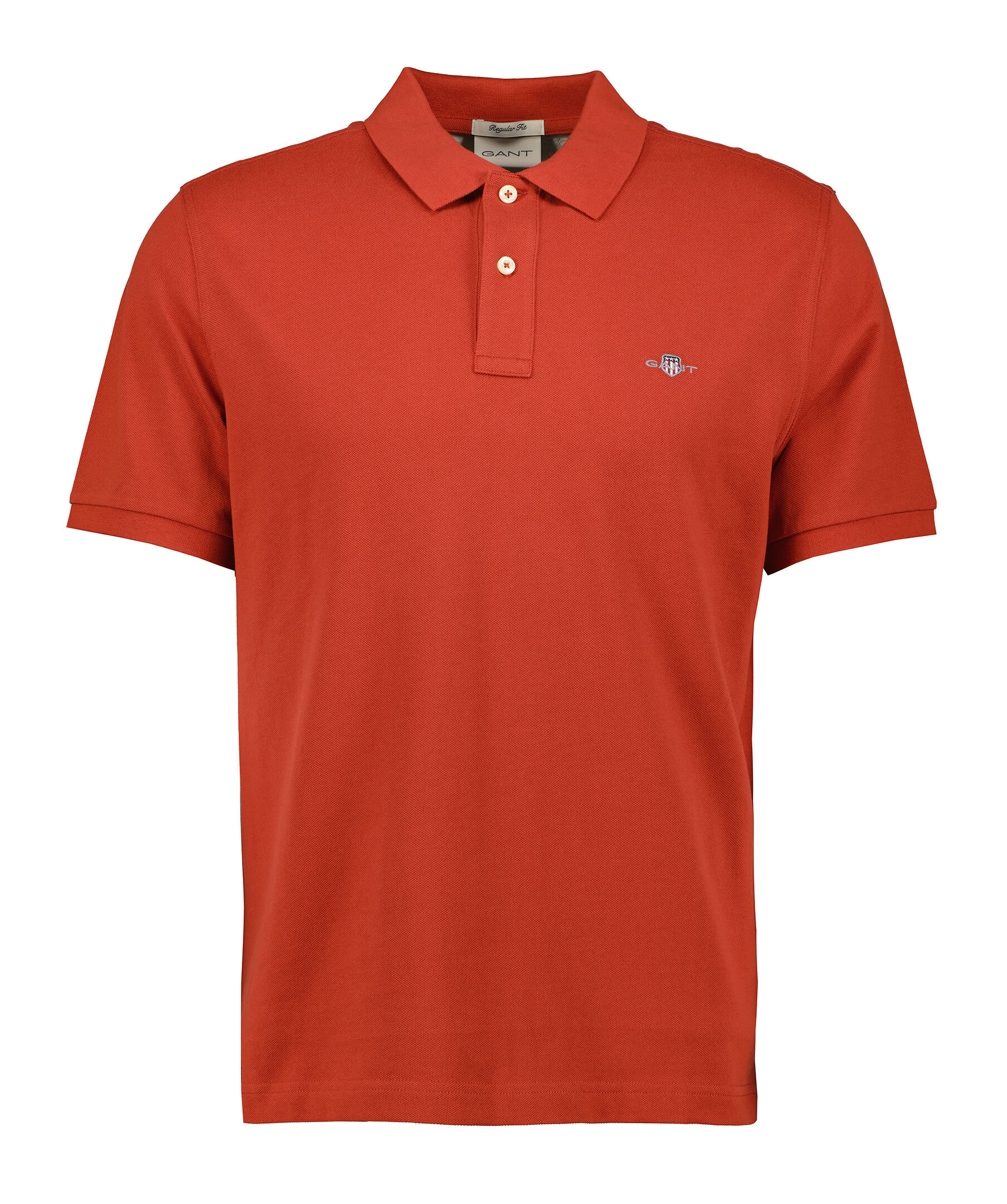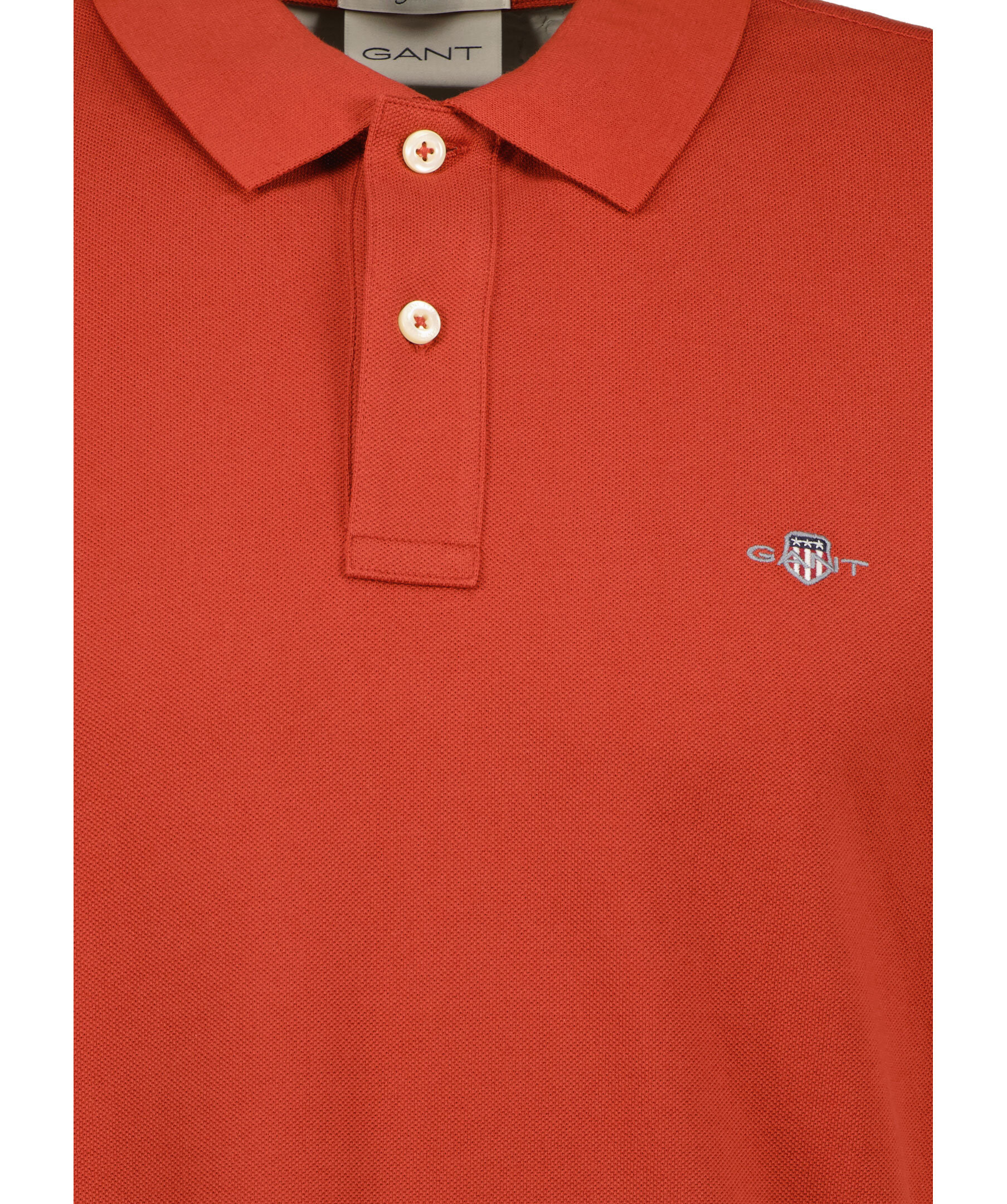 Röd pikétröja från Gant. Pikén har en klassisk slätstickad krage, knappslå med två knappar, korta sidosprund och broderad Gant-logotyp på bröstet. Tillverkad i bomull.