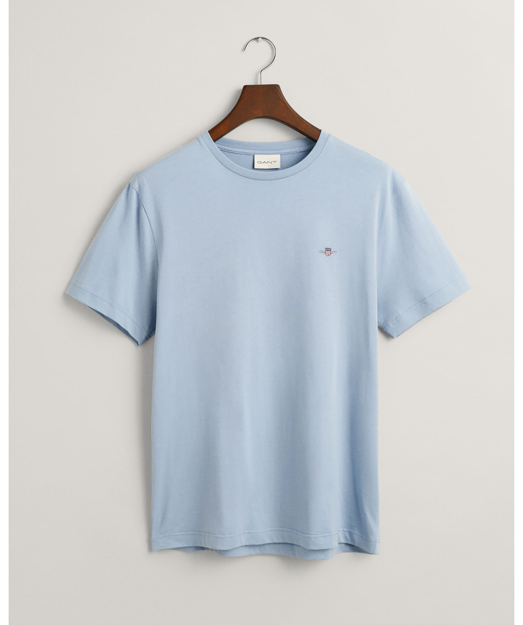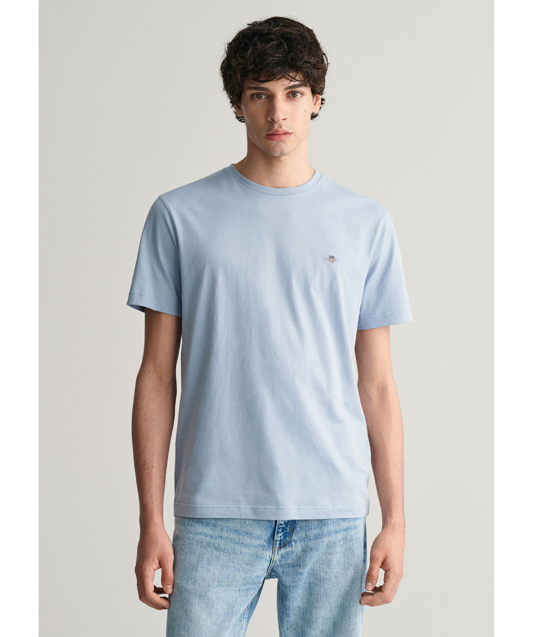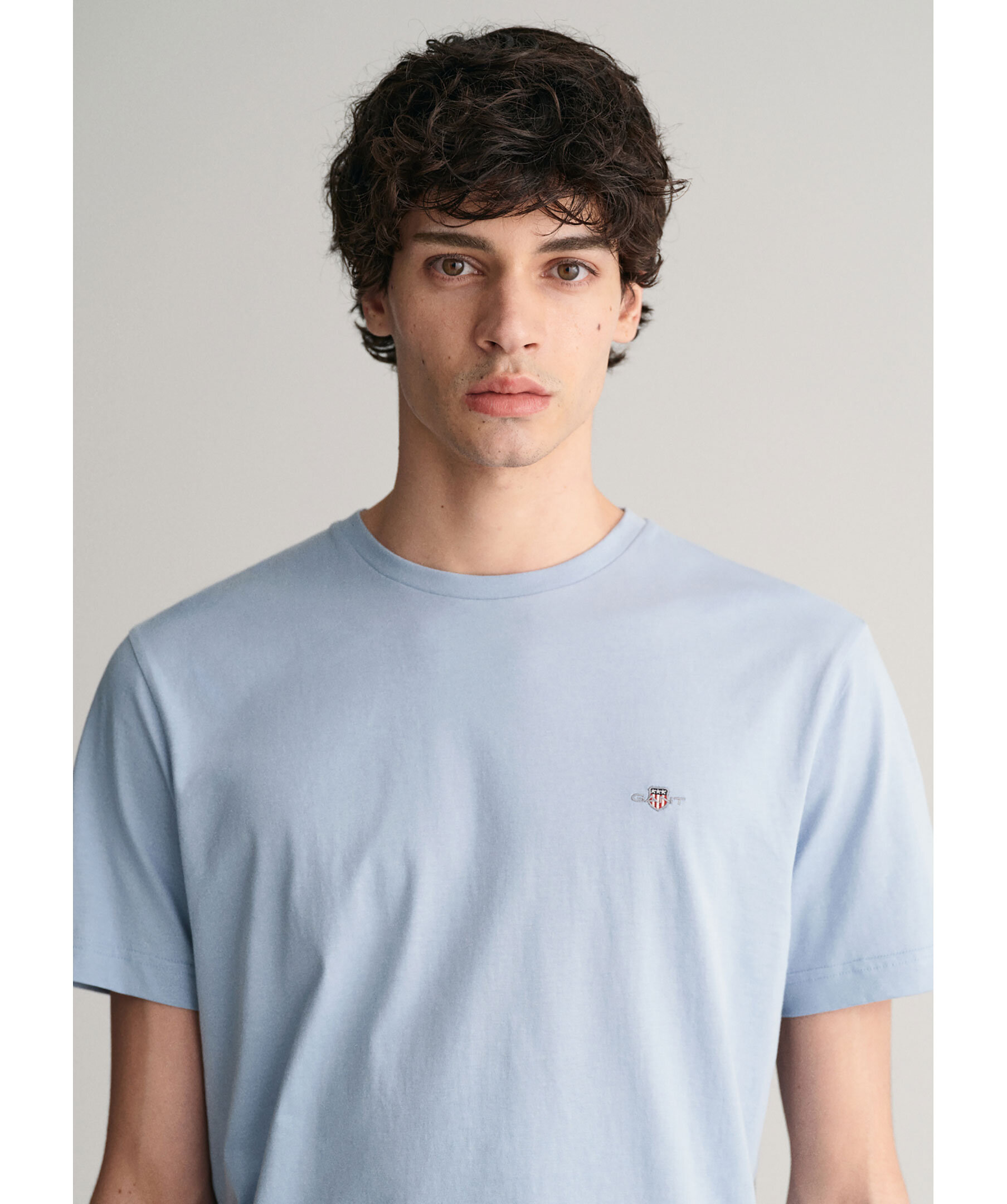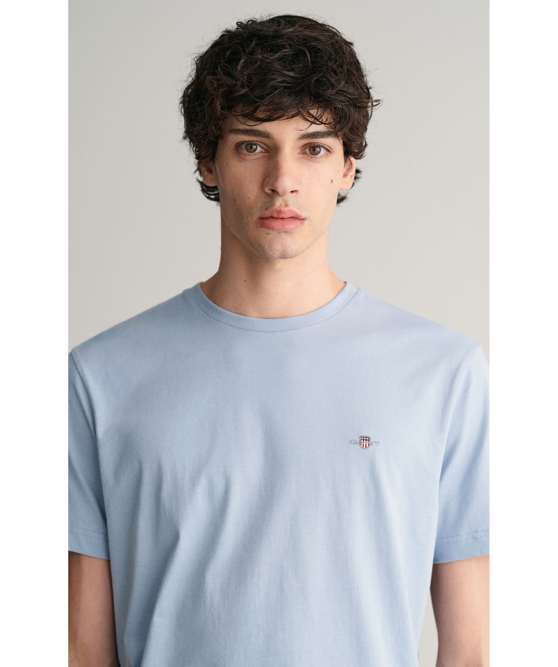 Dovt blå t-shirt med en liten sköldlogotyp broderad på bröstet, gjord i bomull med en fin ribbstickning i halsringningen för ultimat komfort. Ett fantastiskt basplagg du kan använda separat eller under en stickad tröja, jacka eller matcha med jeans, chinos eller shorts.