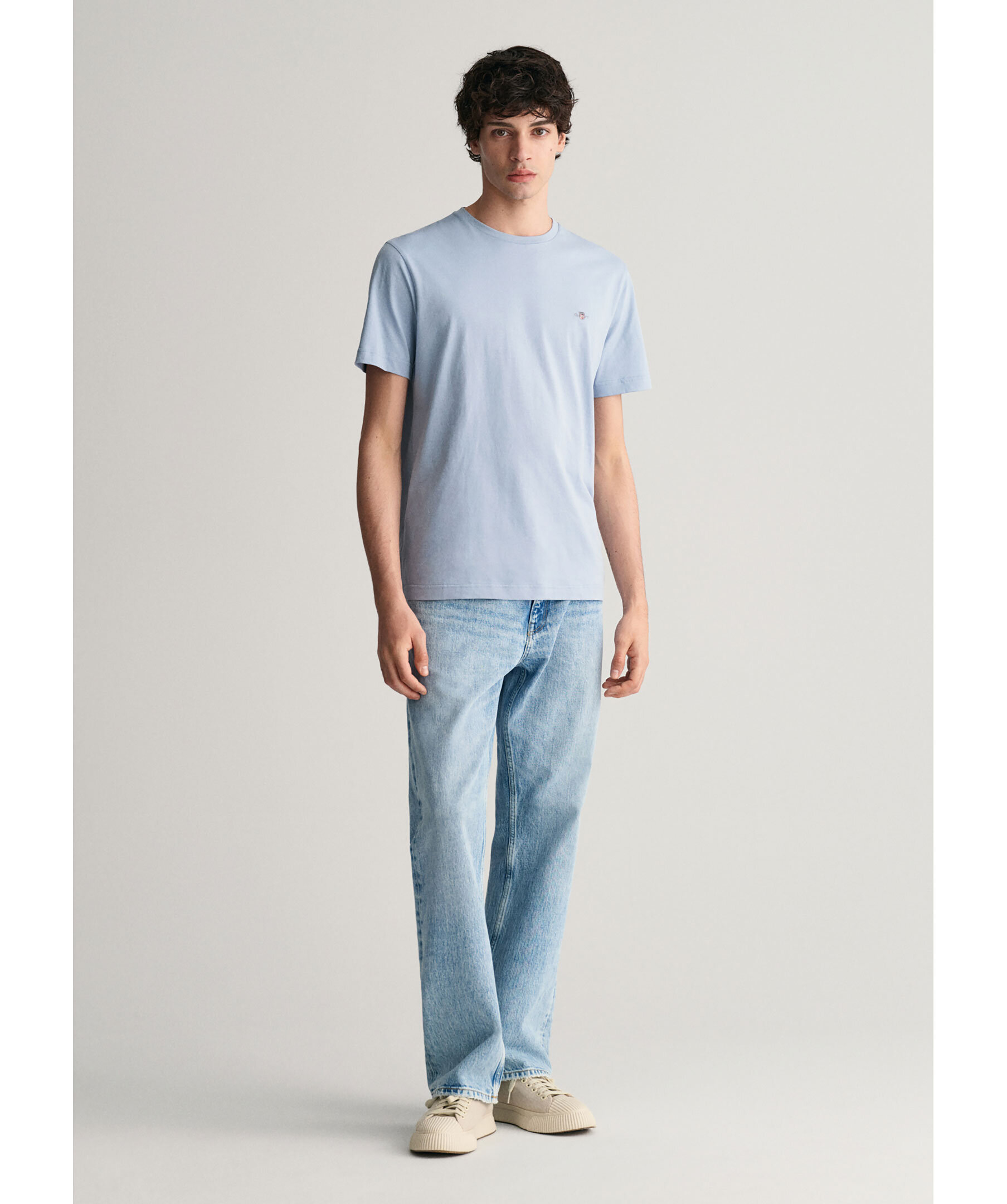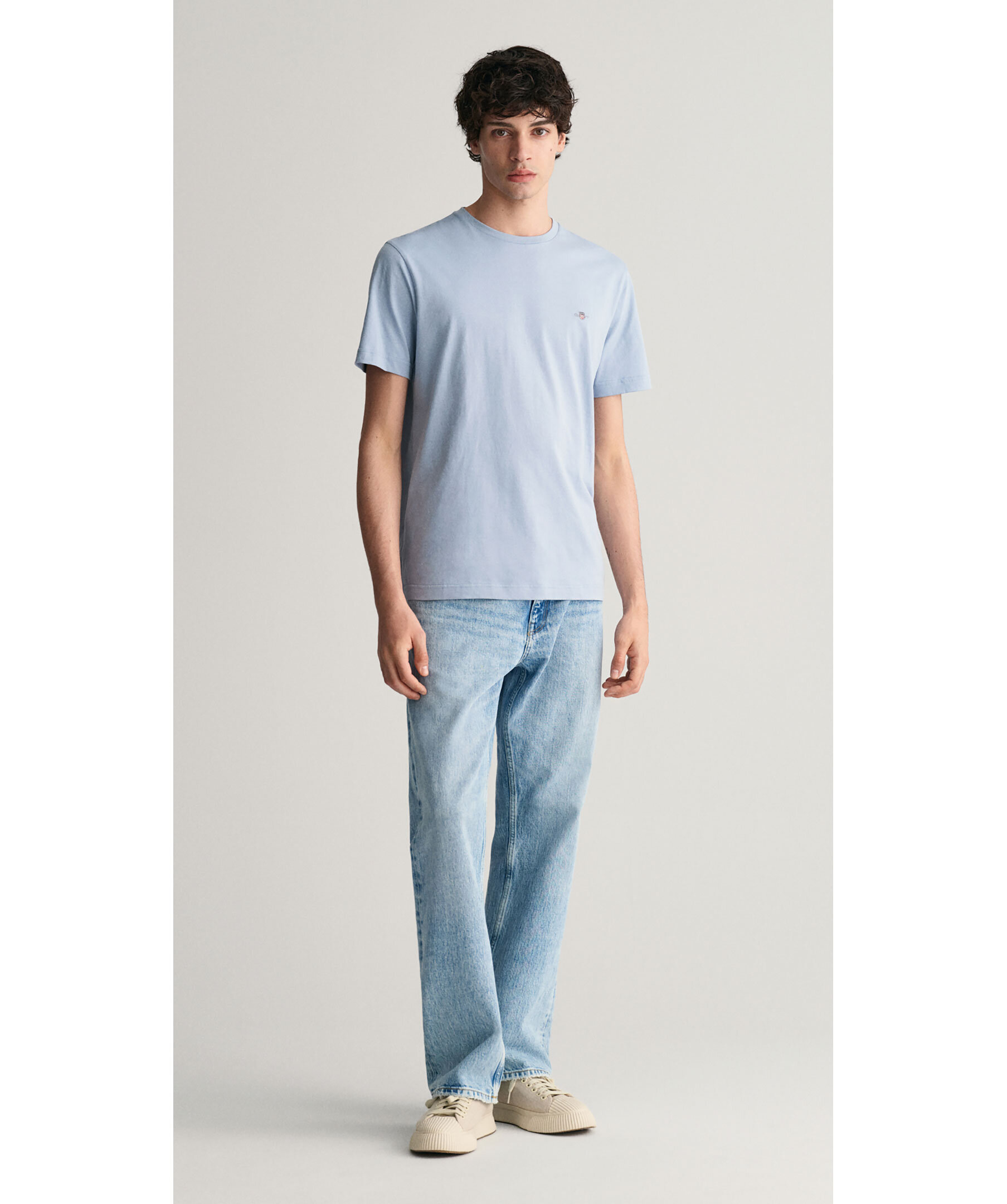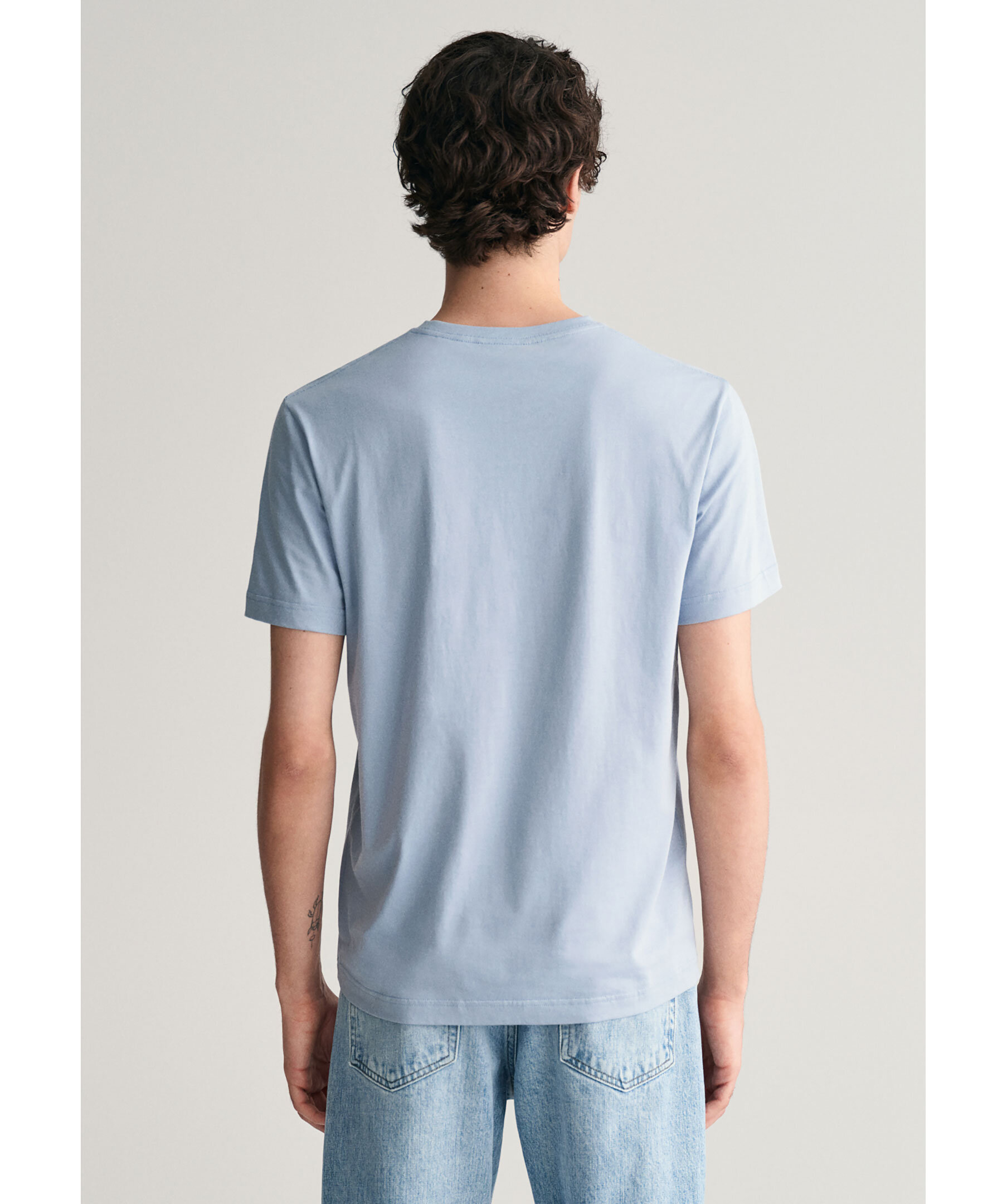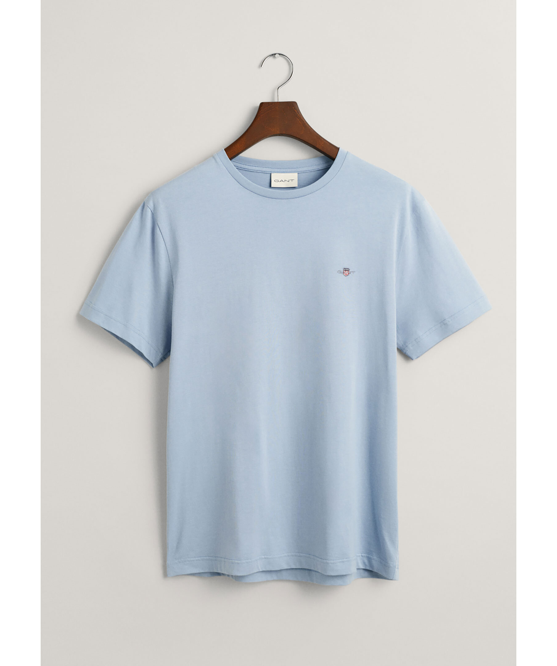 Dovt blå t-shirt med en liten sköldlogotyp broderad på bröstet, gjord i bomull med en fin ribbstickning i halsringningen för ultimat komfort. Ett fantastiskt basplagg du kan använda separat eller under en stickad tröja, jacka eller matcha med jeans, chinos eller shorts.
