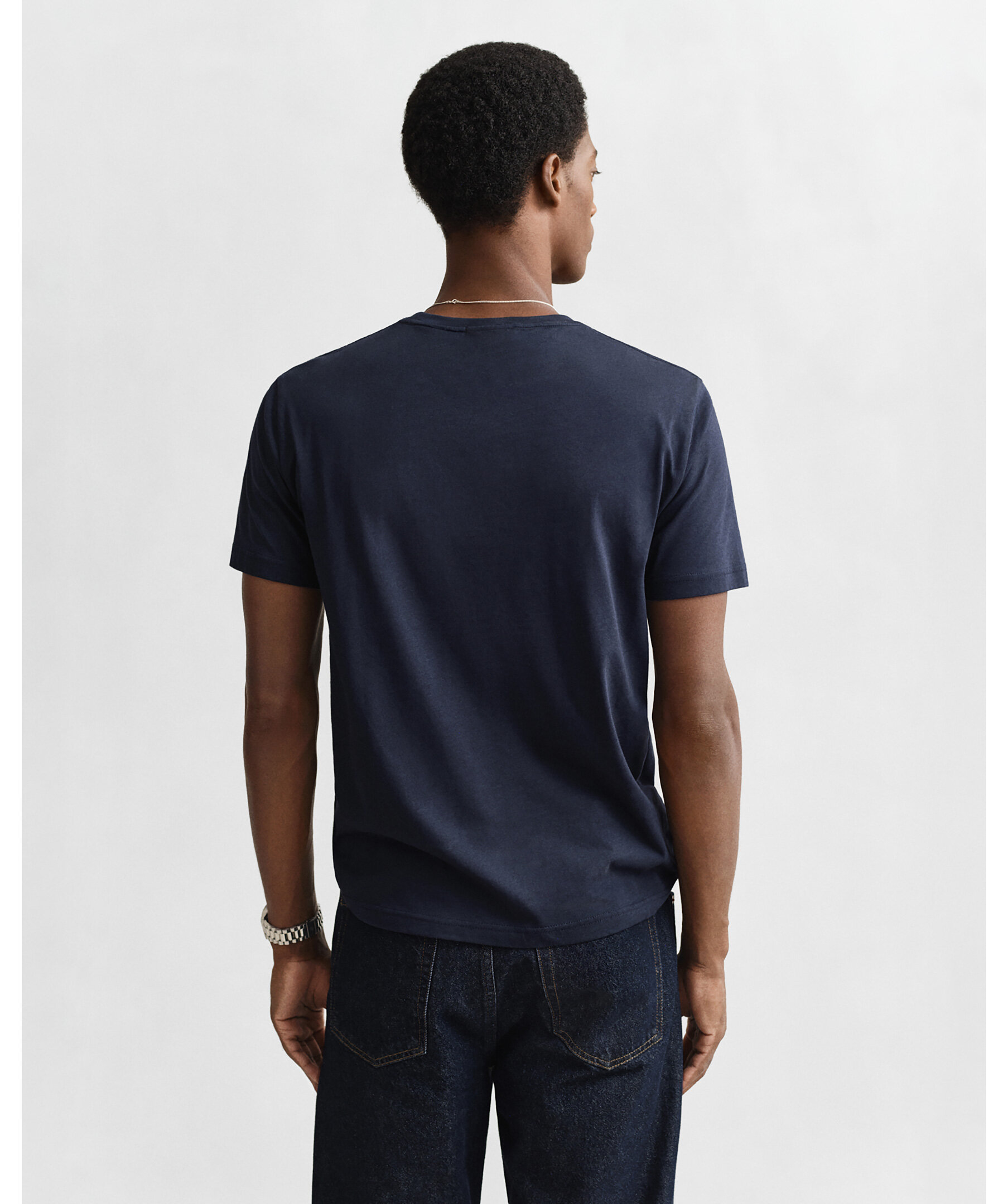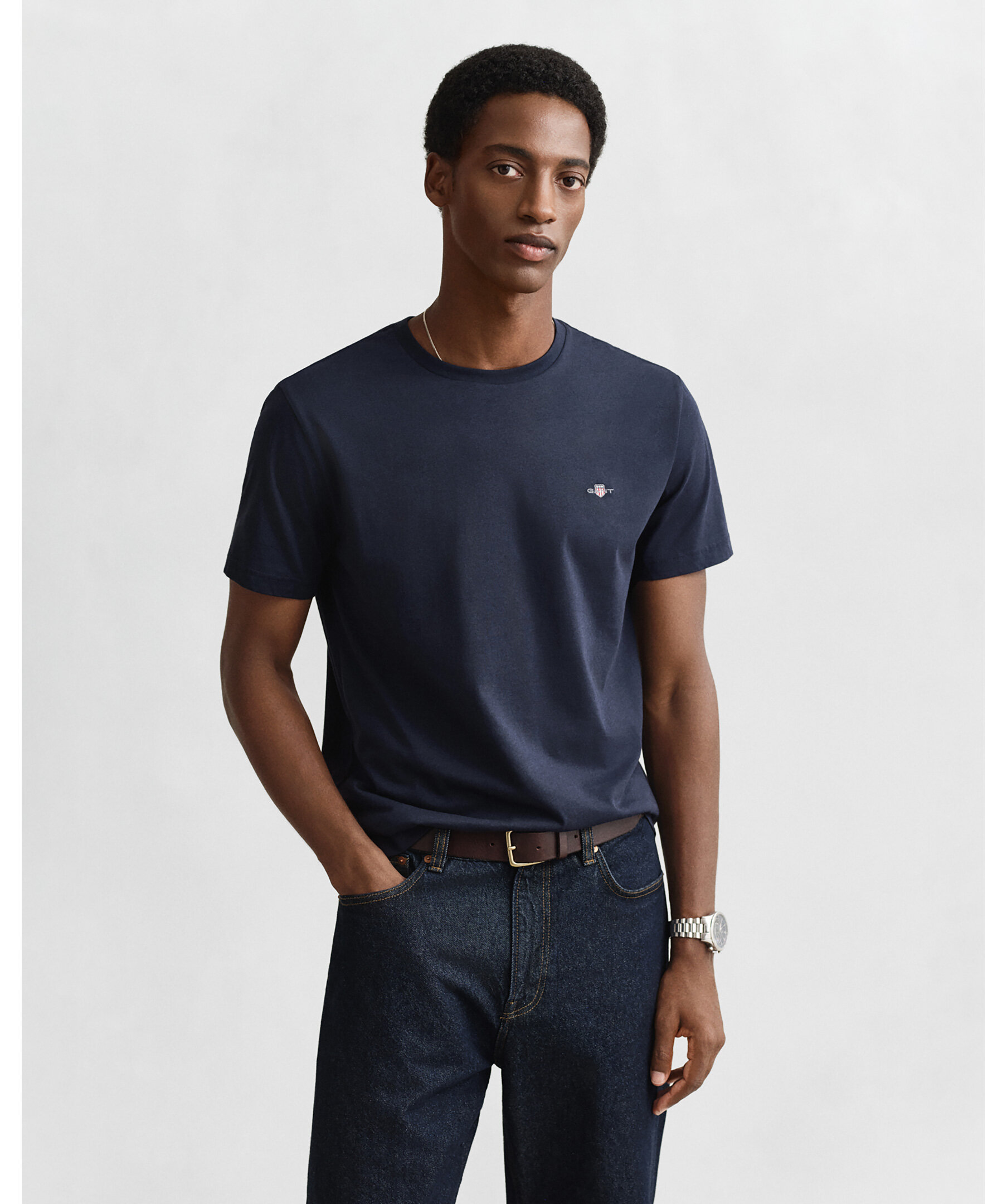 Marinblå t-shirt med en liten sköldlogotyp broderad på bröstet från Gant. Tillverkad i bomull med en fin ribbstickning i halsringningen för ultimat komfort. Ett fantastiskt basplagg du kan använda separat eller under en stickad tröja, jacka eller matcha med jeans, chinos eller shorts.