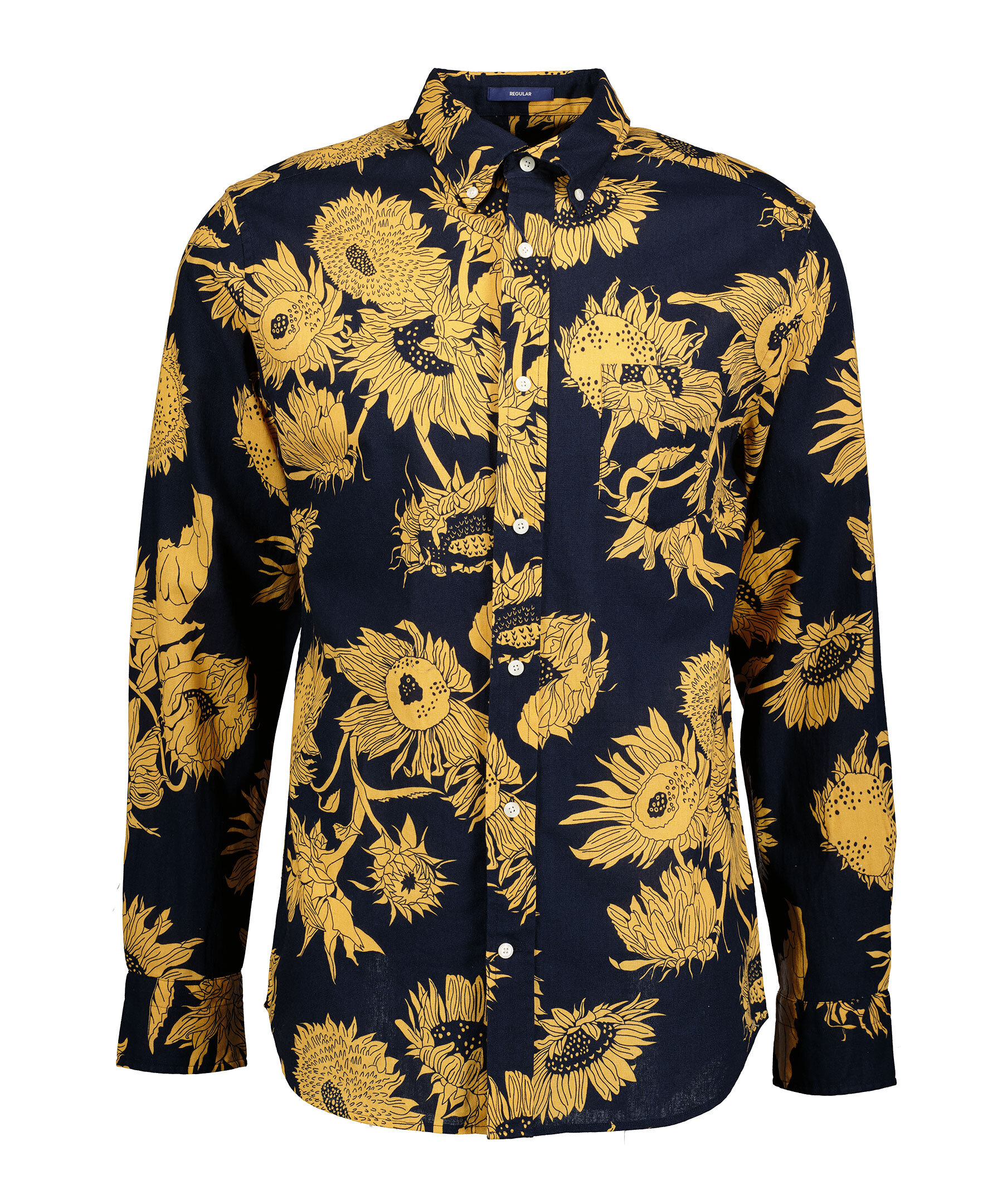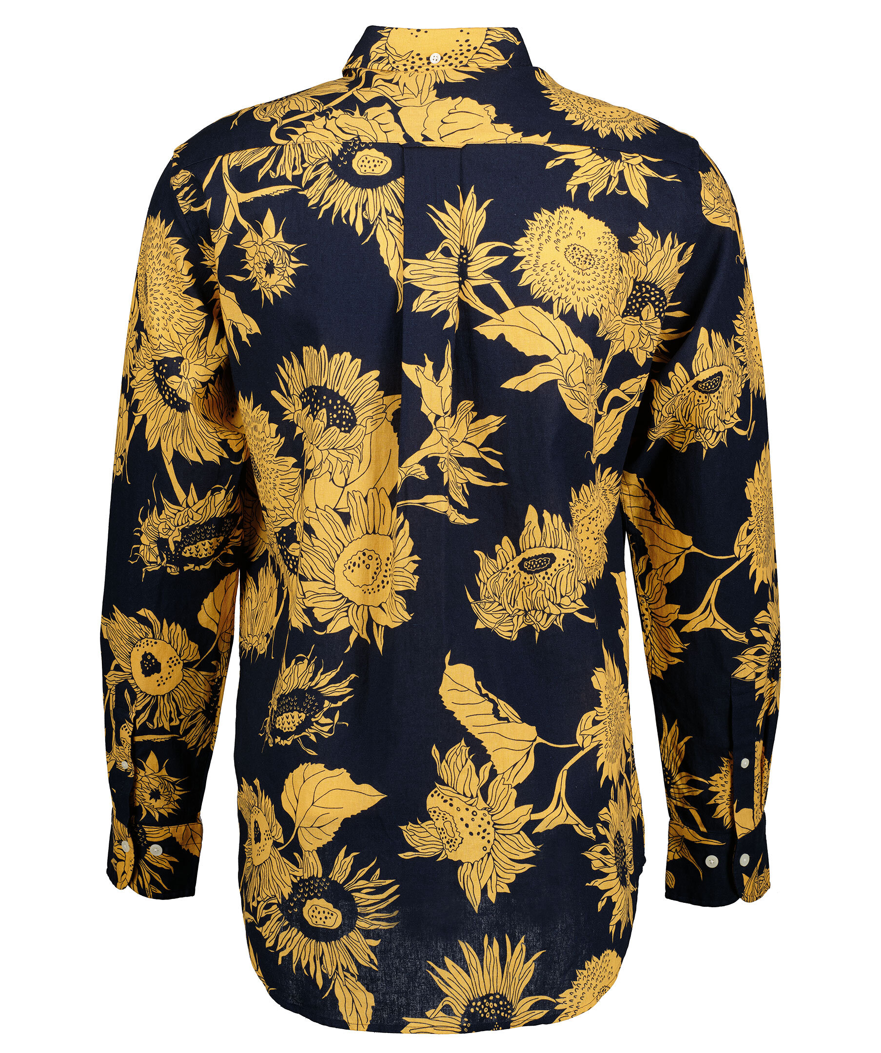 Mörkblå och gul mönstrad skjorta från Gant. Buttondown krage. Bröstficka på vänster sida. Enkla manschetter. Broderad logotyp på ärmslån. Boxpleat och locker loop i ryggen. Tillverkad i Linne och bomullsblandning.