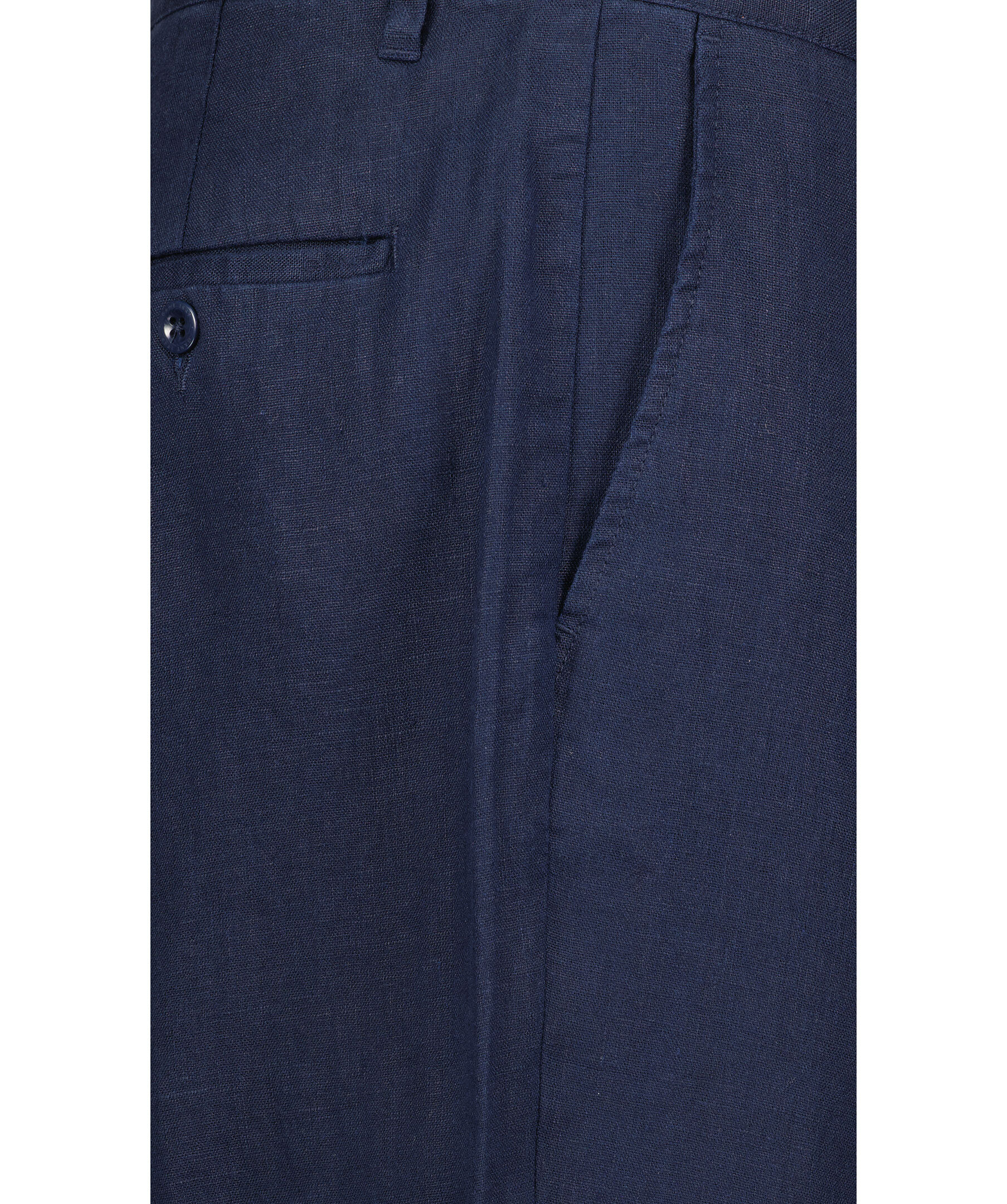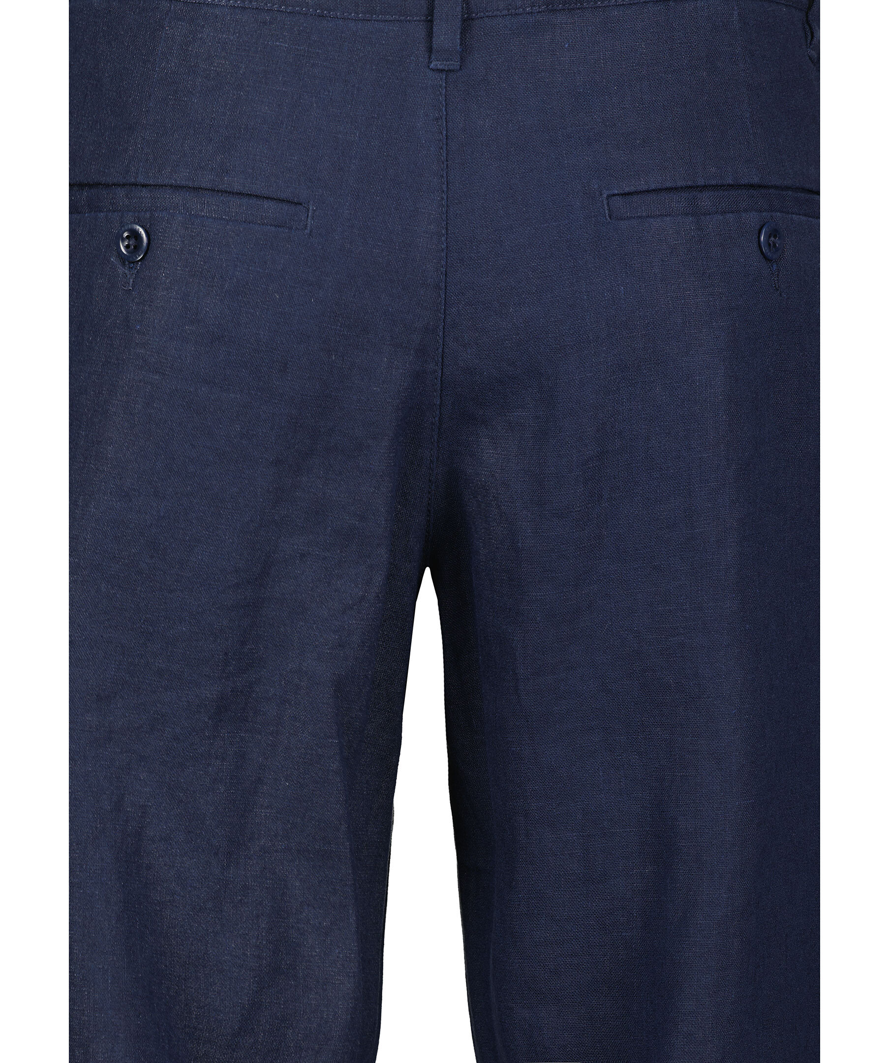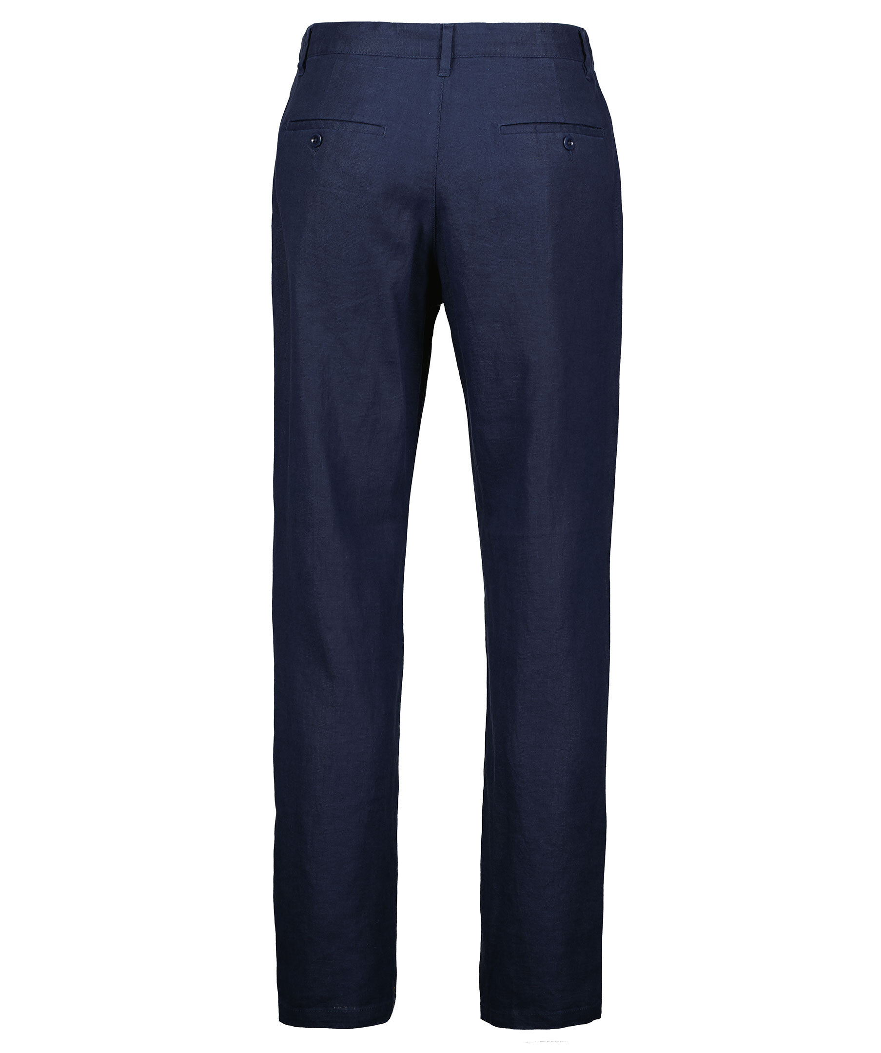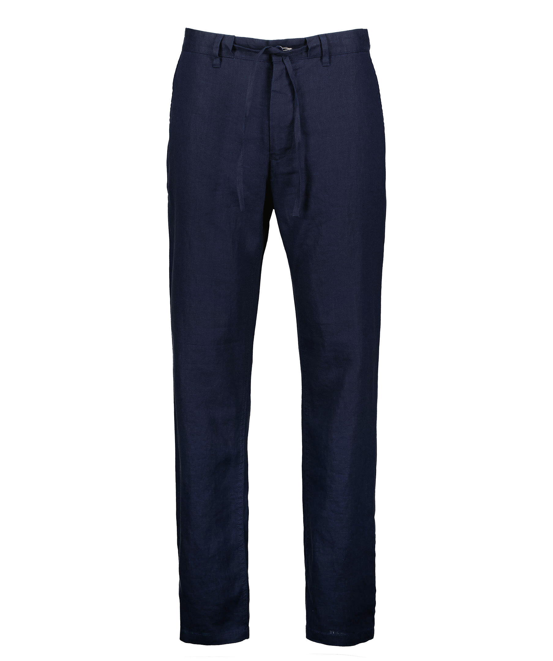 Mörkblå byxor i linne från Gant. Dragsko i midjan, hällor för skärp. Gylf med dragkedja och knapp. Två fickor framtill, två fickor bak som stängs med knapp. Mellanhög midja, relaxed fit i benen.