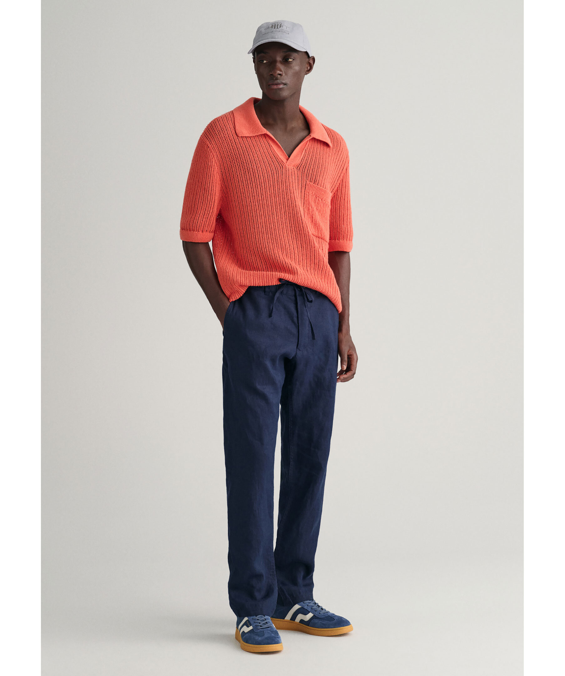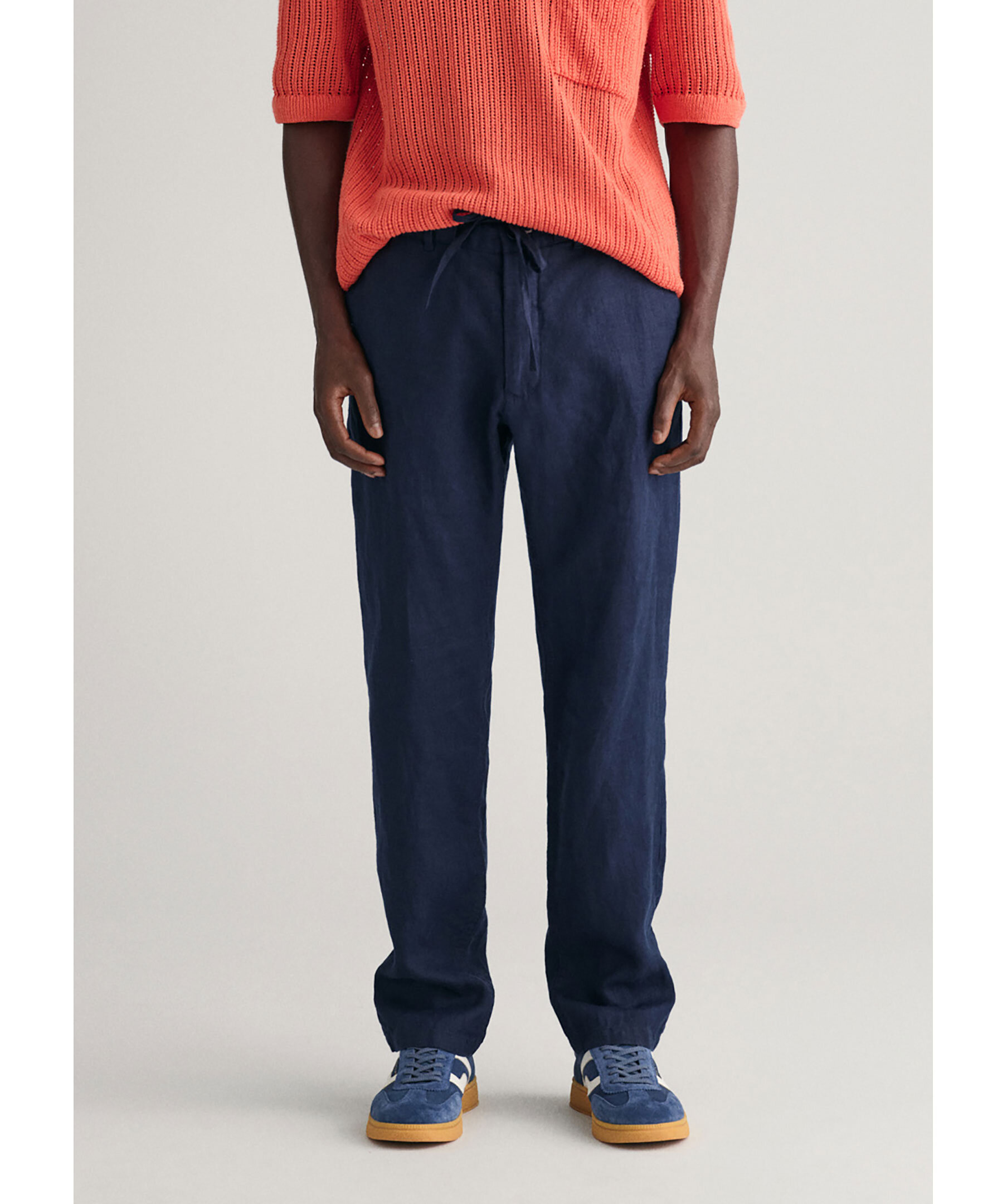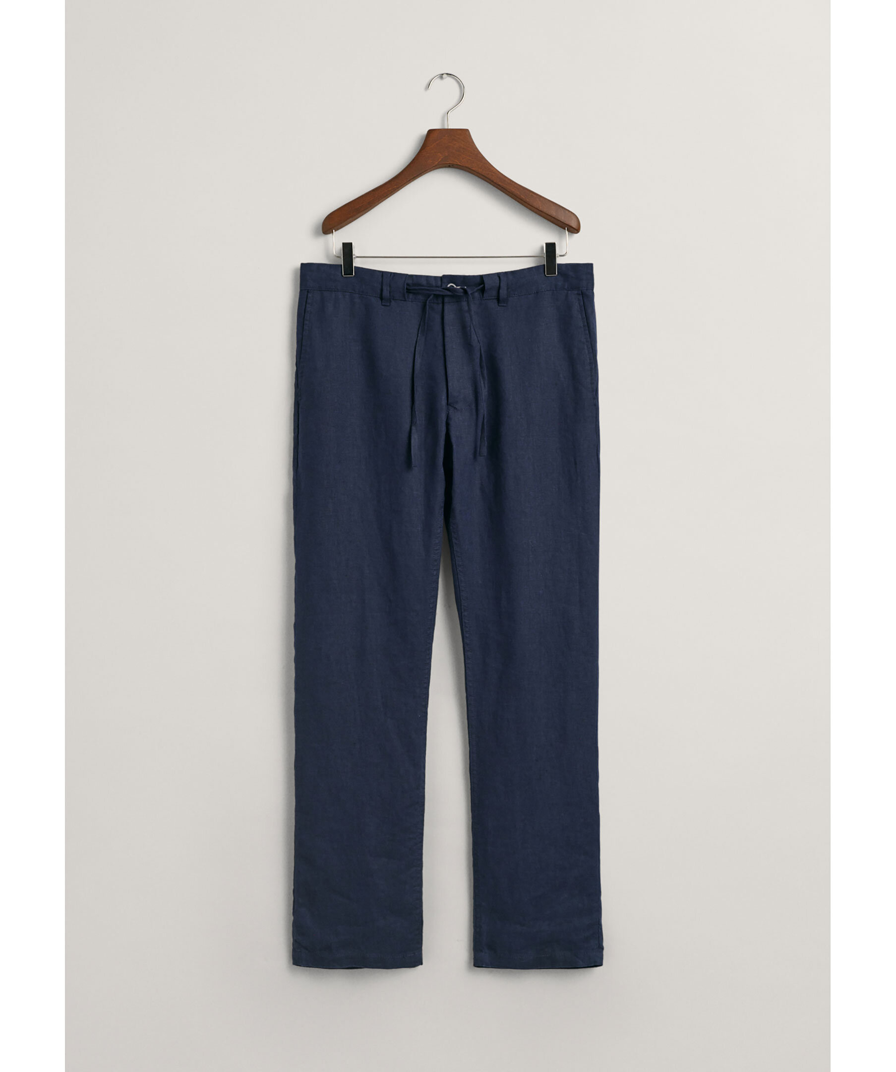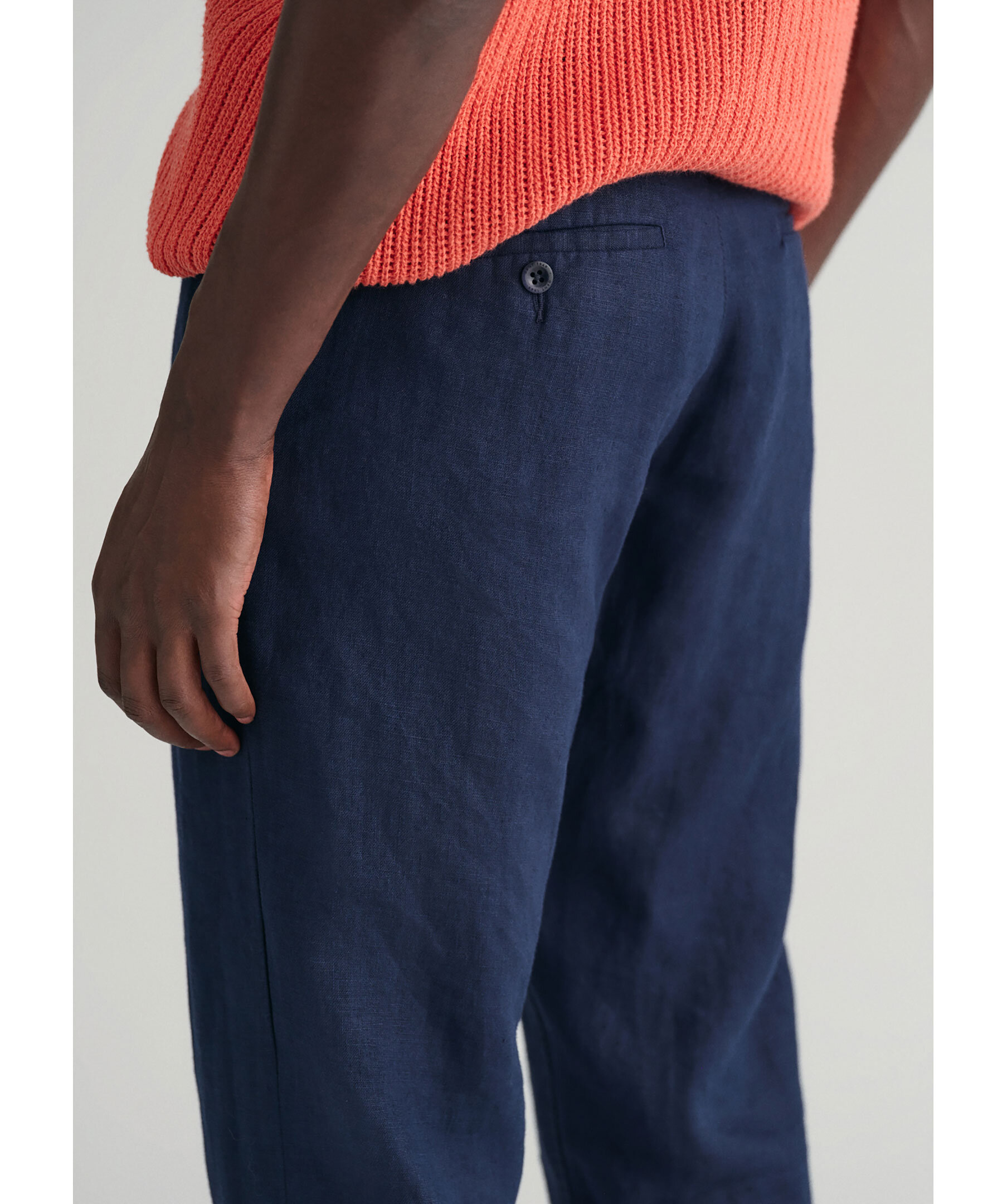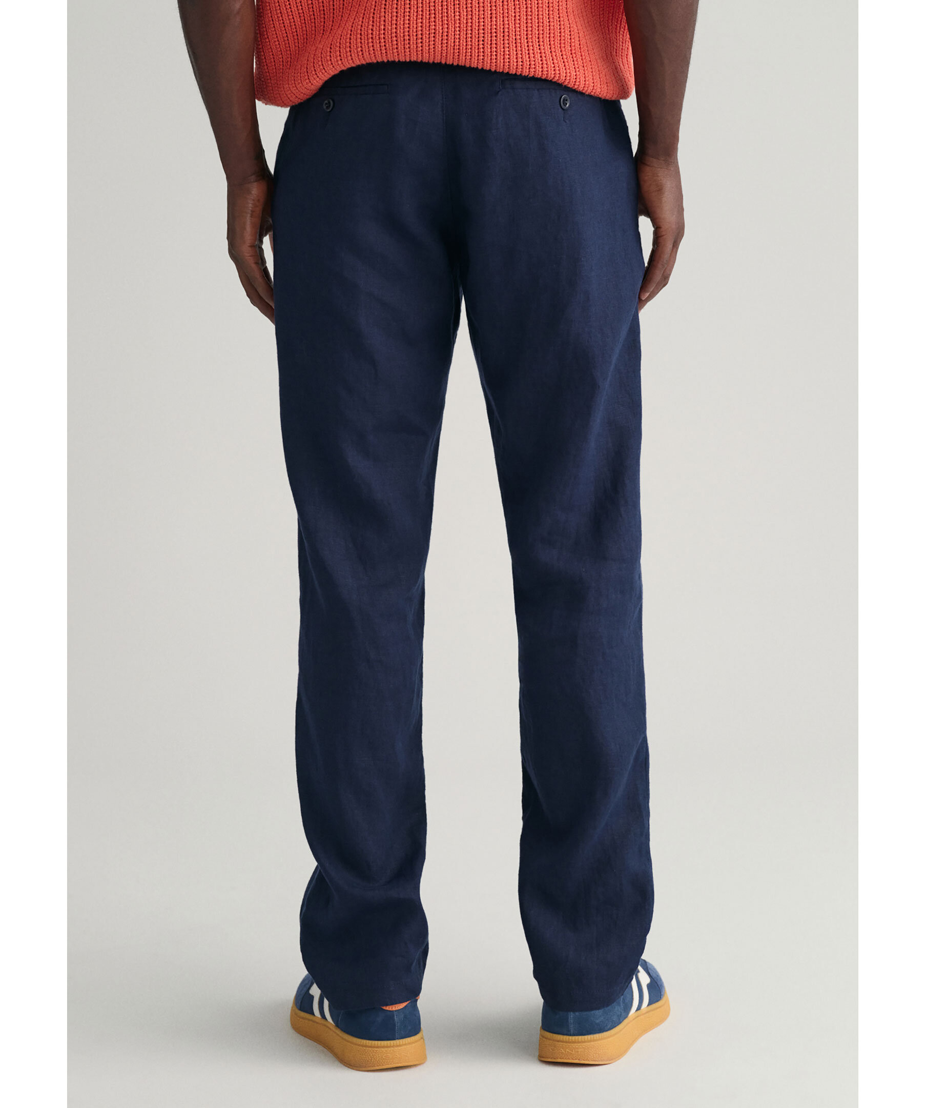 Marinblåa linnebyxor från Gant. Två sidfickor, passpoalfickor med knappar bak och corozo-knappar. Byxorna har en snygg chinoslook och en sportig dragsko i linningen. Tillverkade i 100% linne. Avslappnad passform med raka ben.