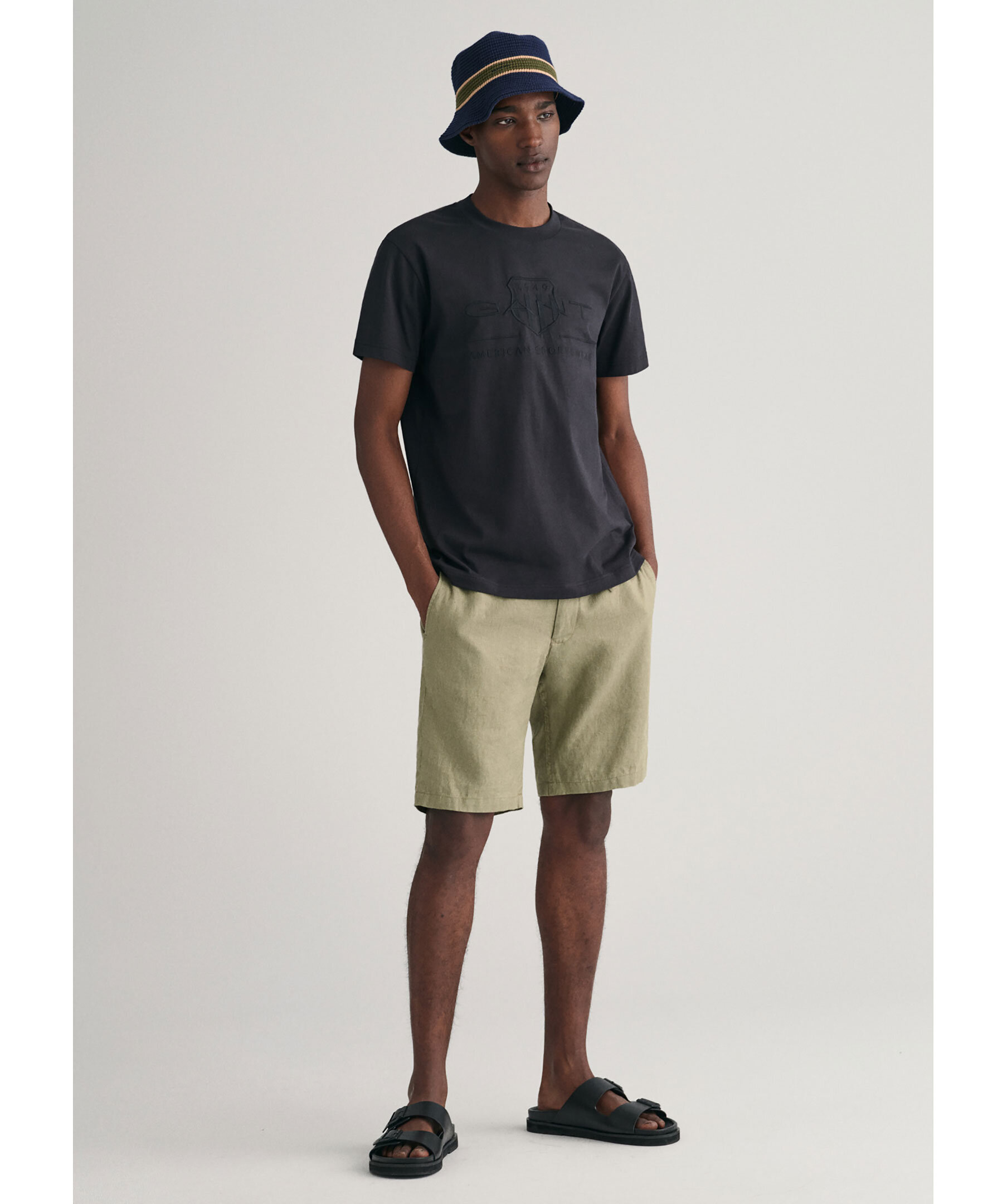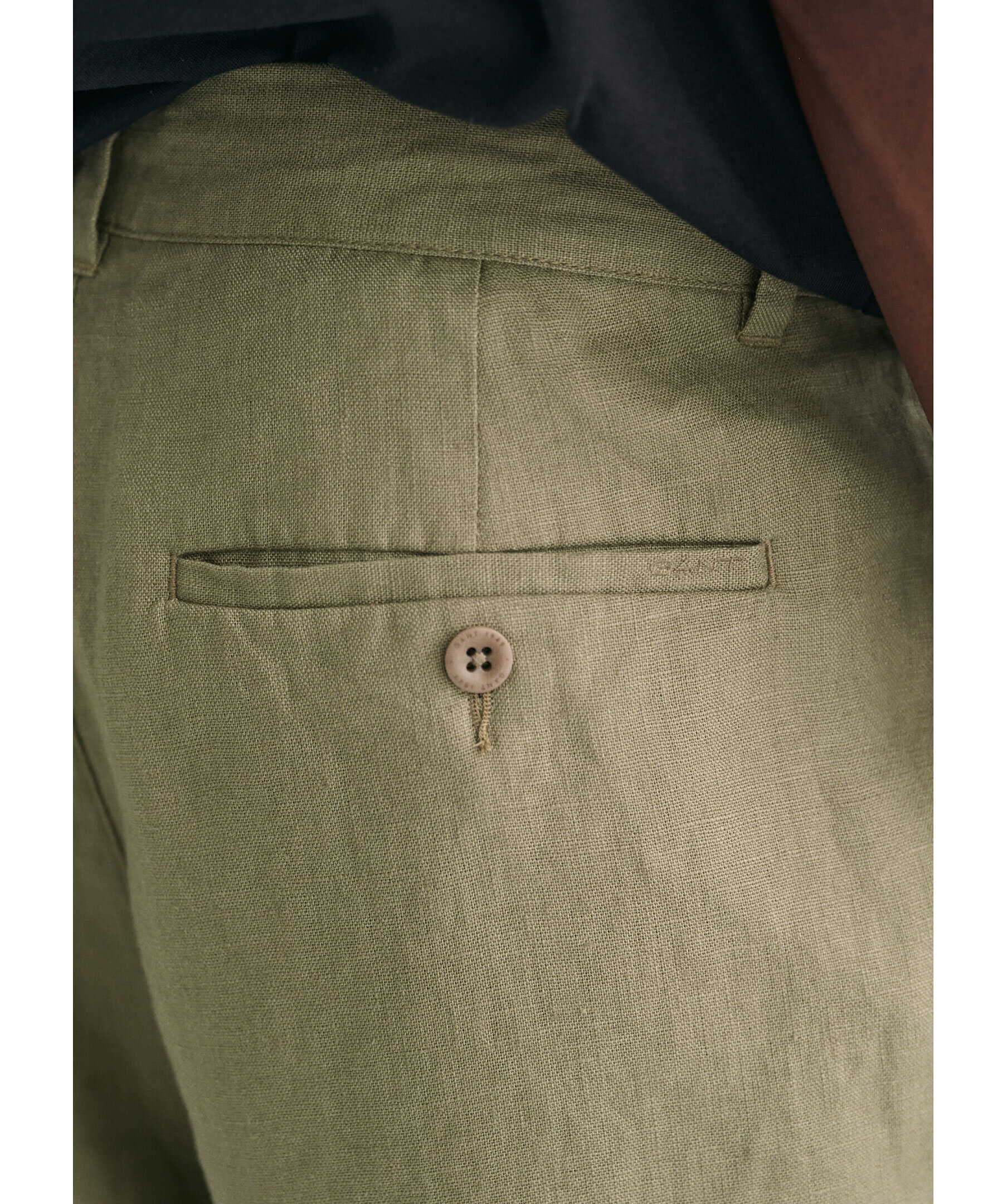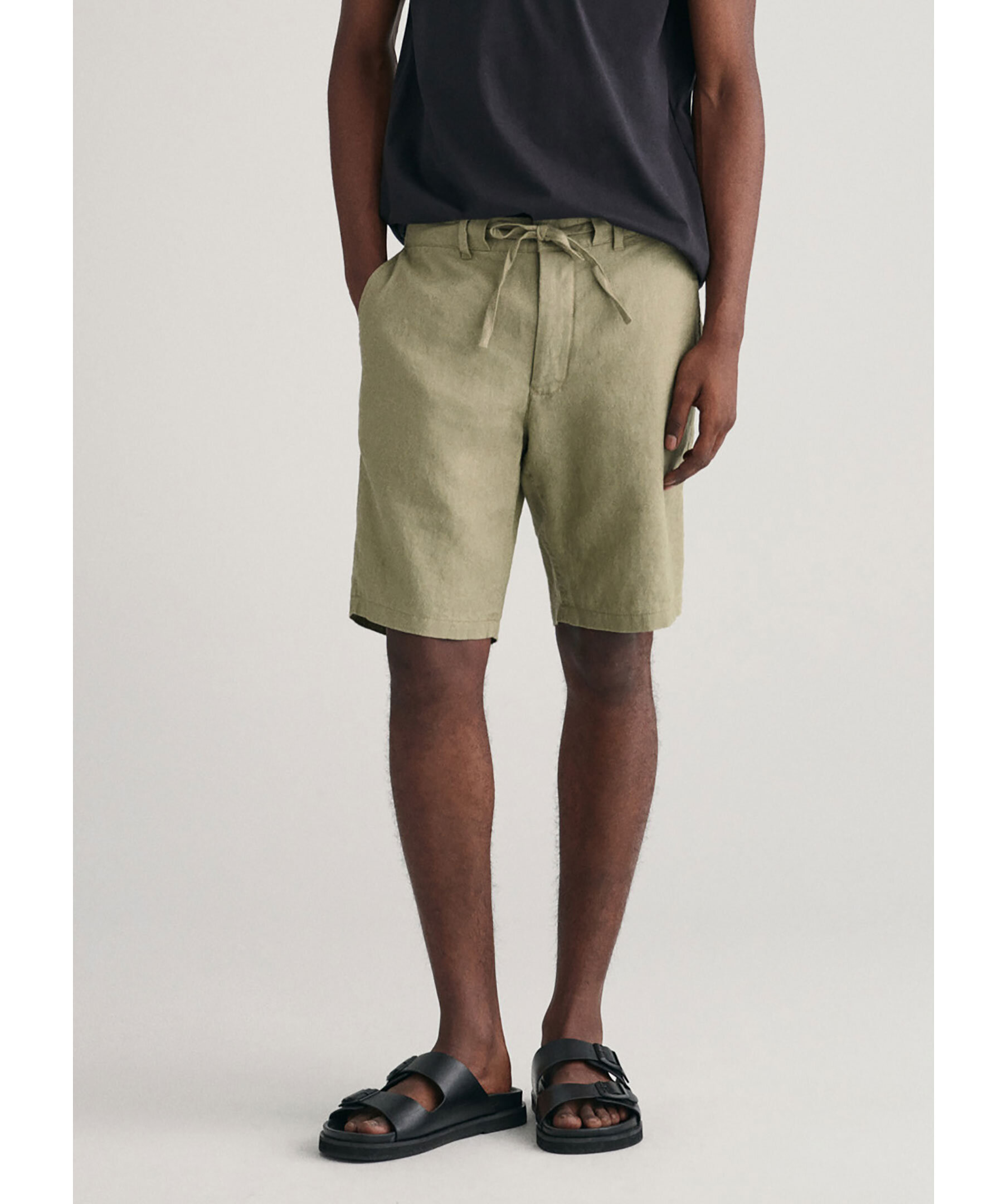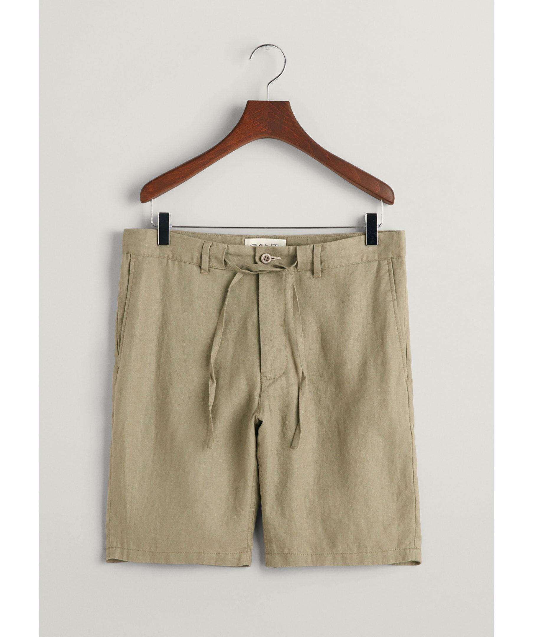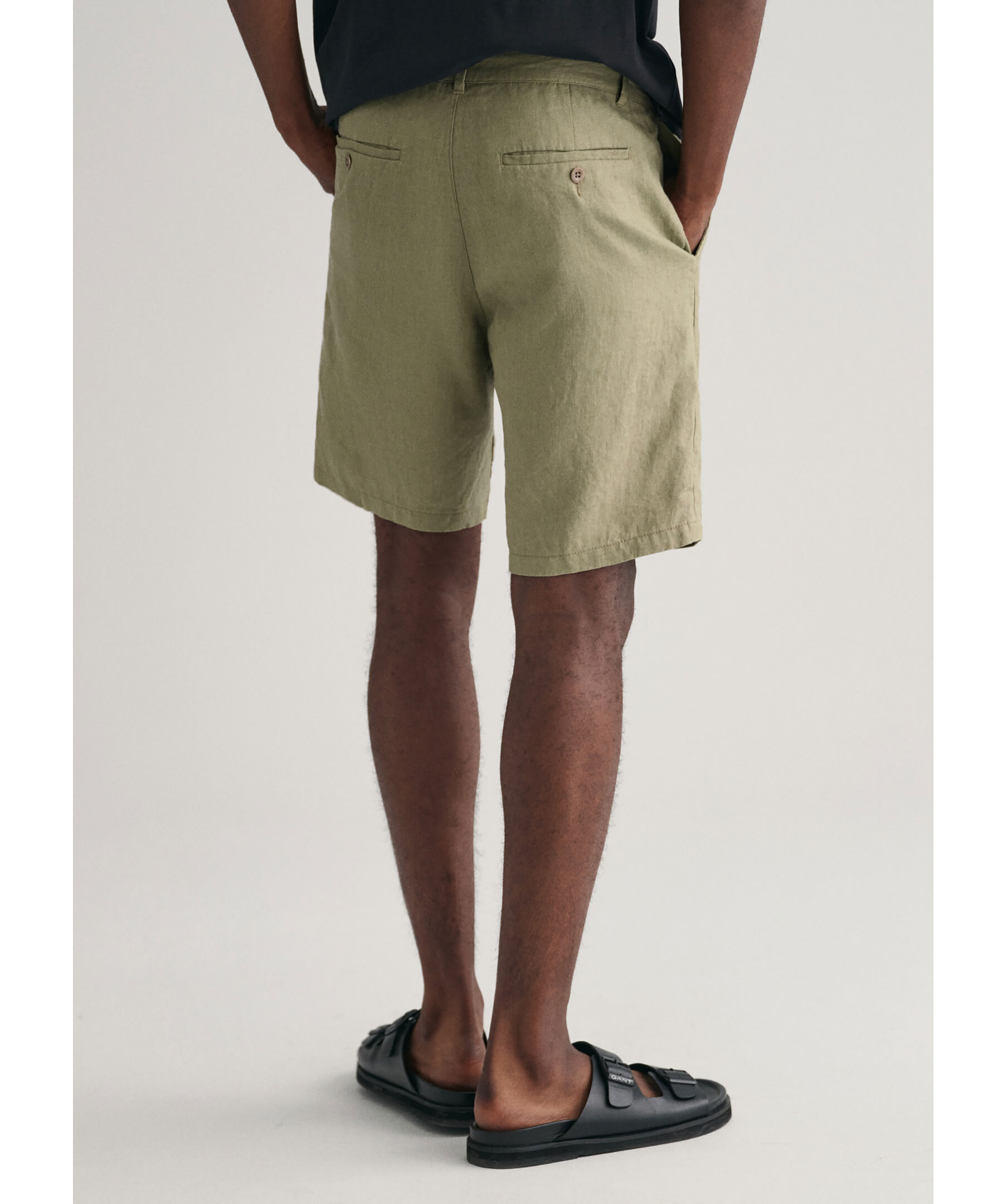 Gröna linneshorts från Gant. Tillverkade i 100% linne. Shortsen har två sidfickor, två passpoalfickor med knappar bak och corozo-knappar. De har en snygg chinoslook och en sportig dragsko i midjan. Avslappnad passform med raka ben.