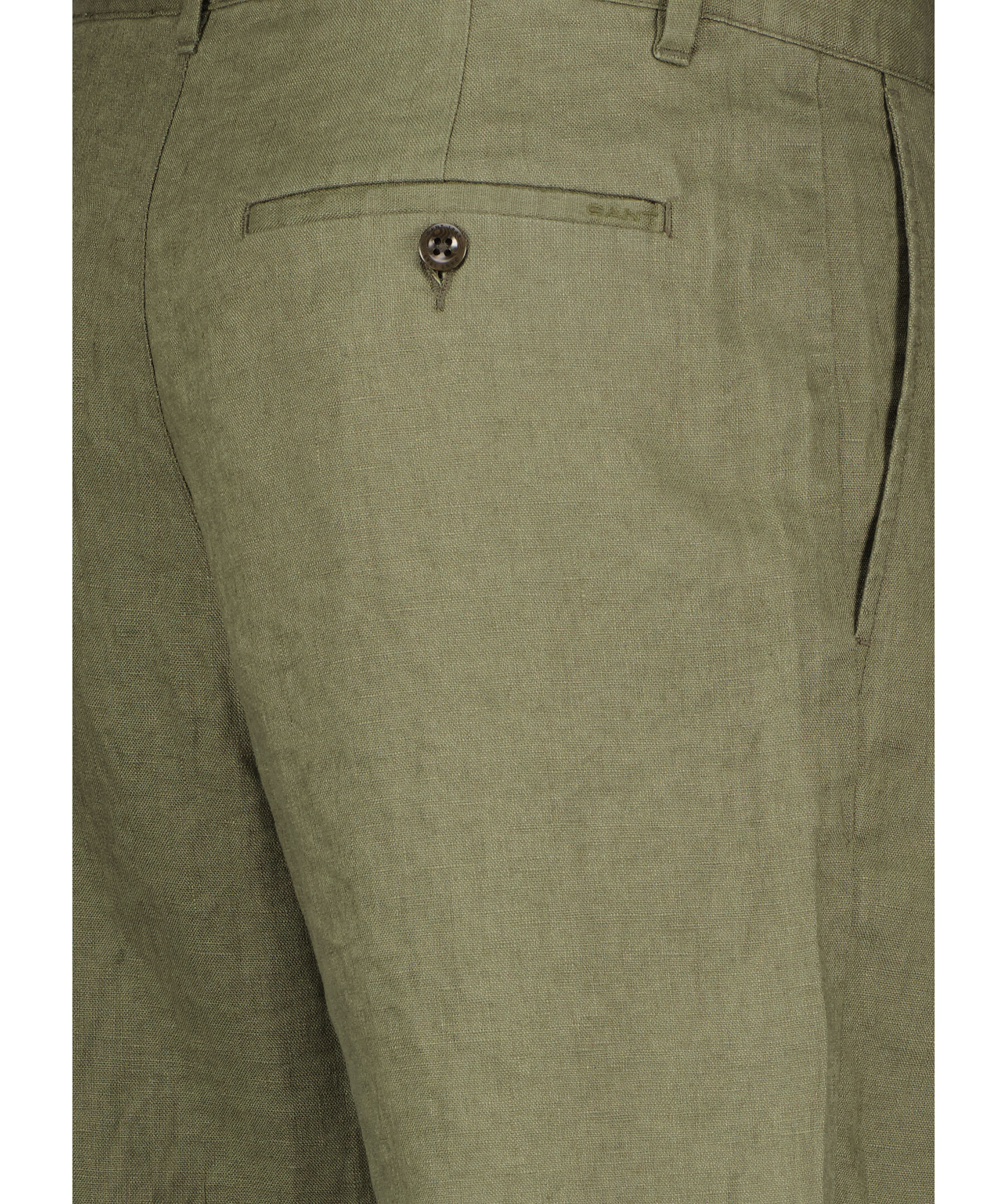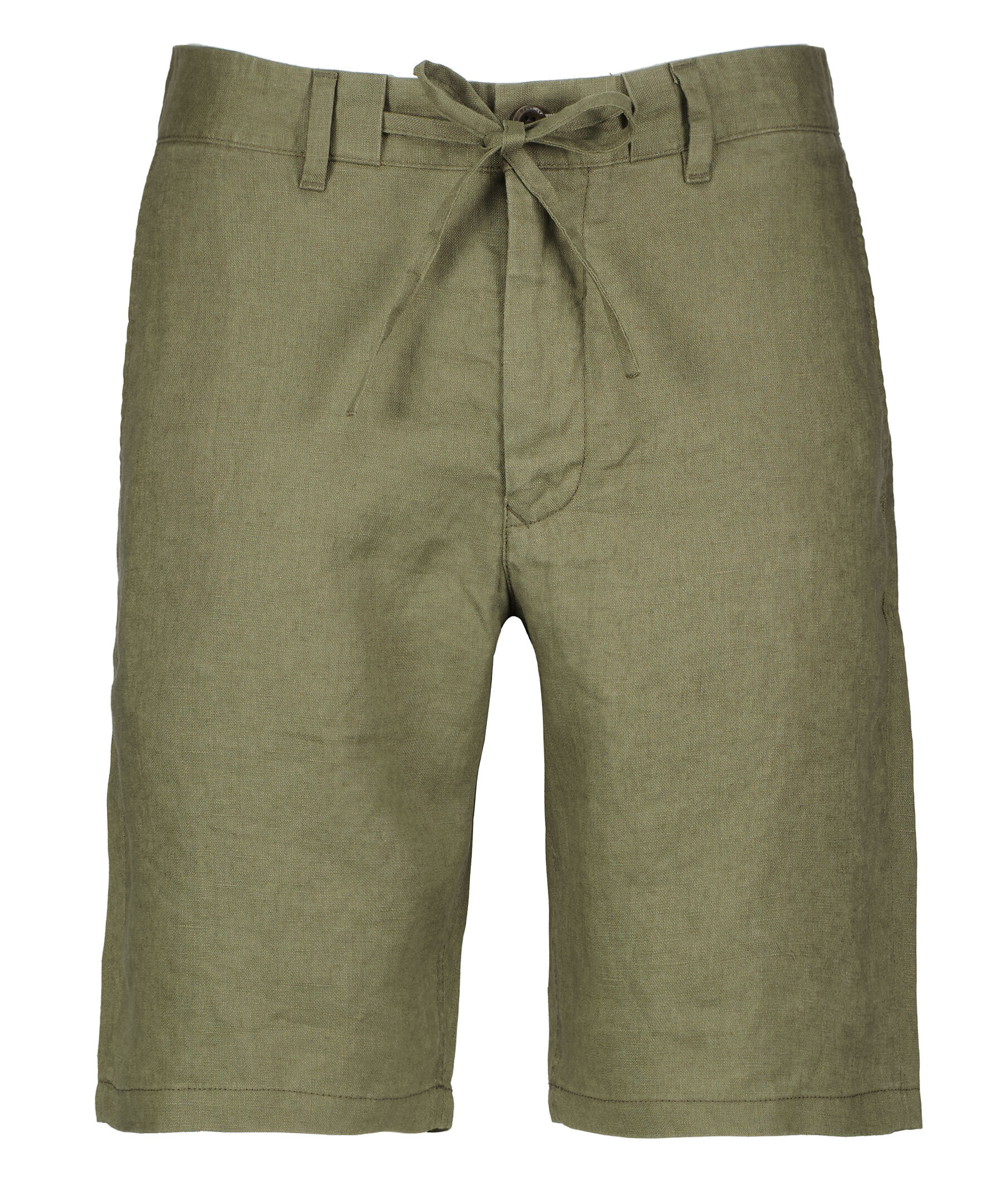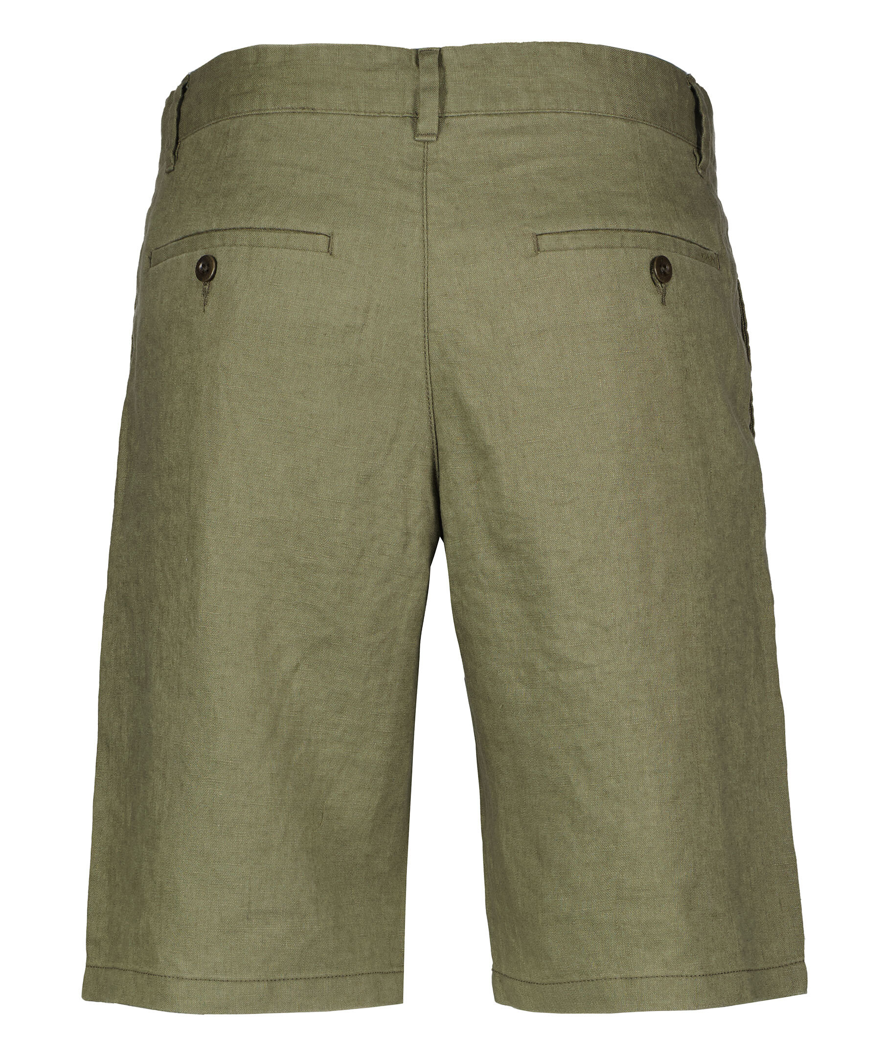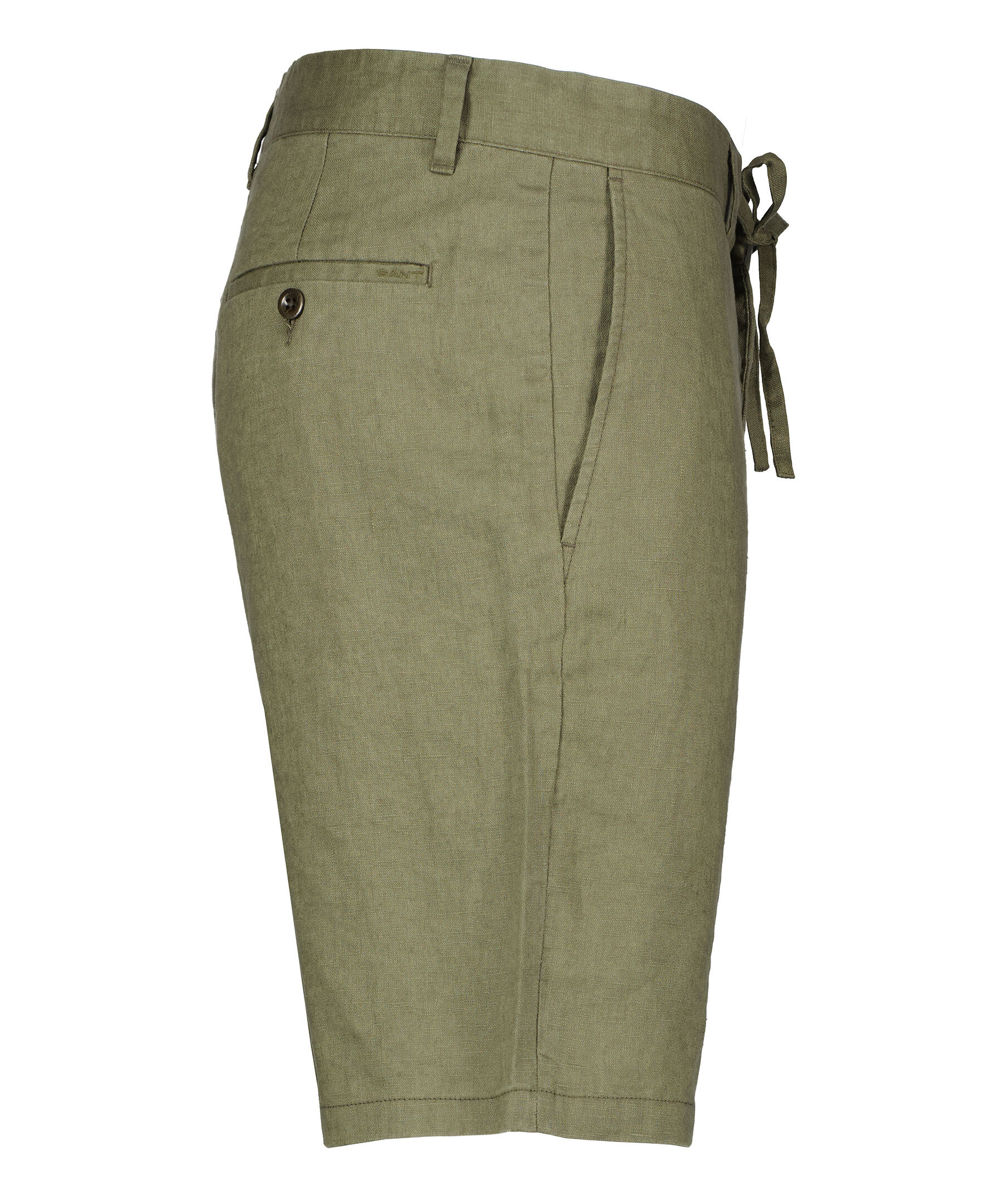Mörkgrön shorts i linne från Gant. Två fickor framtill, två fickor baktill. Mellanhög midja, relaxed fit i benen. Slutar mitt på låret. Resårlinning. Snörning i midjan.