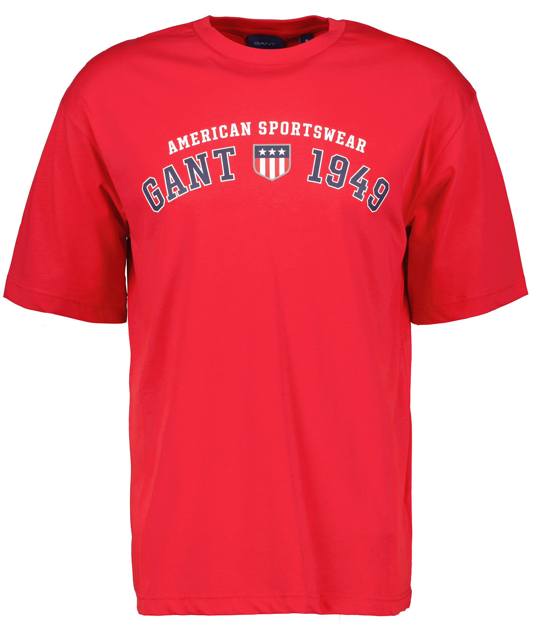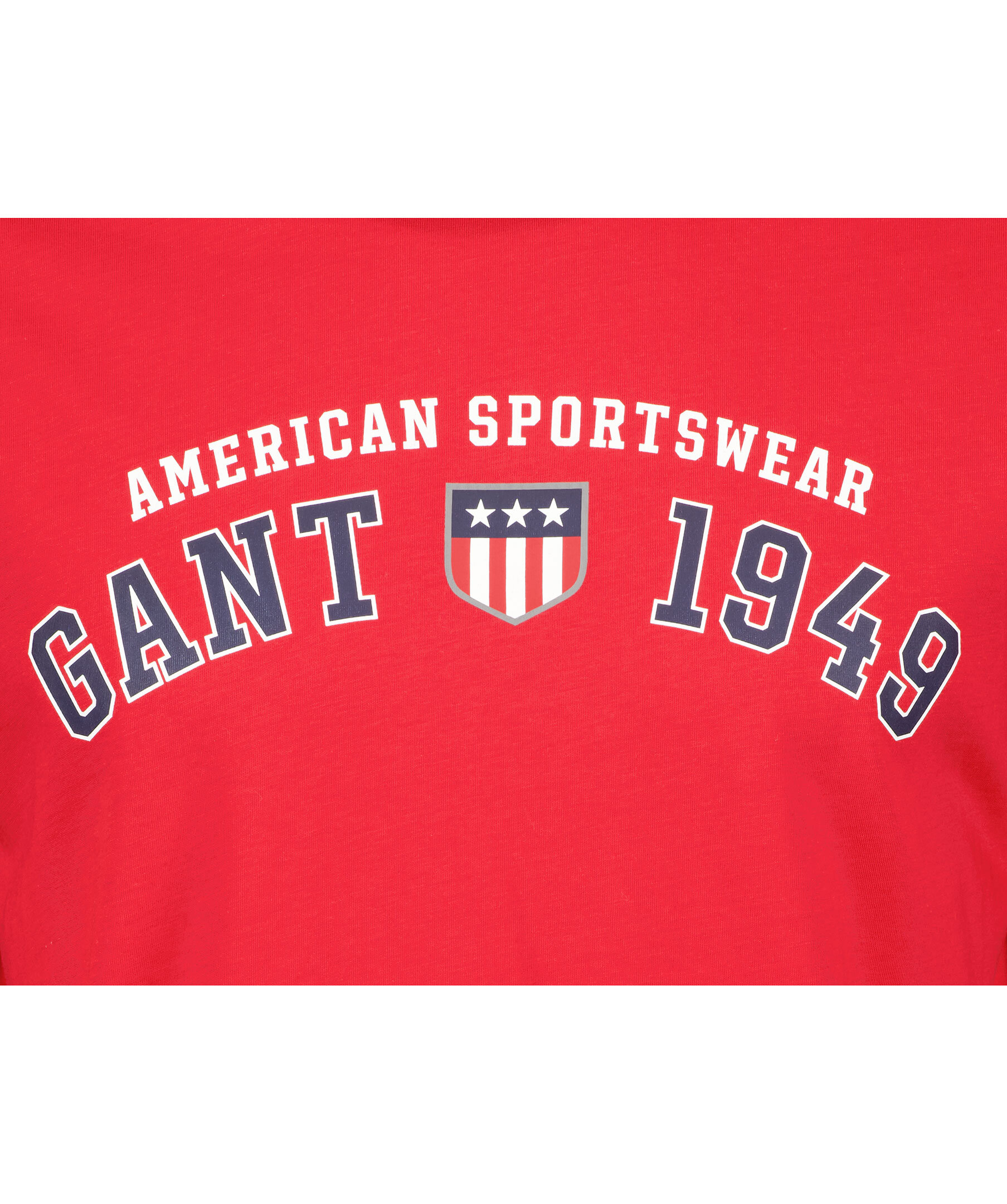 Röd t-shirt från Gant. Tryck över bröstet i Mörkblått och vitt. Rundad halsringning med ribbstickad mudd. Tillverkad i 100% bomull.