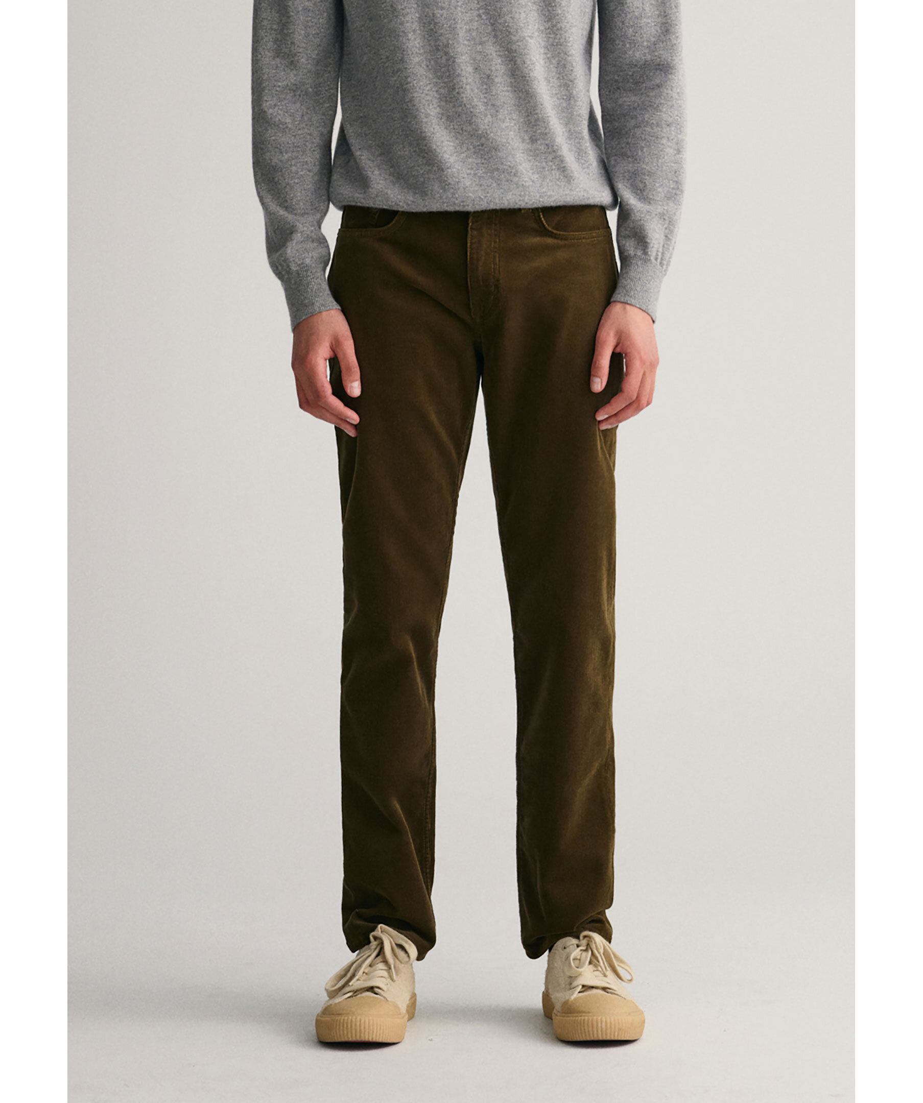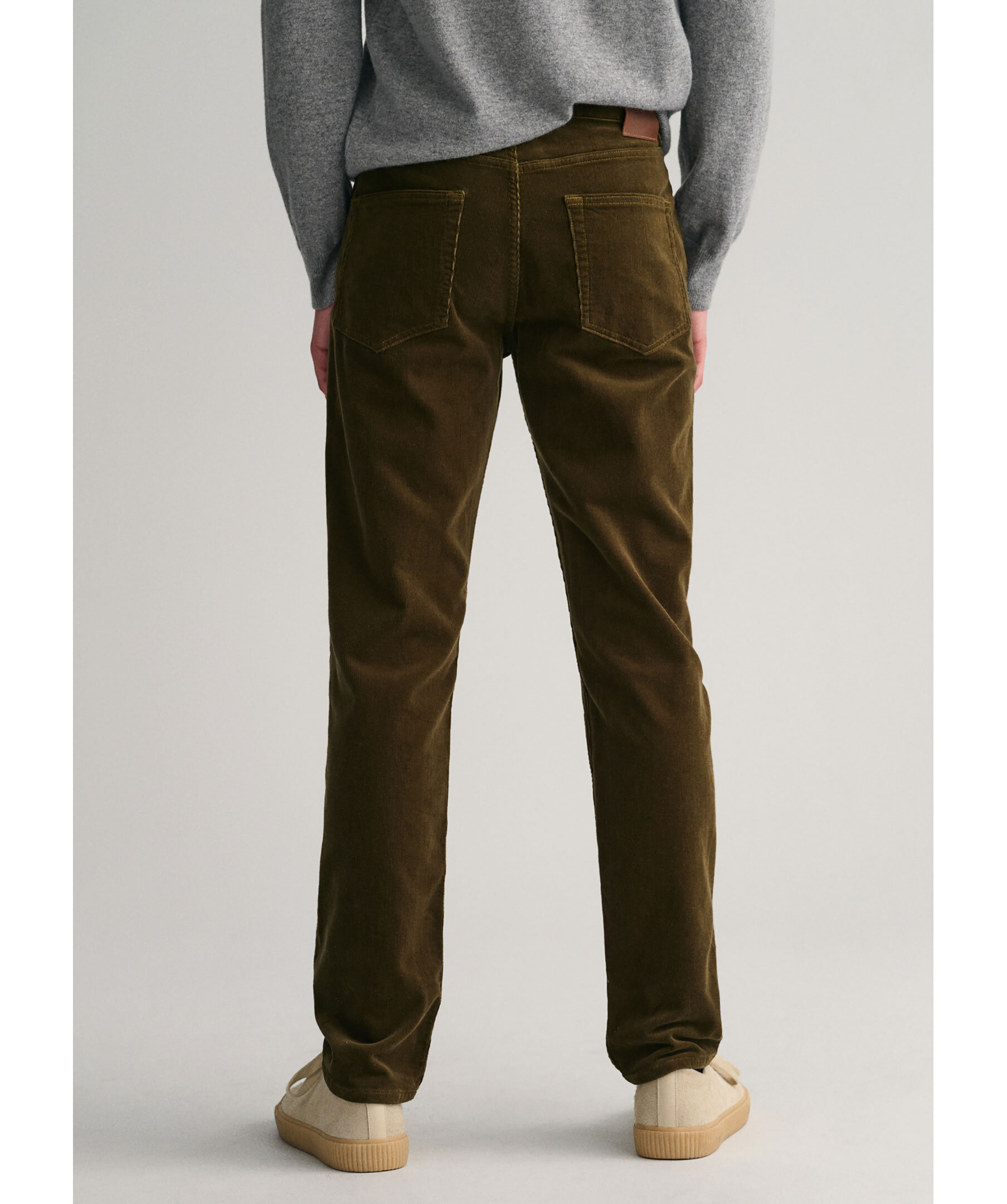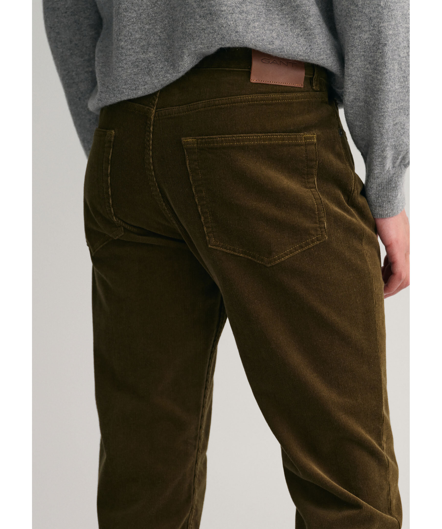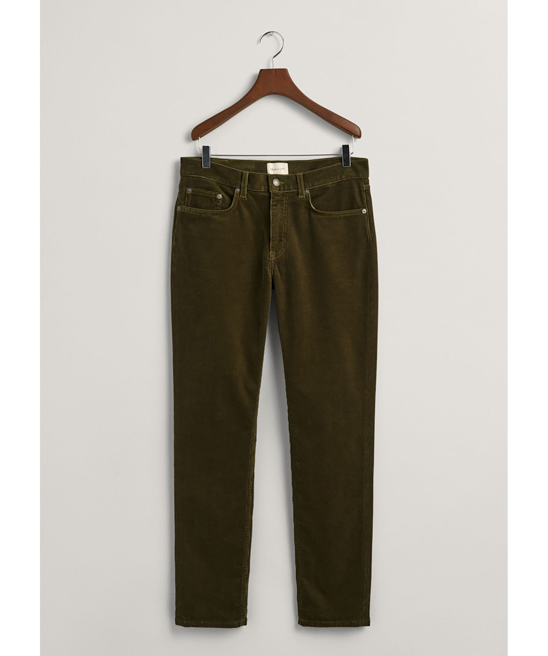 Skogsgröna manchester byxor från Gant. Fem fickor. Gylf med dragkedja och knapp. Hällor för bälte. Patch i brunt läder med embossad logotyp baktill. Mellanhög midja och smal passform. Tillverkad i bomullsblandning.
