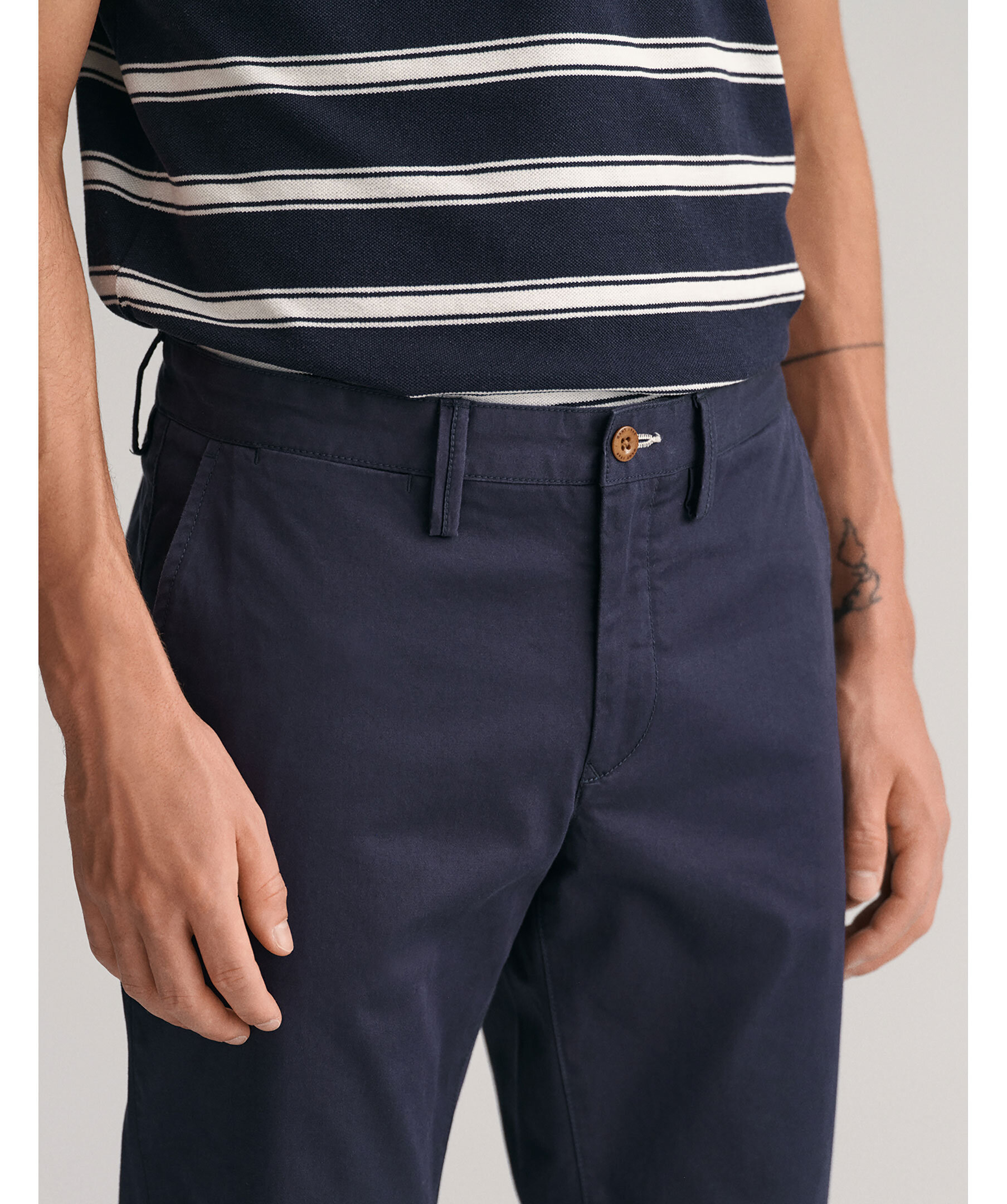 Marinblåa chinos i ekologisk bomullstwill med lätt stretch från Gant. Smal passform över höfterna och ner längs benen. De har bakfickor med knapp och en GANT-logotyp på höger bakficka. Två sidfickor. Matcha med allt från en T-shirt med relaxed fit till en mer dressad button down-skjorta.
