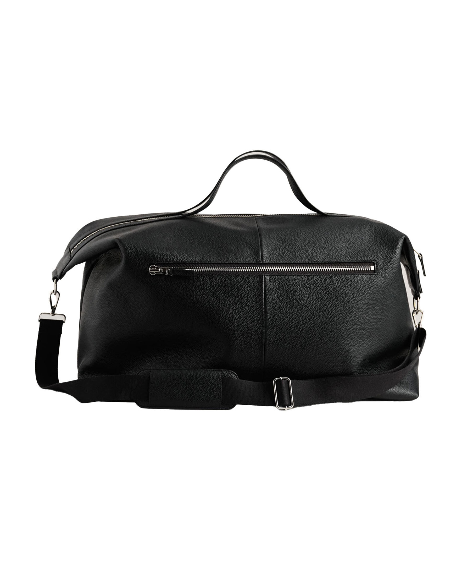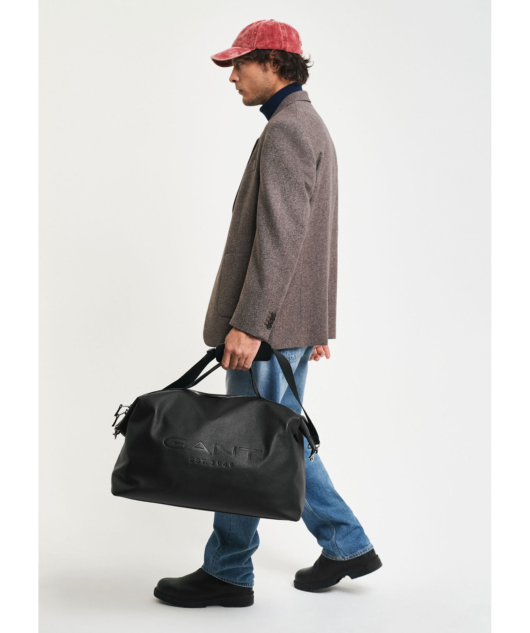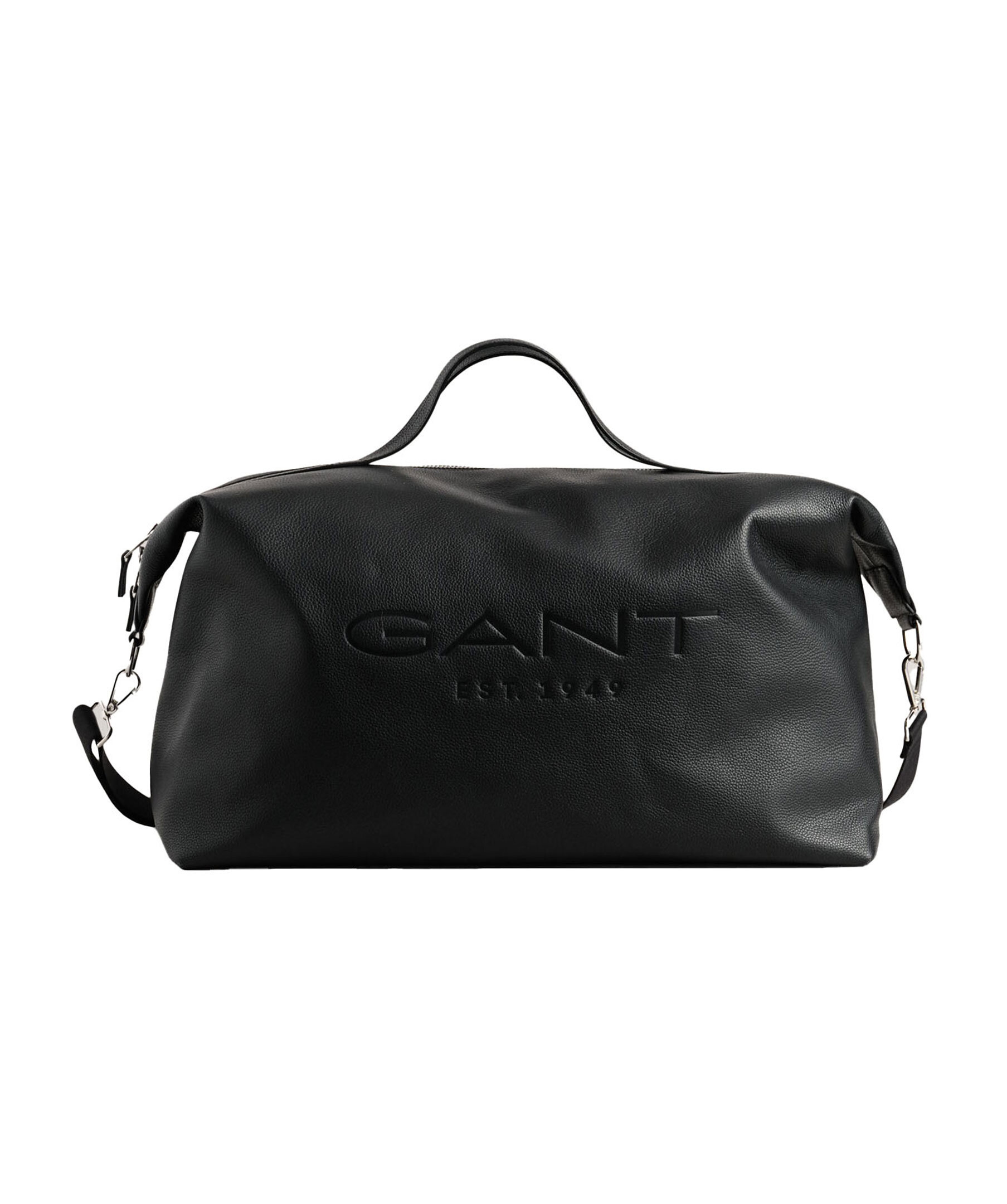 Svart, tidlös skinnväska från Gant. Väskan har en lång, justerbar rem, ficka med dragkedja bak, innerfack och uppdelade innerfack med silverfärgade metalldetaljer samt korta handtag och en präglad GANT-logotyp på framsidan. Mått: H: 28cm, L: 51cm, B: 23cm.