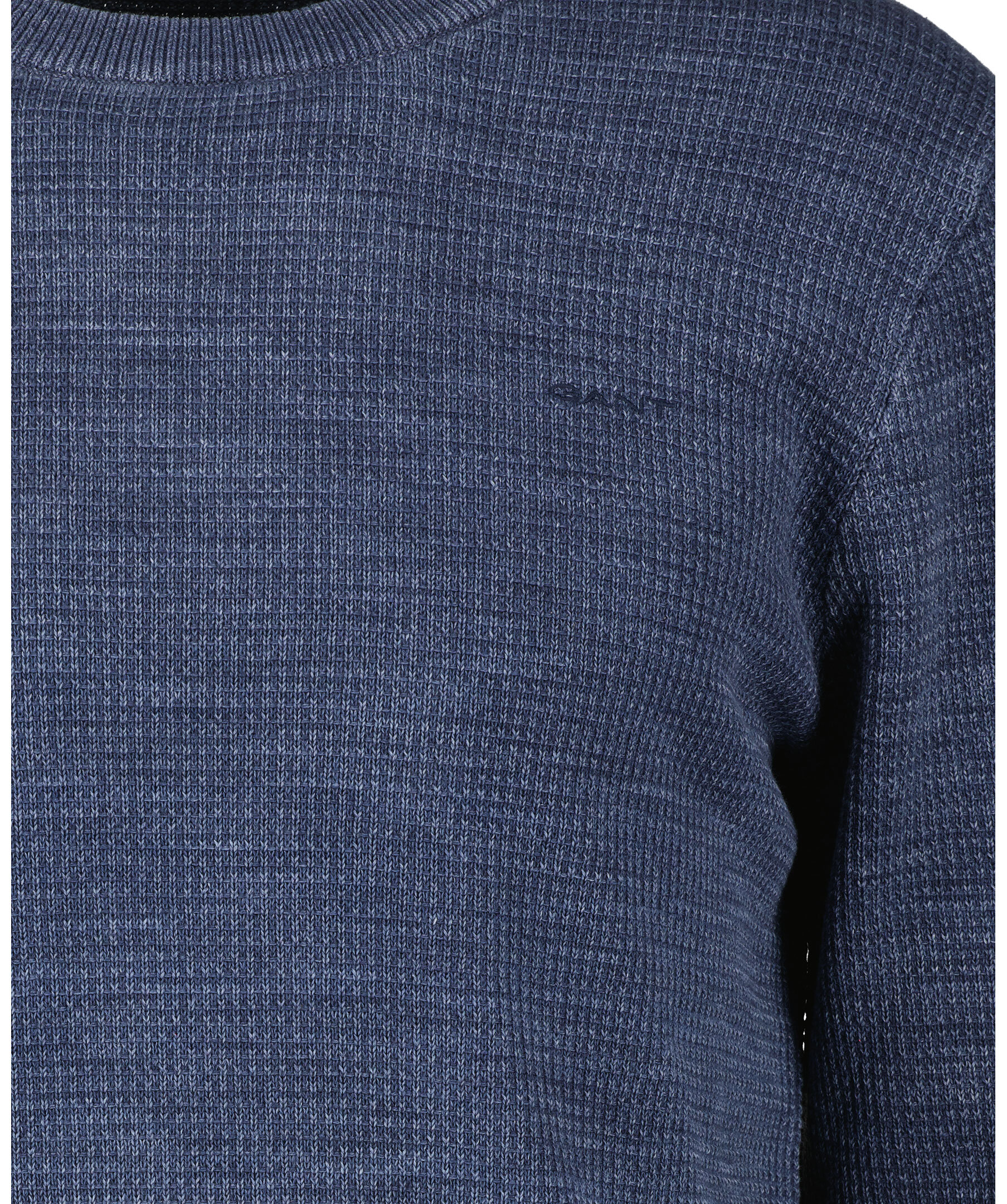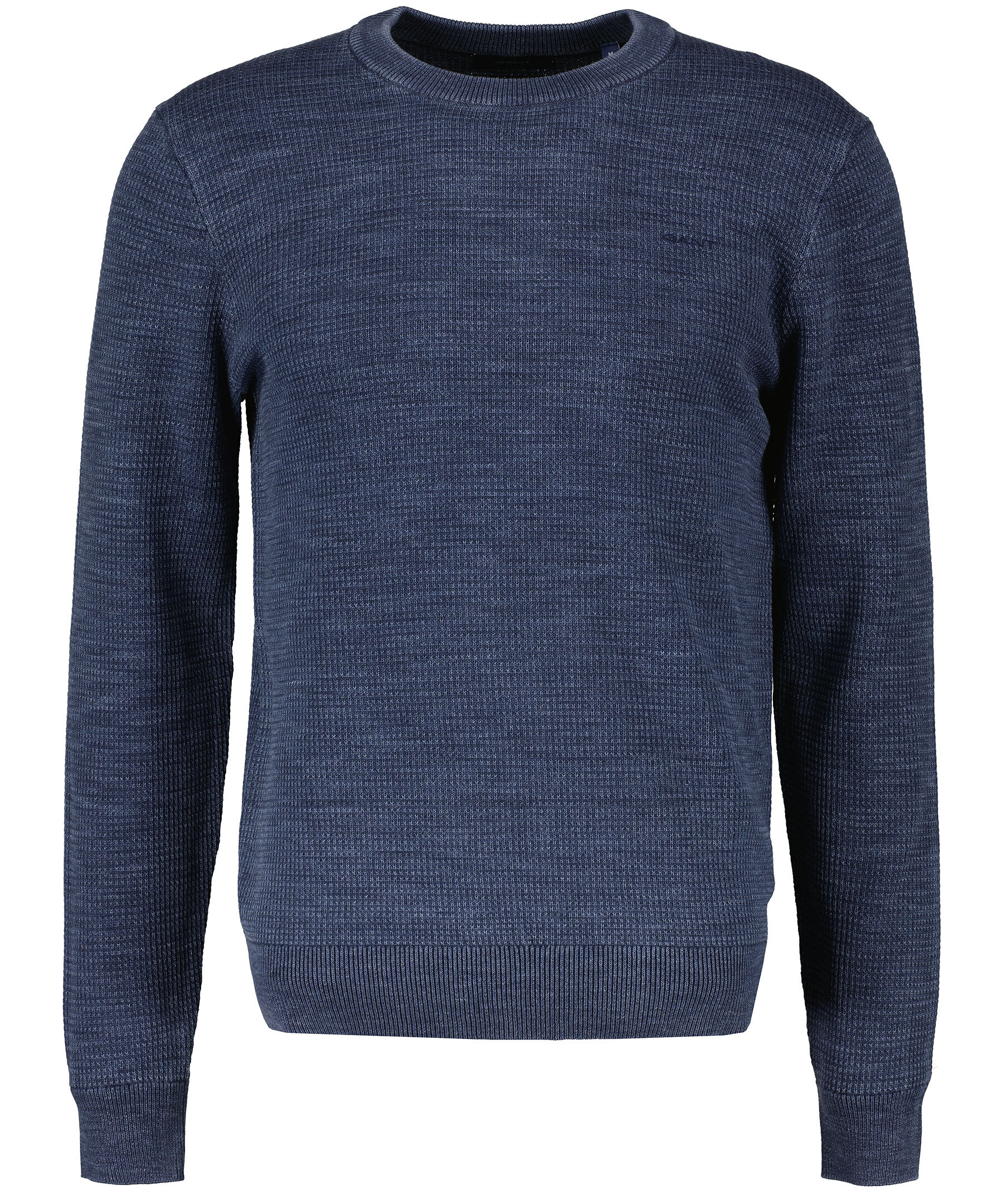 Marinblå solblekt finstickad crew-neck tröja från Gant. Tillverkad av 100% bomull. En tröja med struktur och klassisk rund halsringning samt normal passform. Den här använda looken är resultatet av en färgningsteknik som ger naturliga färgskiftningar och en solblekt effekt. Broderad GANT-logotyp på bröstet.