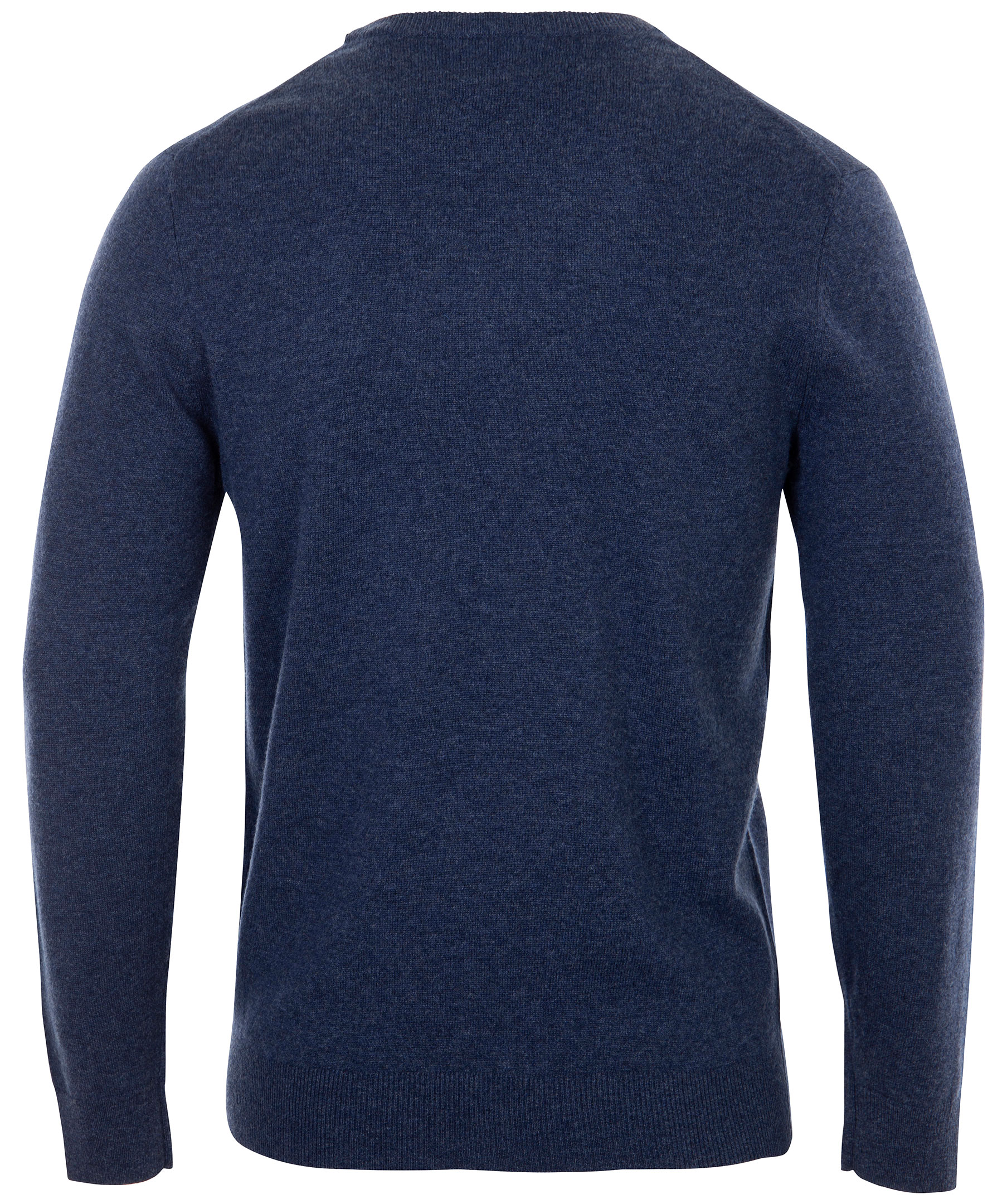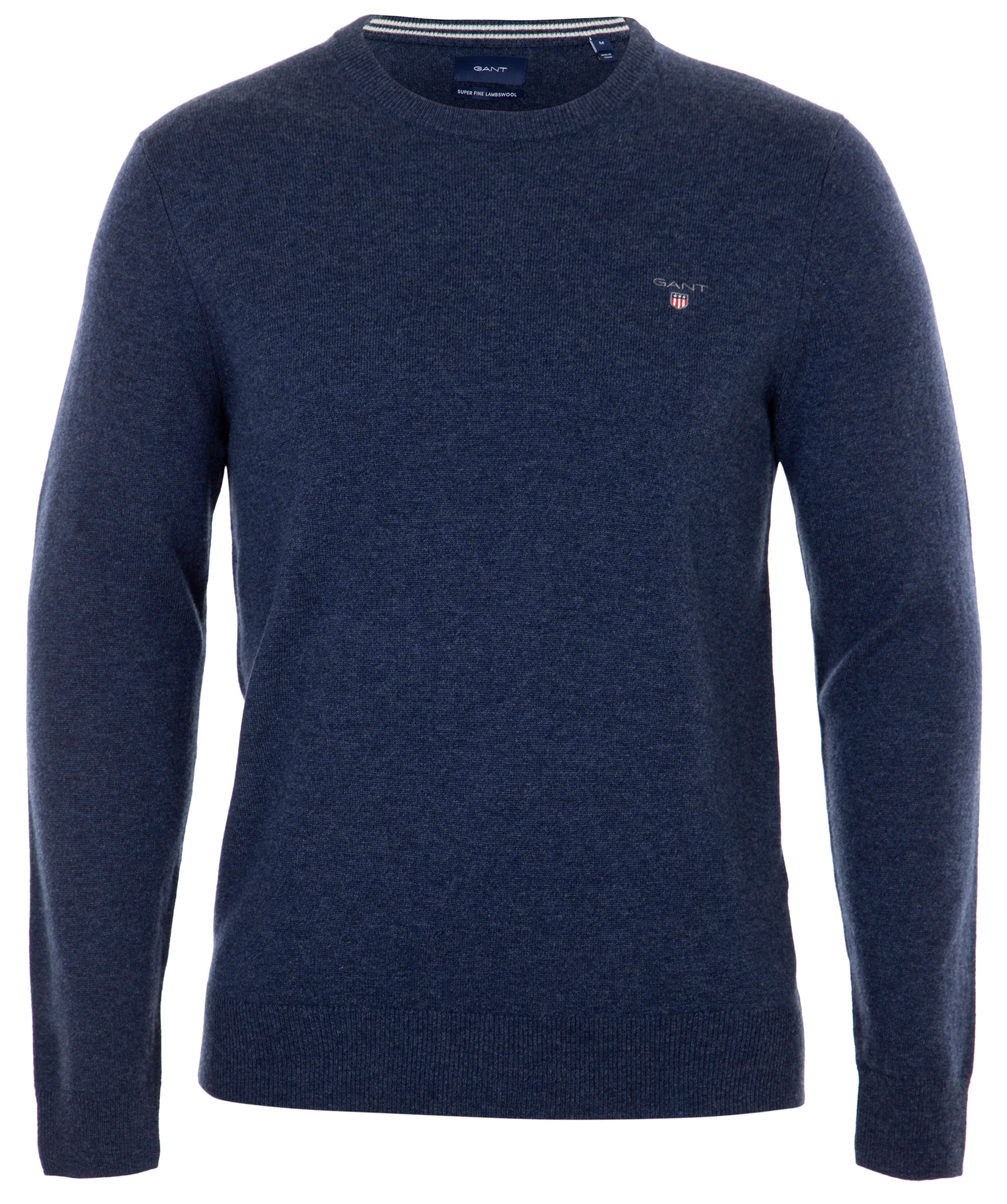 Blå finstickad tröja i 100% ull från Gant. Logotyp broderad på vänster sida av bröstet och ribbstickad krage, ärm och plaggslut.