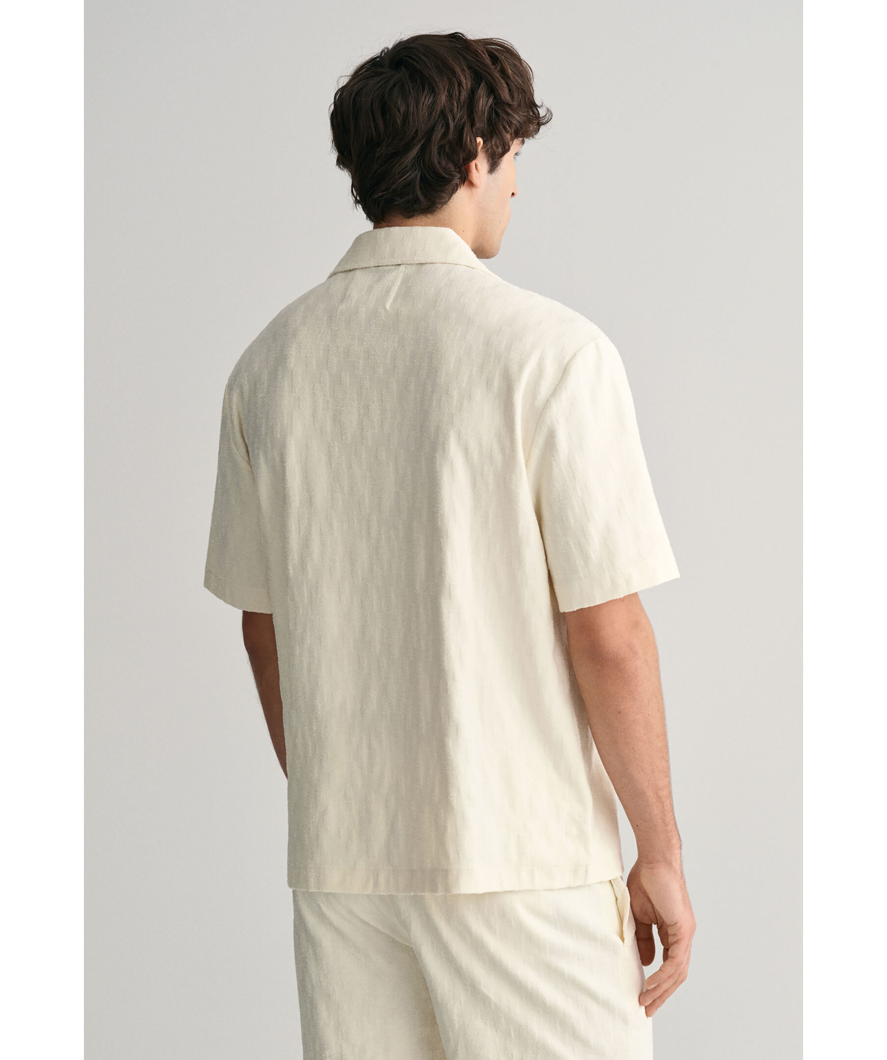 Krämvit strukturerad skjorta i Jaquard-tyg från Gant. Stängs framtill. Bowlingkrage. Korta ärmar. Tillverkad i 100% Bomull.