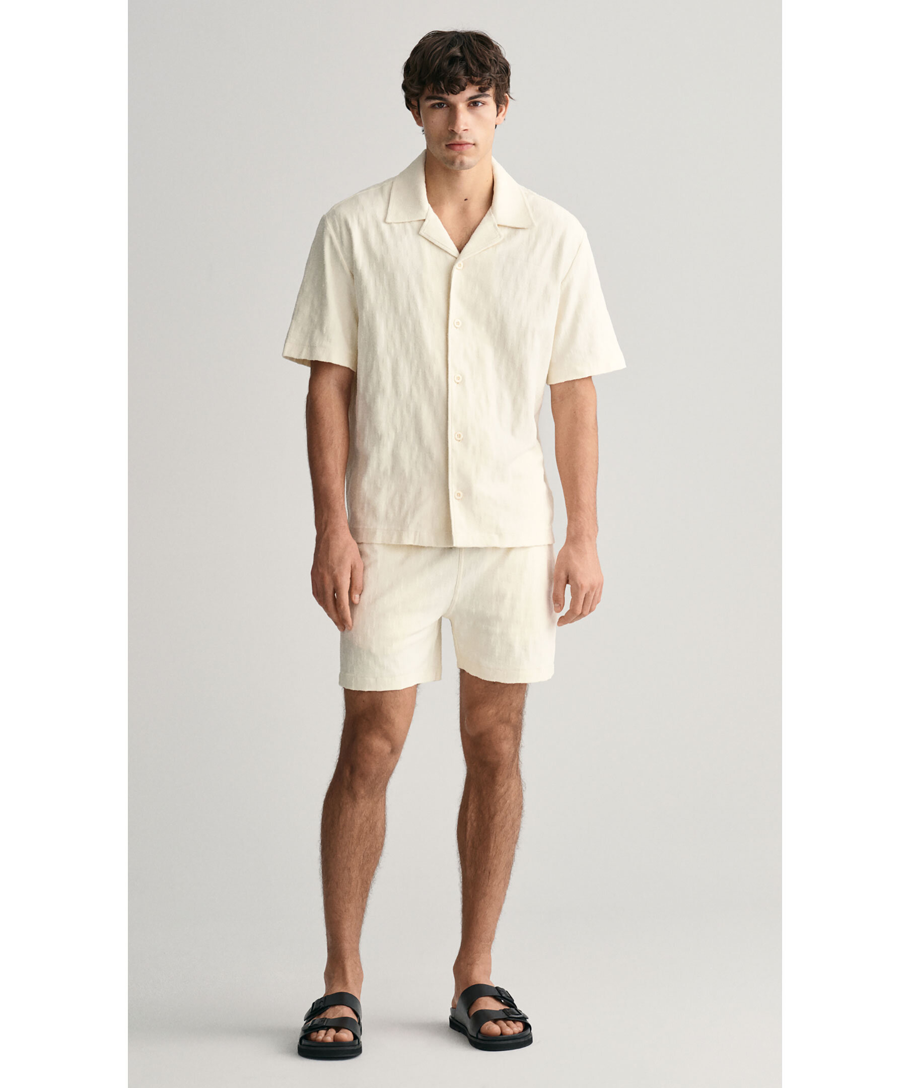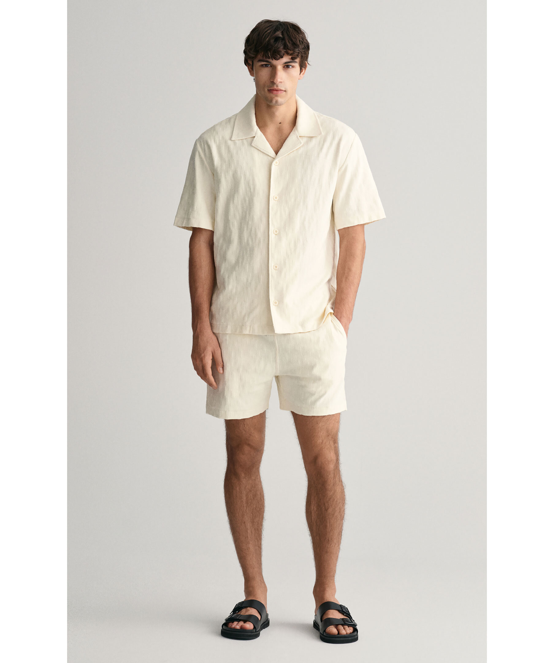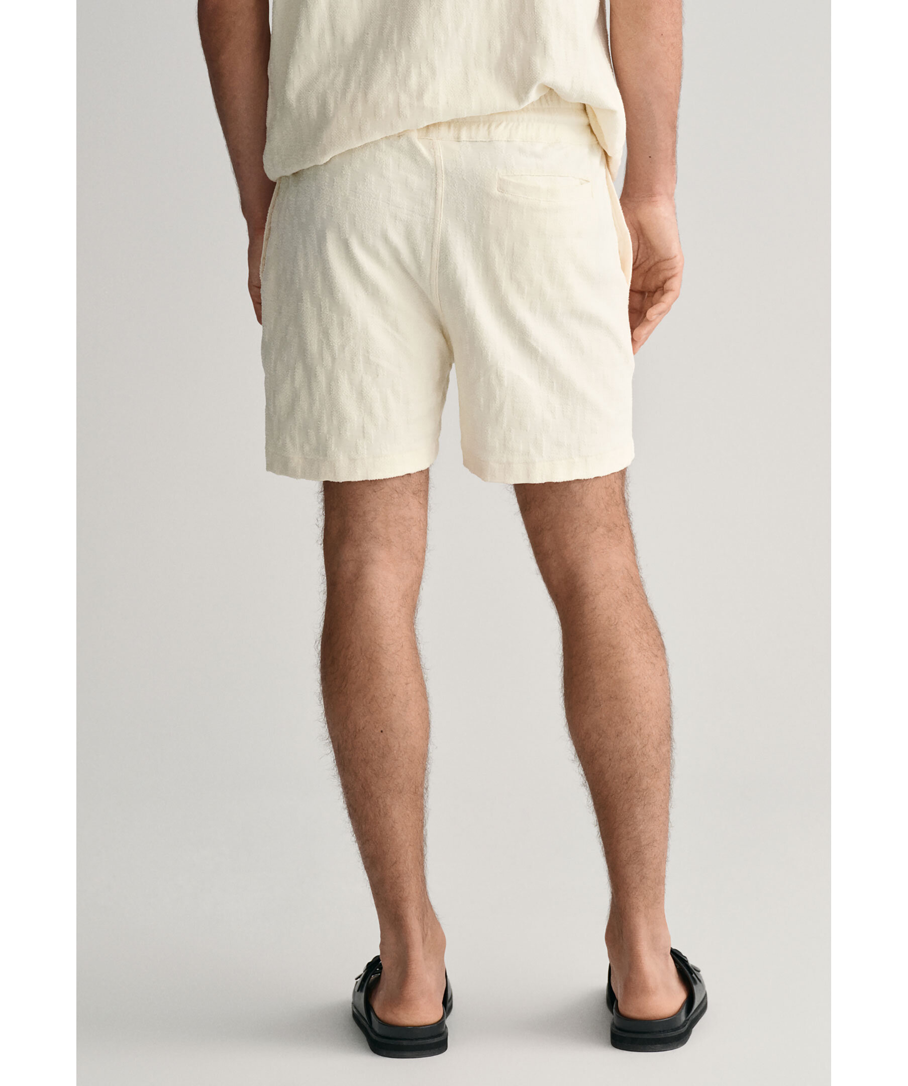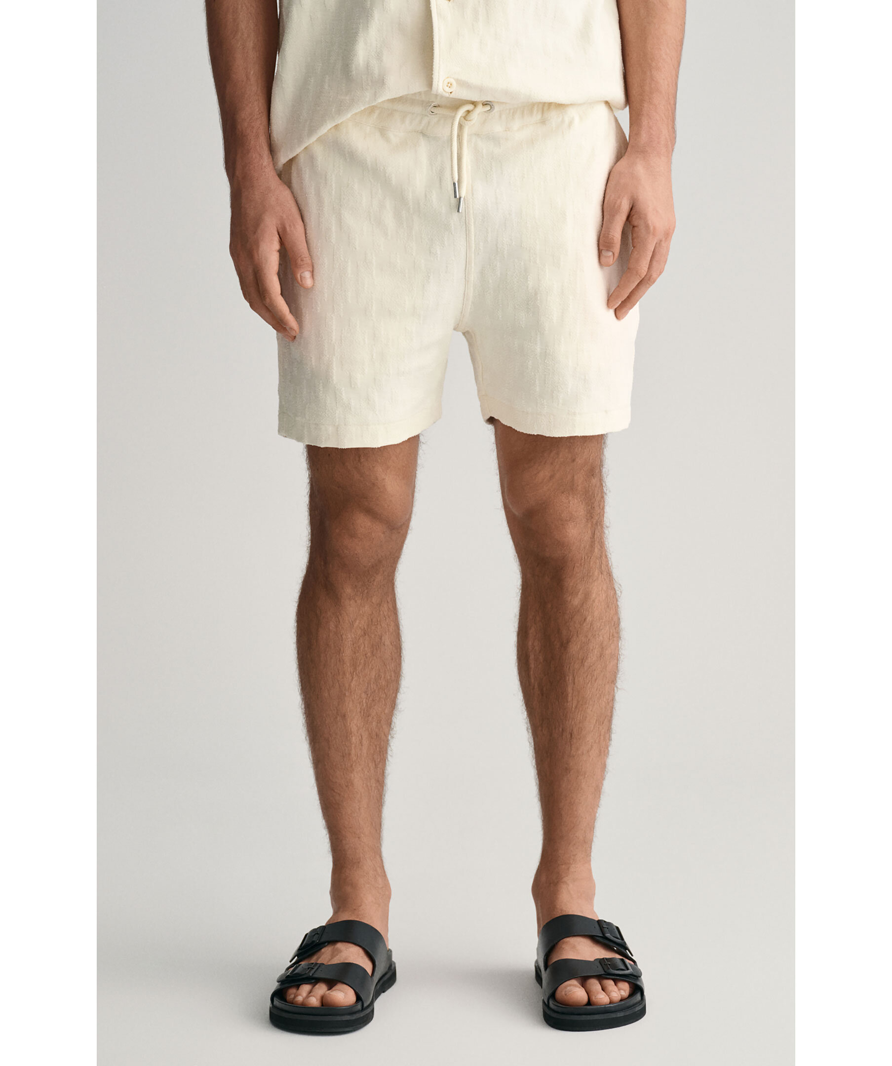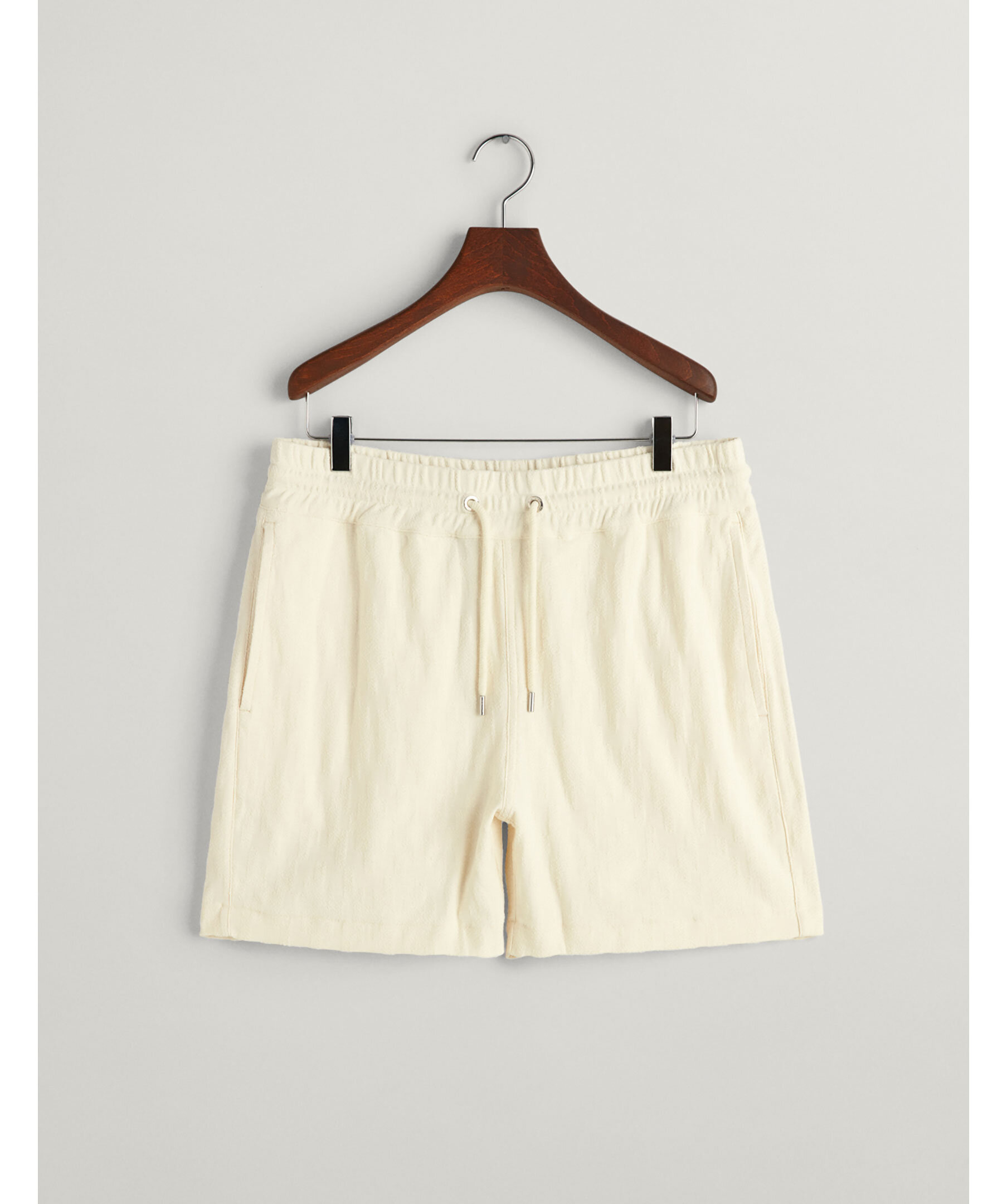Krämvita strukturerade shorts i Jaquard-tyg från Gant. Resår och dragsko i midjan. Två fickor framtill, bakficka på höger sida. Tillverkad i 100% Cotton.
