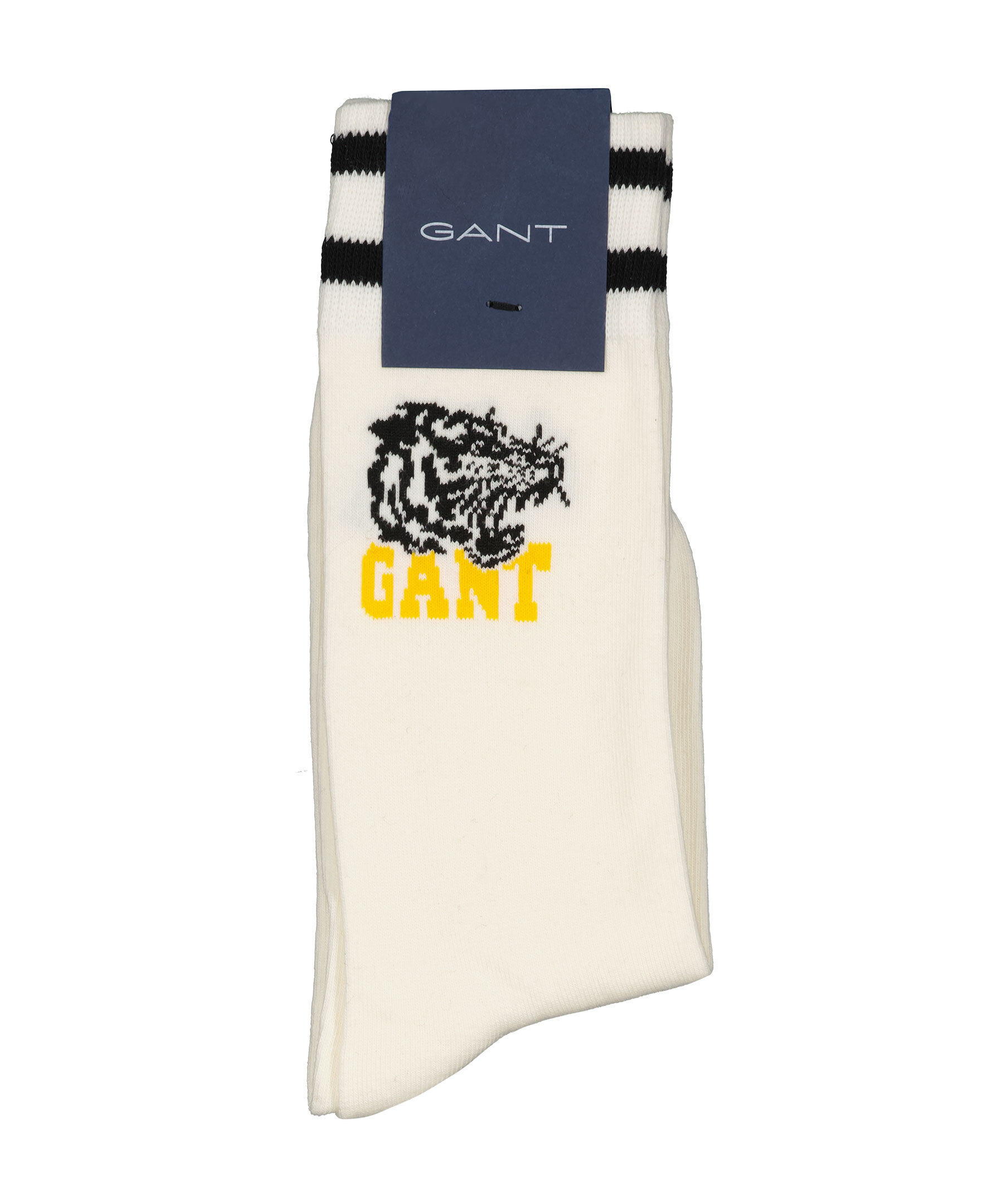Benvita sockar från Gant med svarta ränder och stickad logotyp med tiger i svart och gult. Tillverkad i bomullsblandning.